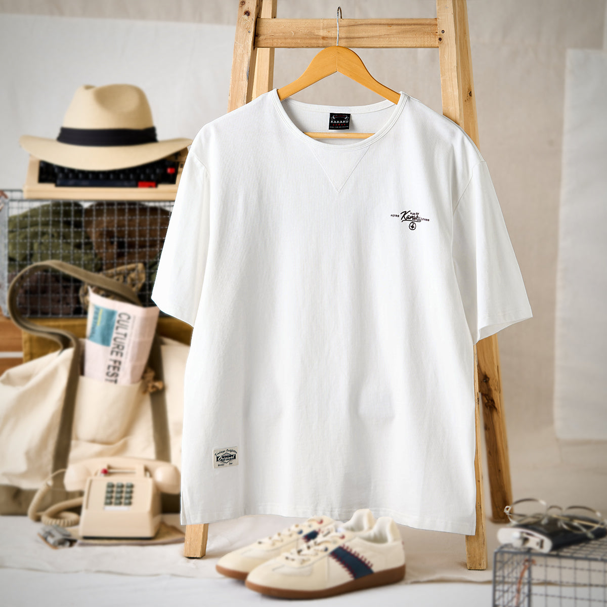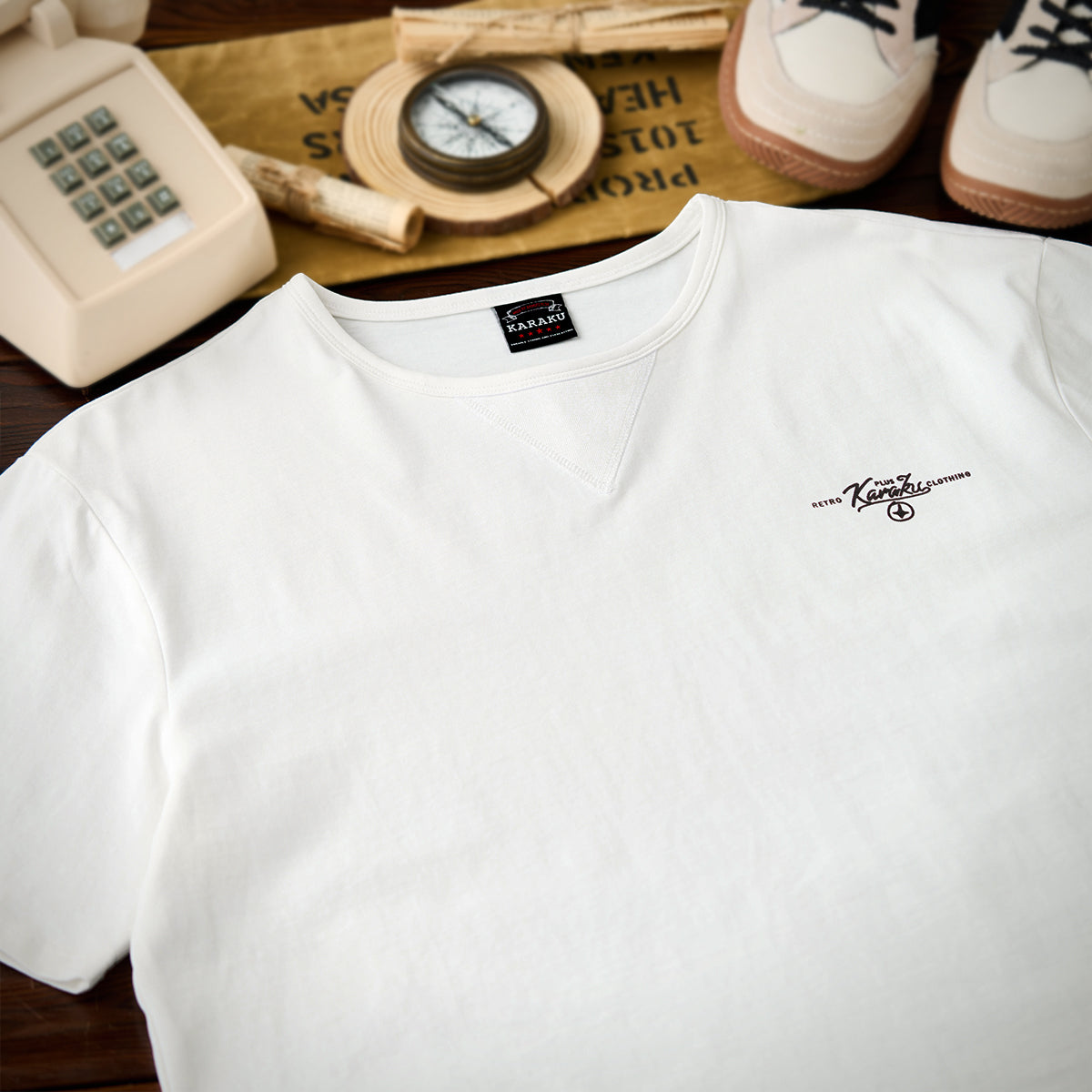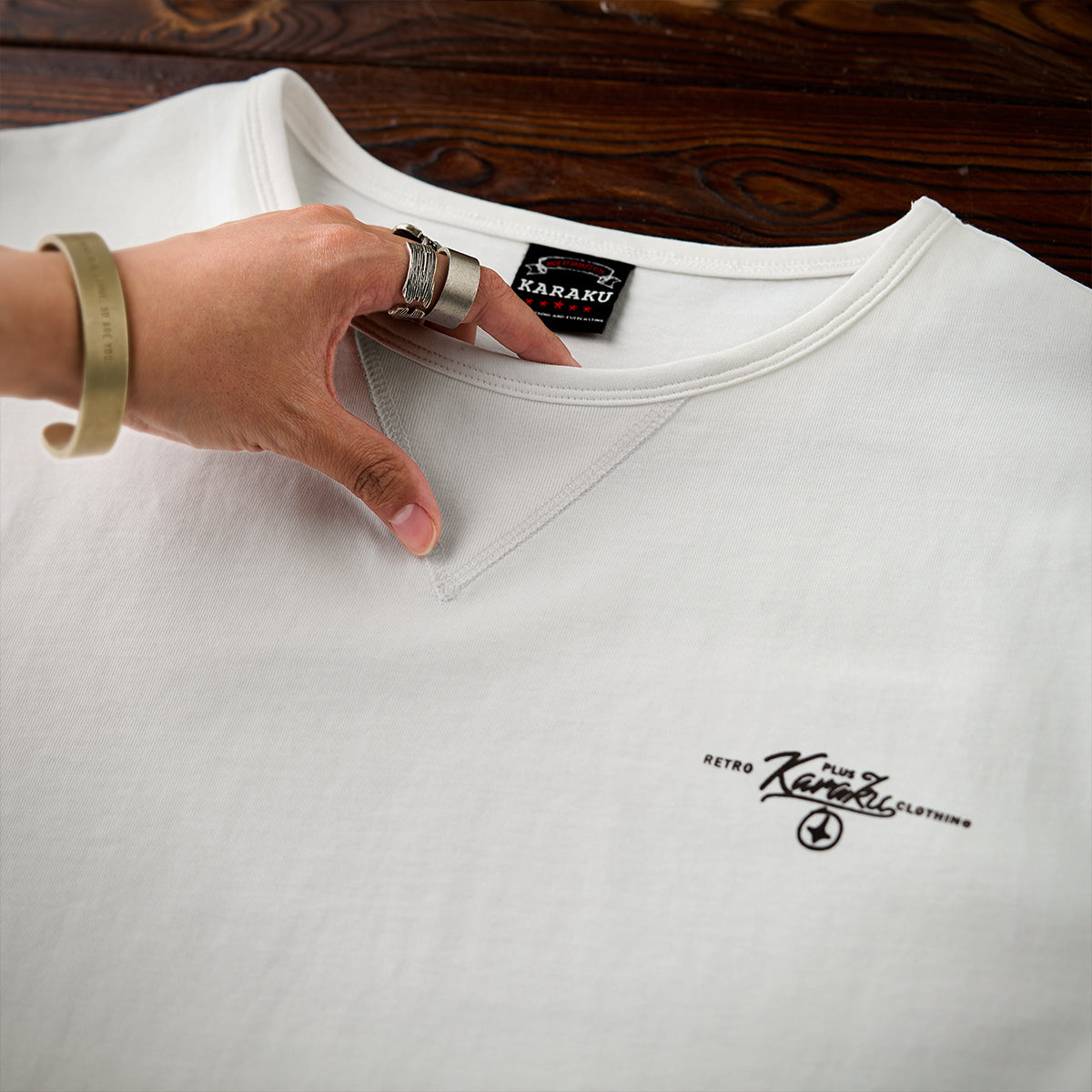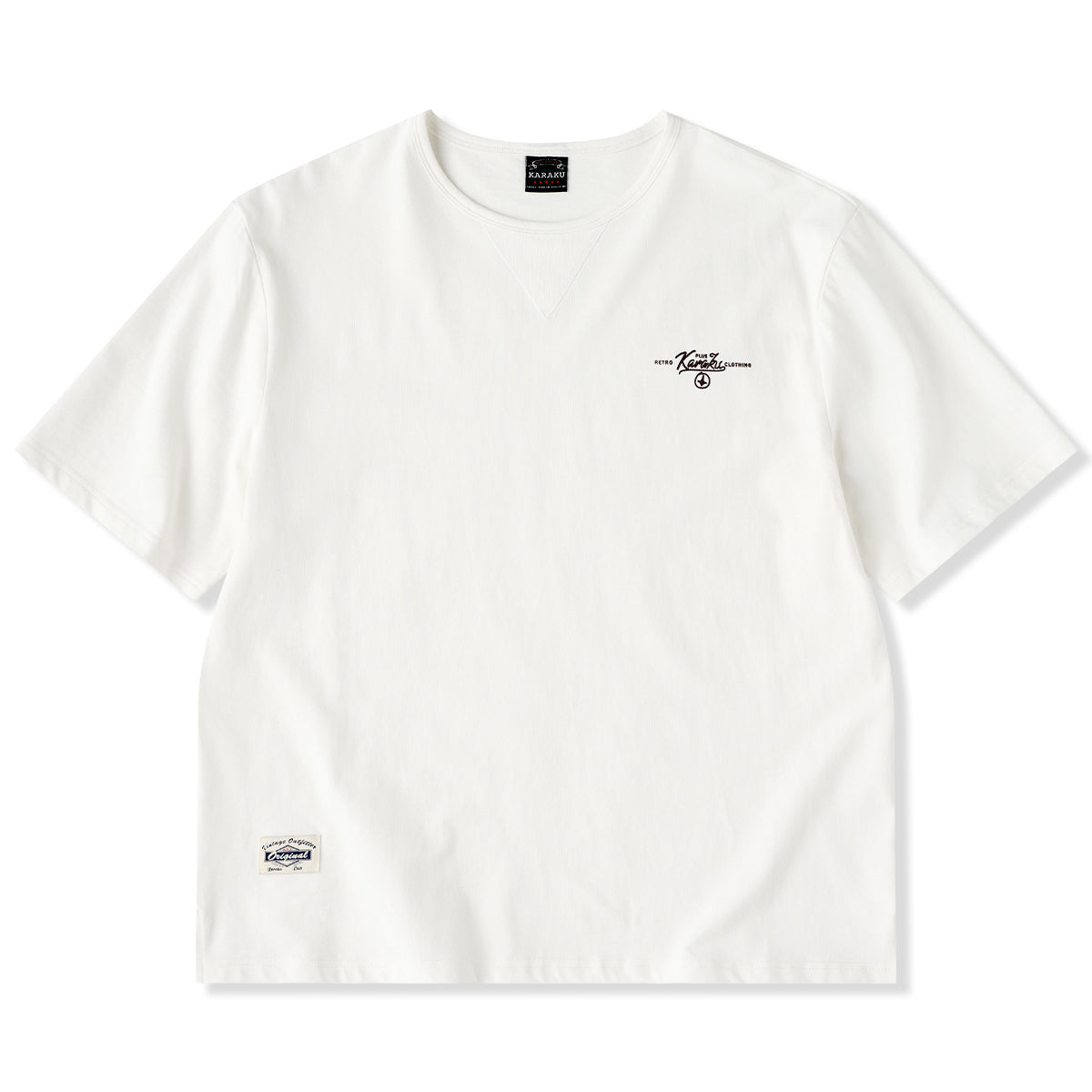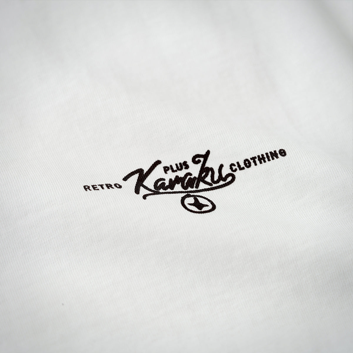 가슴에 'KARAKU PLUS RETRO CLOTHING' 필기체 프린트가 검정 잉크로 흰색 티셔츠와 강한 대비를 이루며, 하단 왼쪽 작은 브랜드 태그가 세련되게 아이덴티티를 강조합니다.