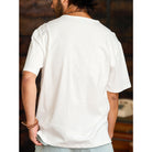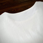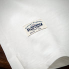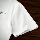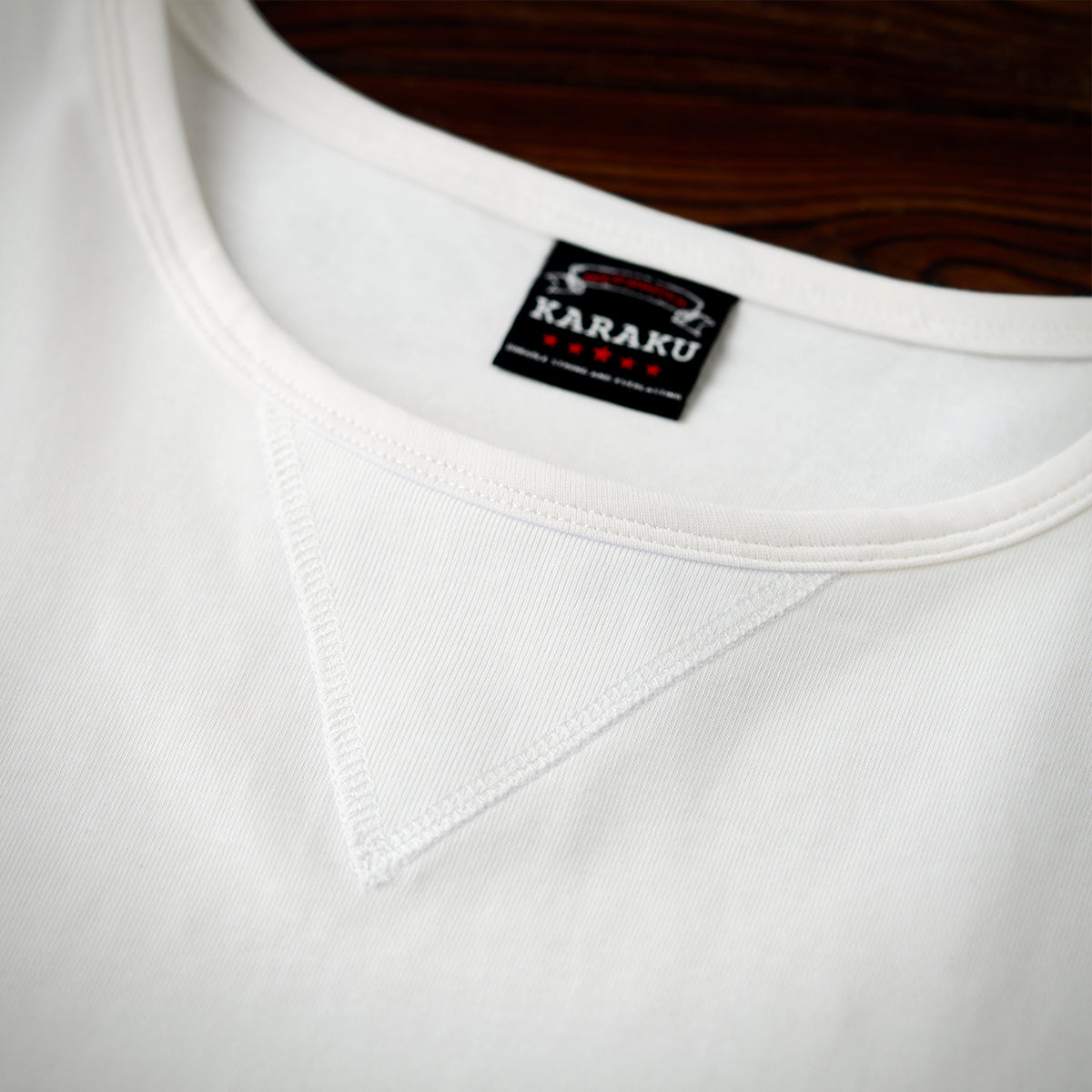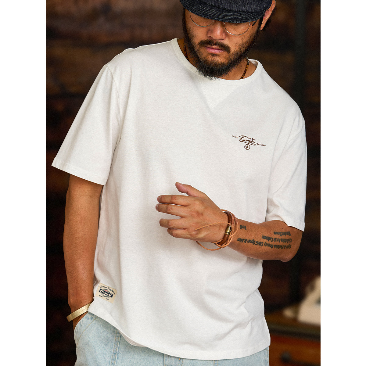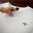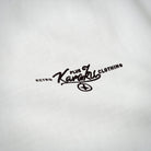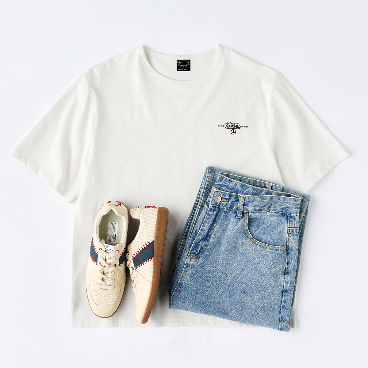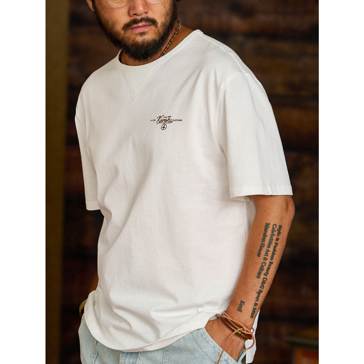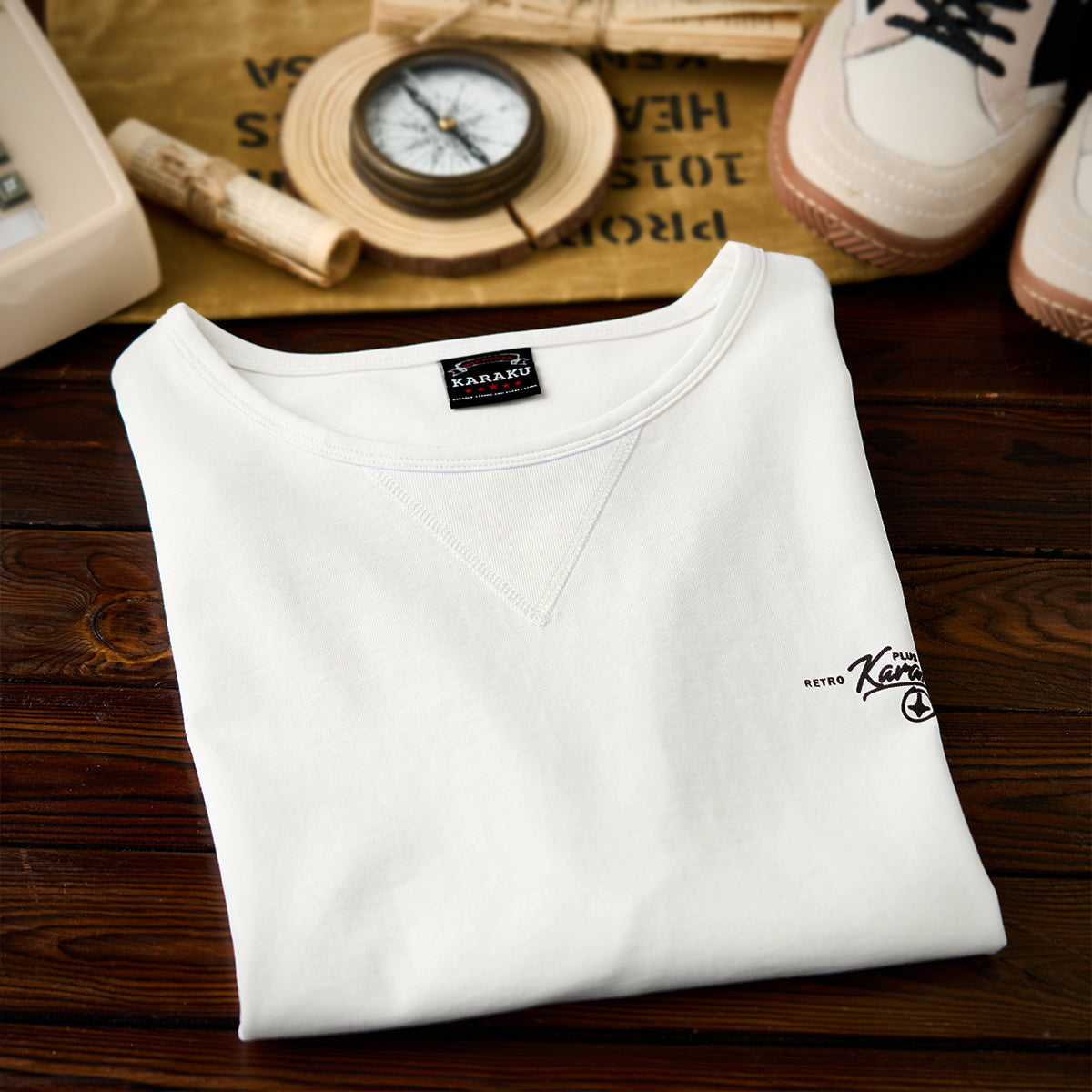 가슴에 'KARAKU PLUS RETRO CLOTHING' 필기체 프린트가 검정 잉크로 흰색 티셔츠와 강한 대비를 이루며, 하단 왼쪽 작은 브랜드 태그가 세련되게 아이덴티티를 강조합니다.