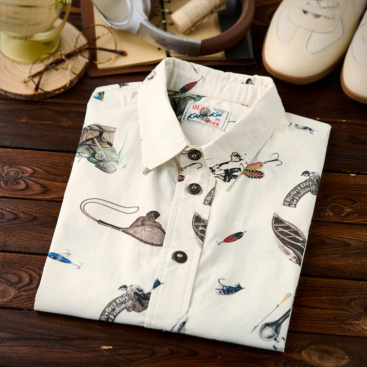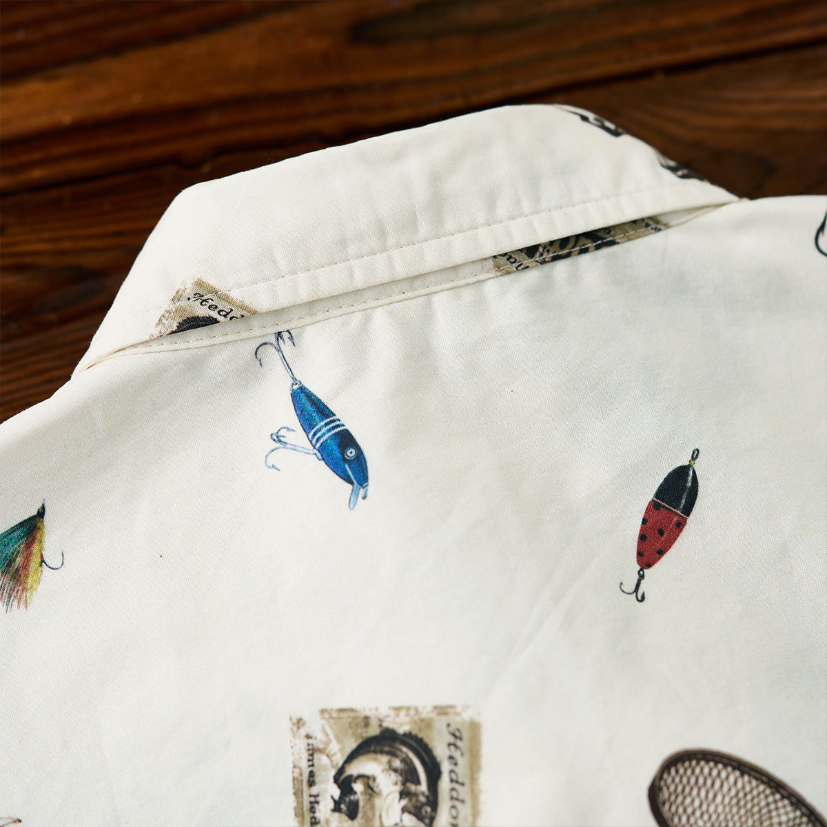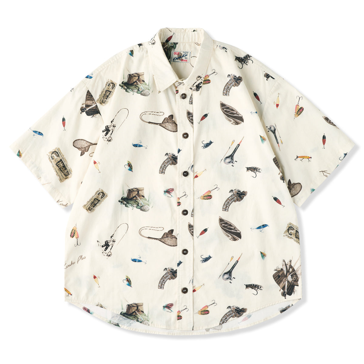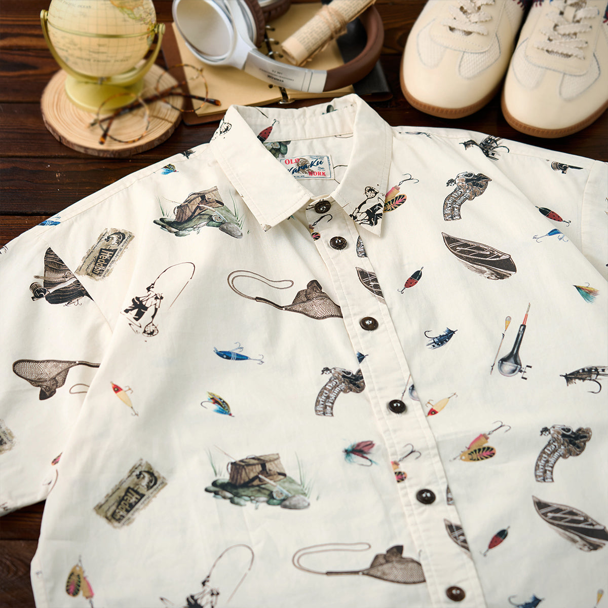 핸드드로잉 낚시도구 프린트 코튼 반팔 셔츠