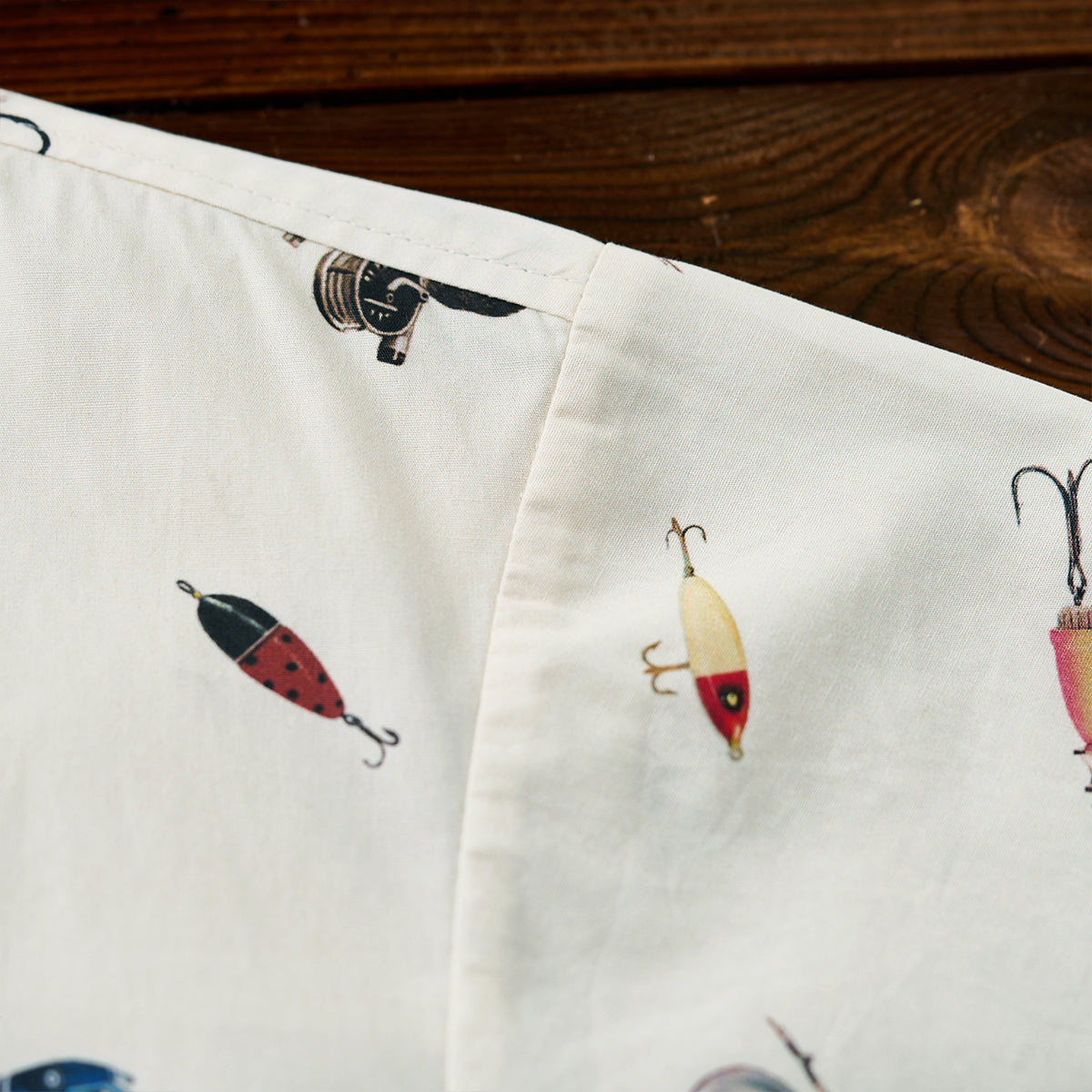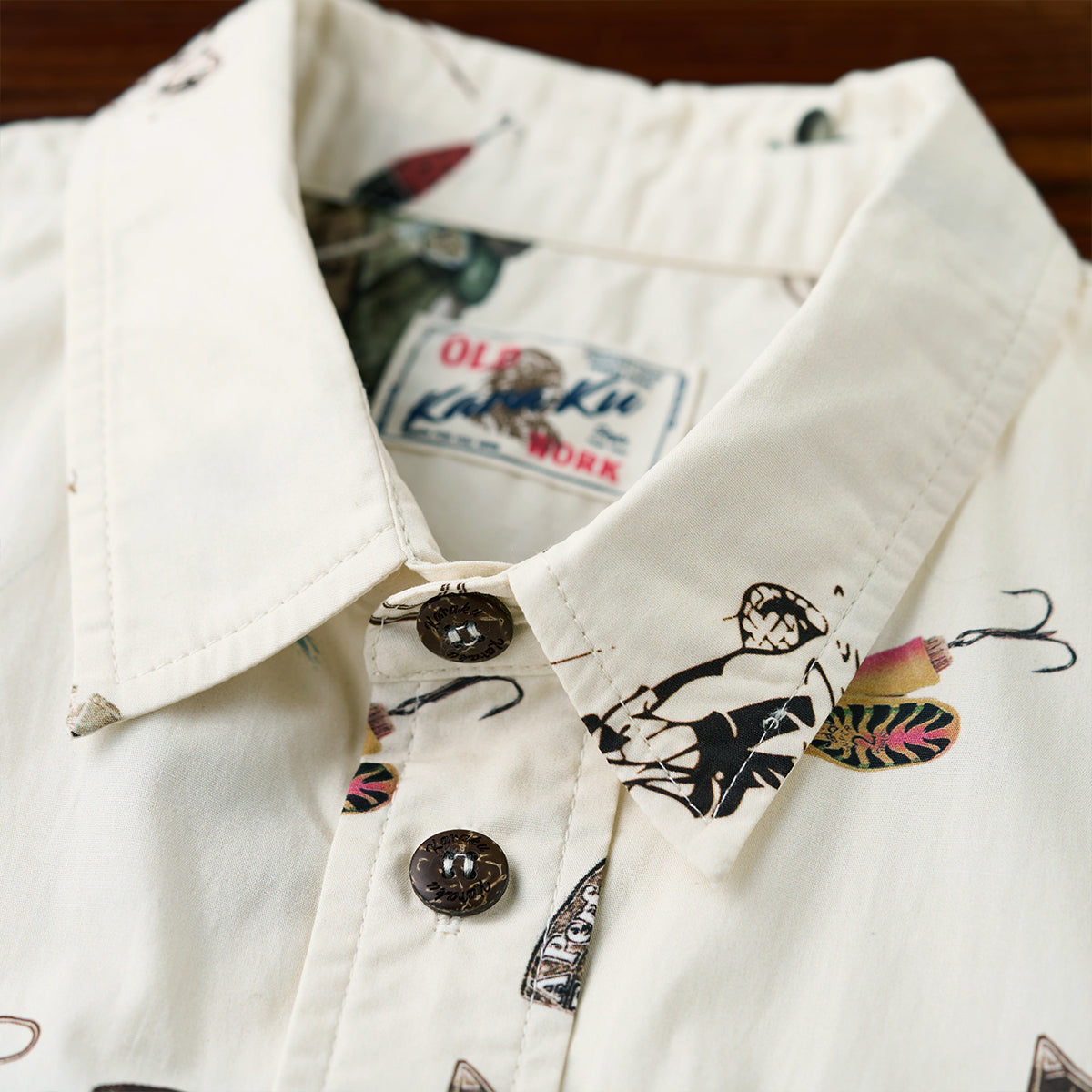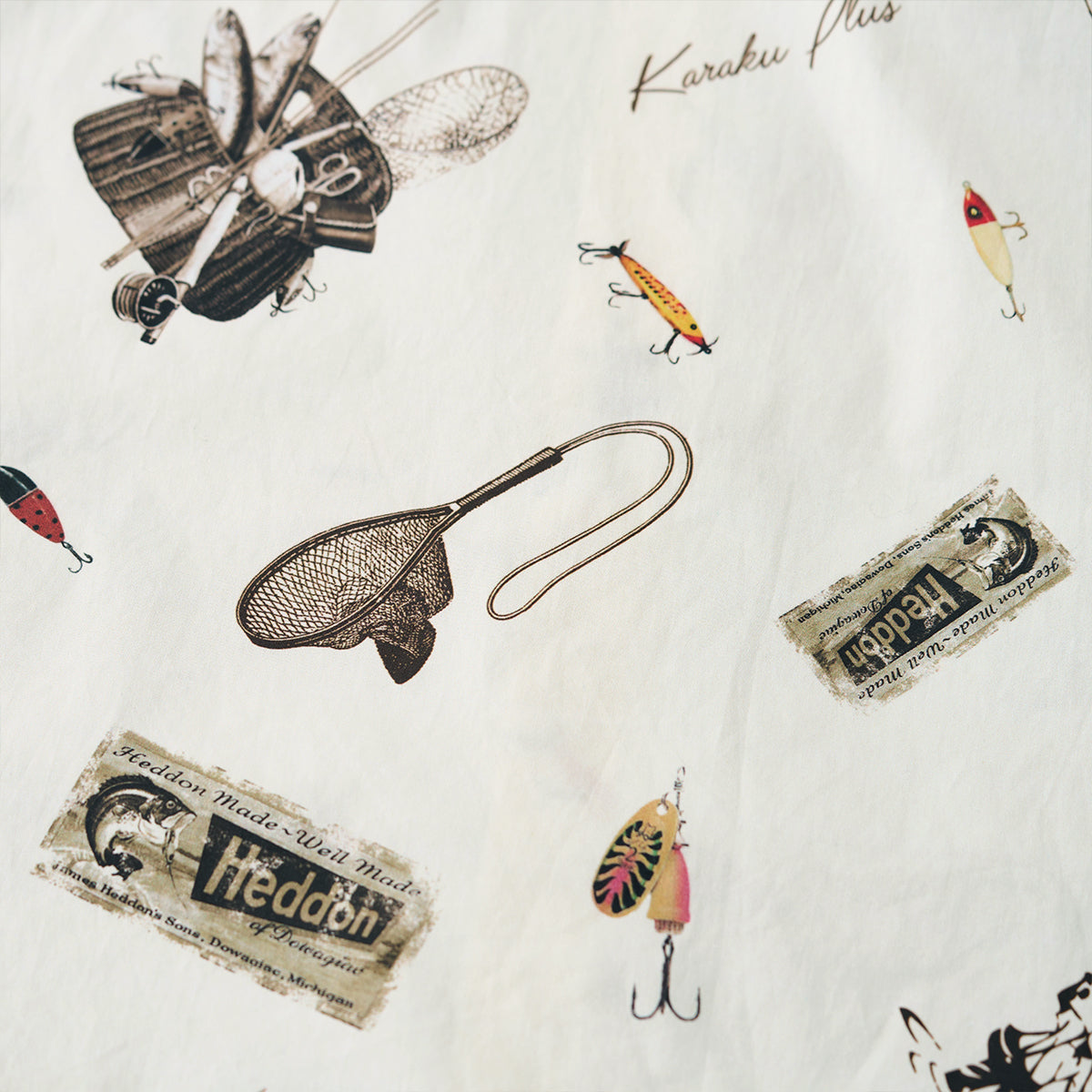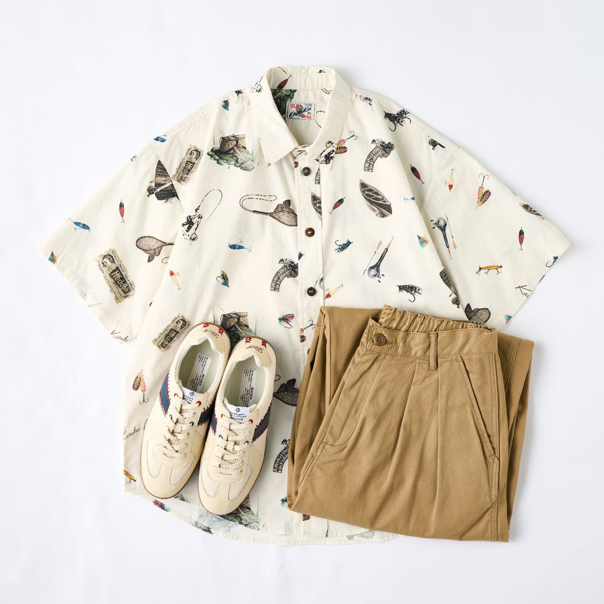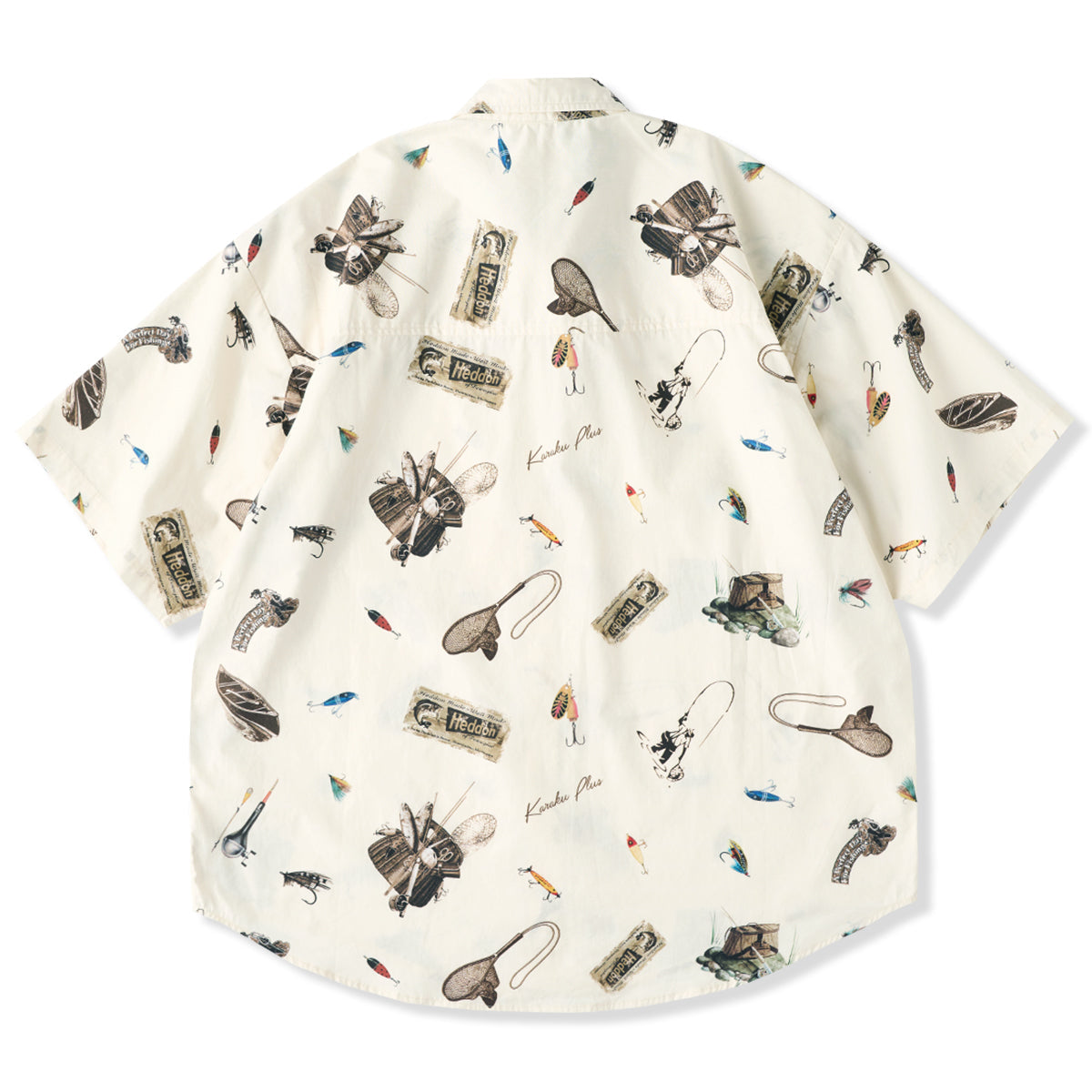 낚시를 테마로 한 루어, 낚싯대 등 모티프가 핸드드로잉 스타일로 그려진 유니크한 반소매 셔츠. 아웃도어 팬은 물론, 개성 있는 패턴을 선호하는 분께도 추천합니다.