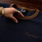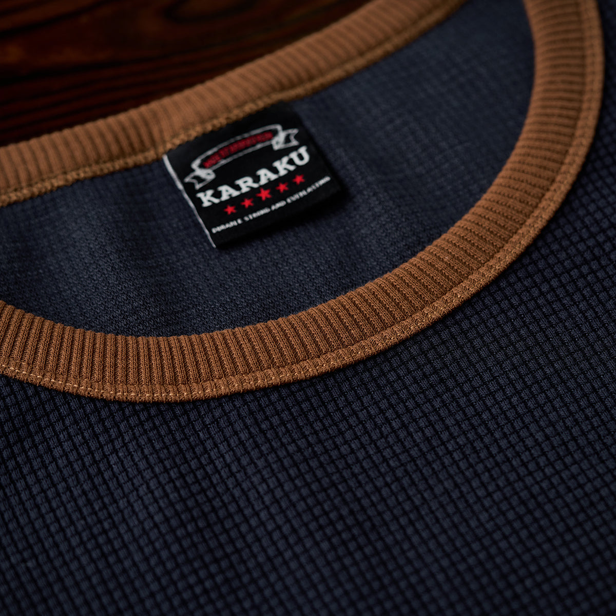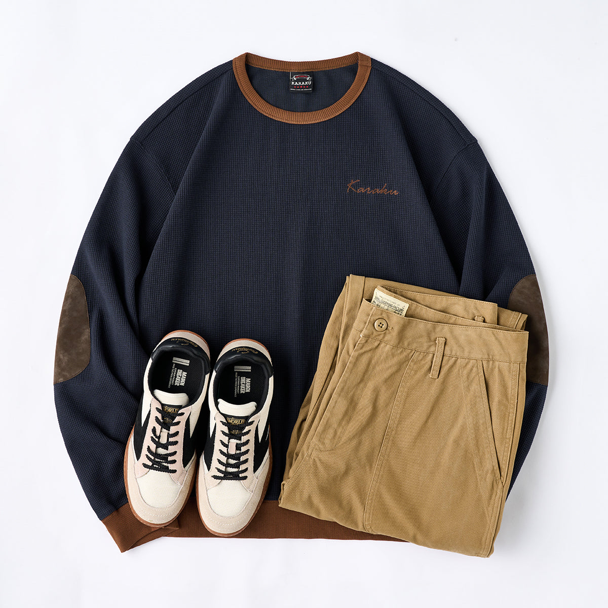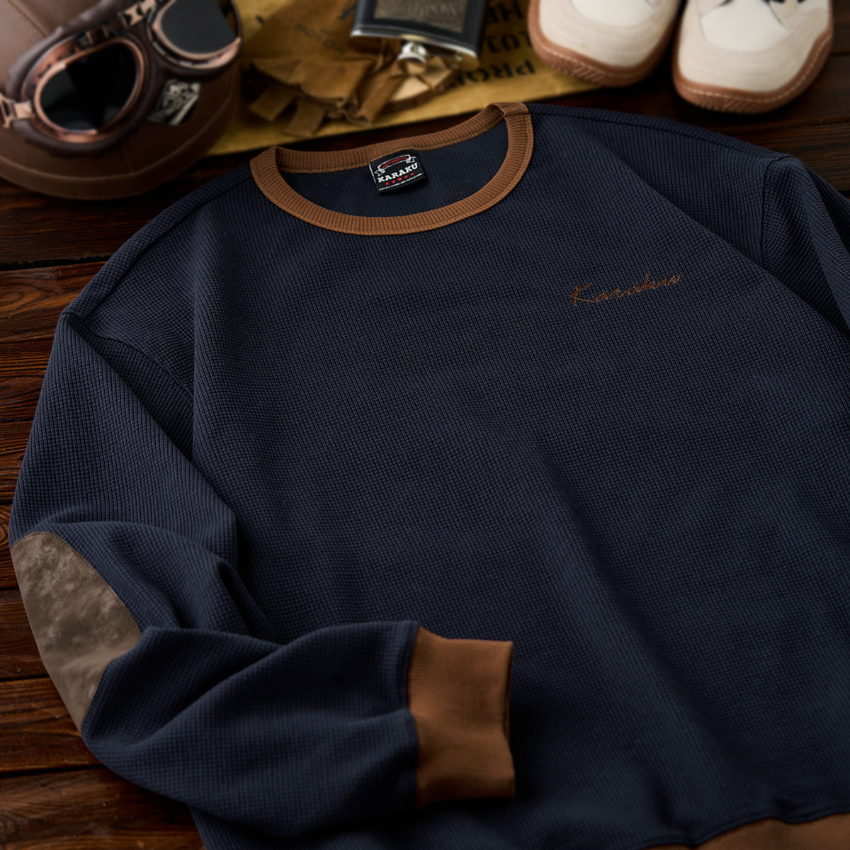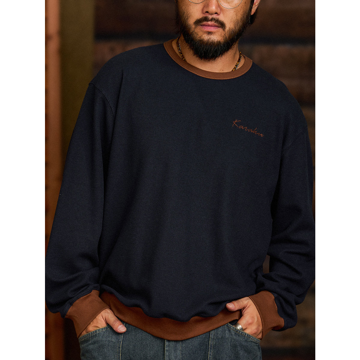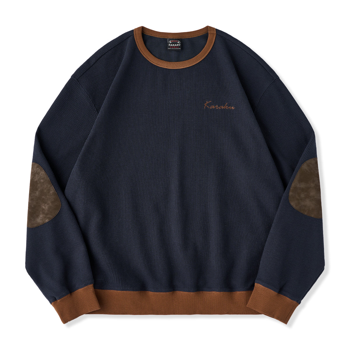 스웨이드 패치와 와플 조직이 특징인 풀오버 스웻셔츠로, 'KaraKu' 자수가 브랜드 개성을 더한 데일리 아이템입니다. 기본 실루엣으로 단독 착용 및 레이어드에 적합합니다.