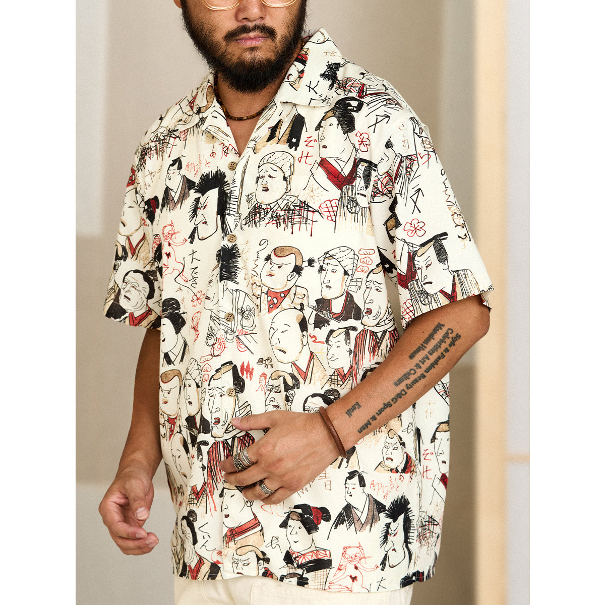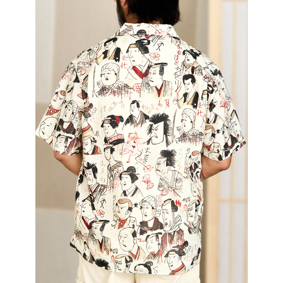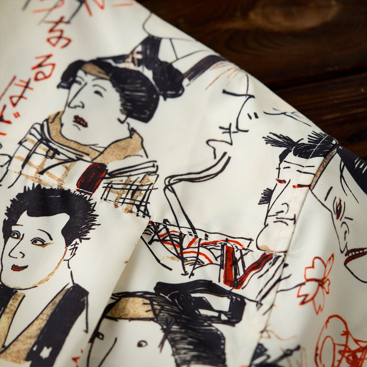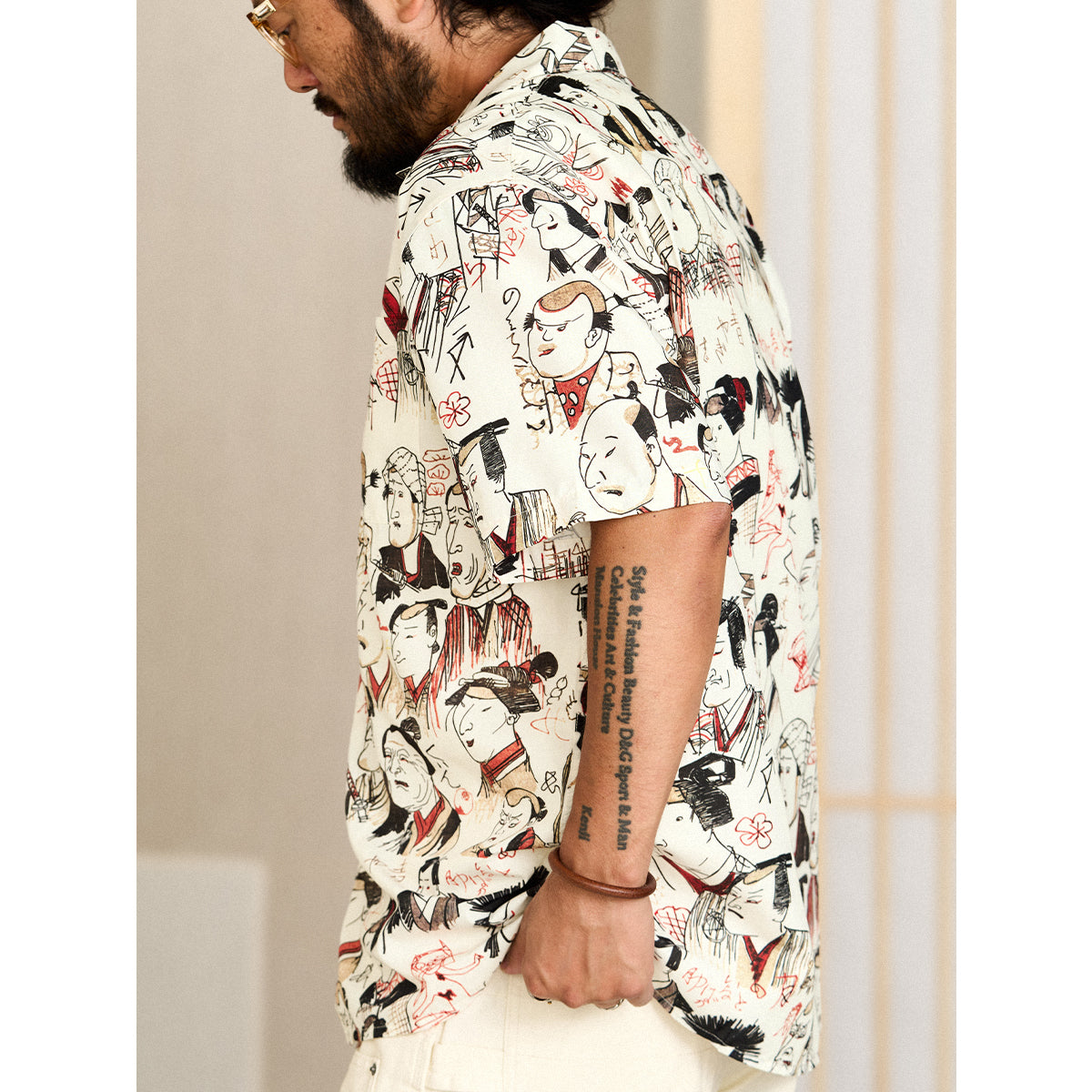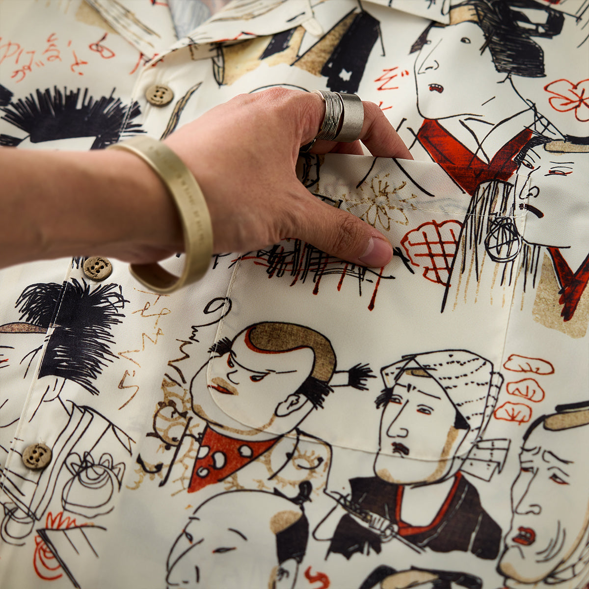 에도 시대 풍자화를 현대적으로 재해석한 위트 있고 감각적인 디자인의 오픈 칼라 셔츠로, 전통색과 부드러운 소재감이 어우러져 예술적이면서도 편안한 착용감을 선사합니다.