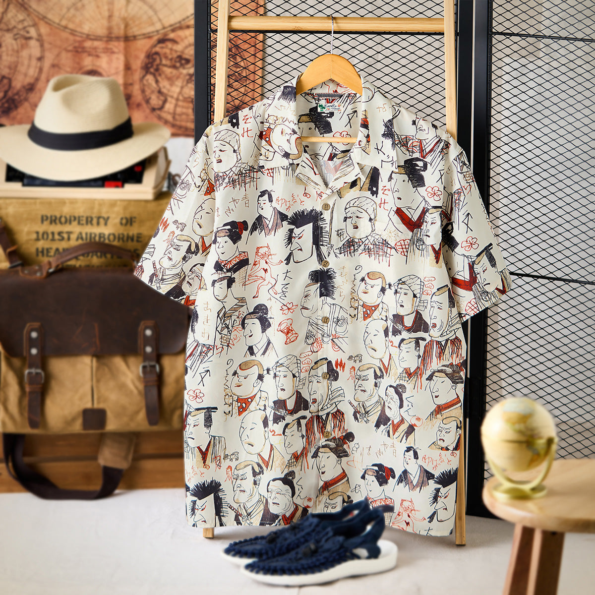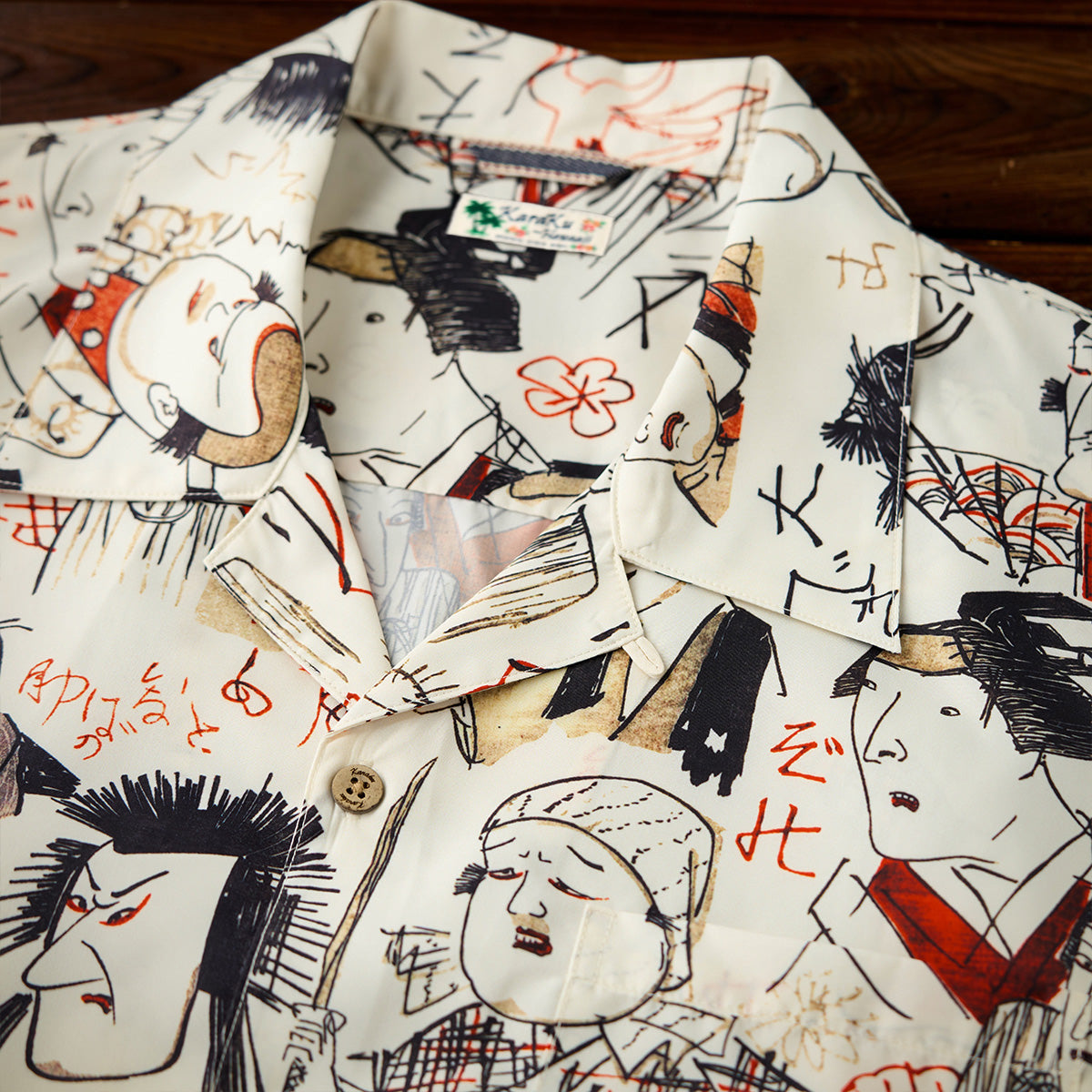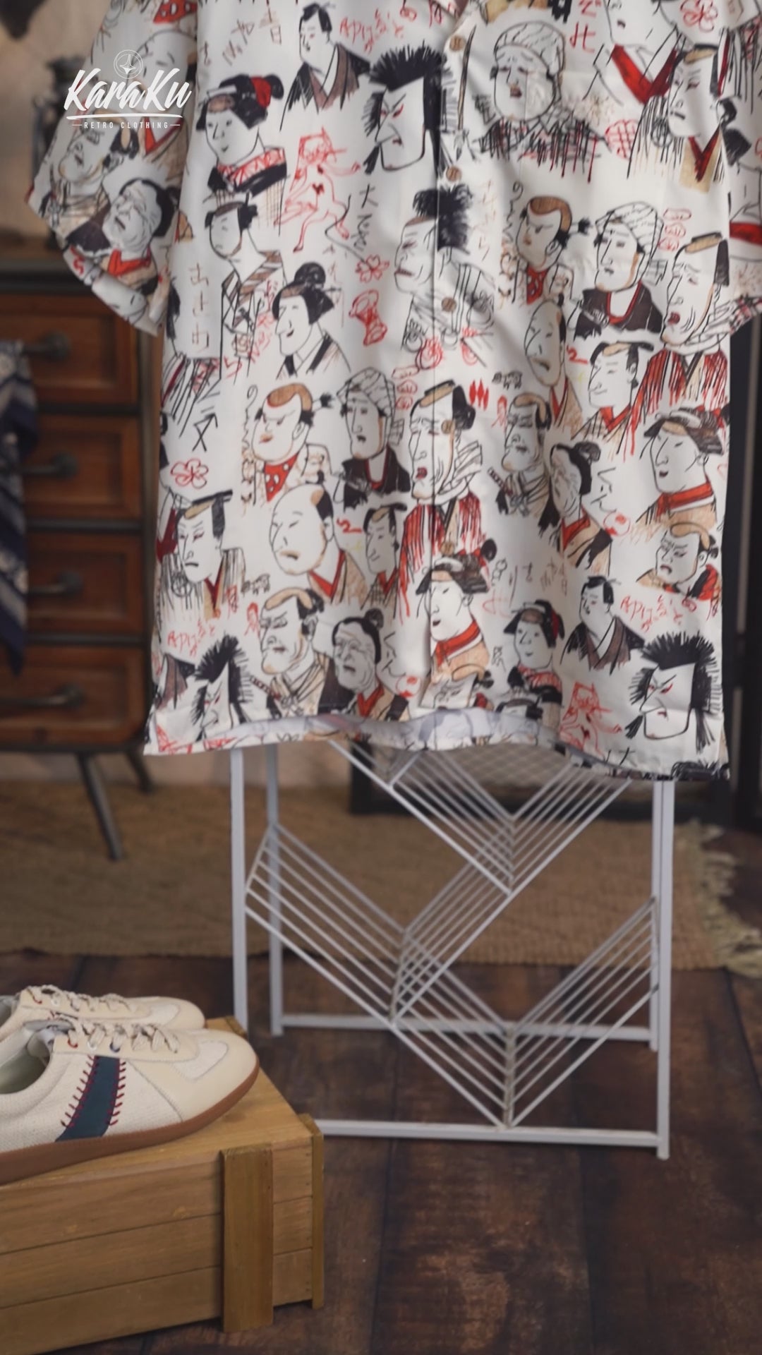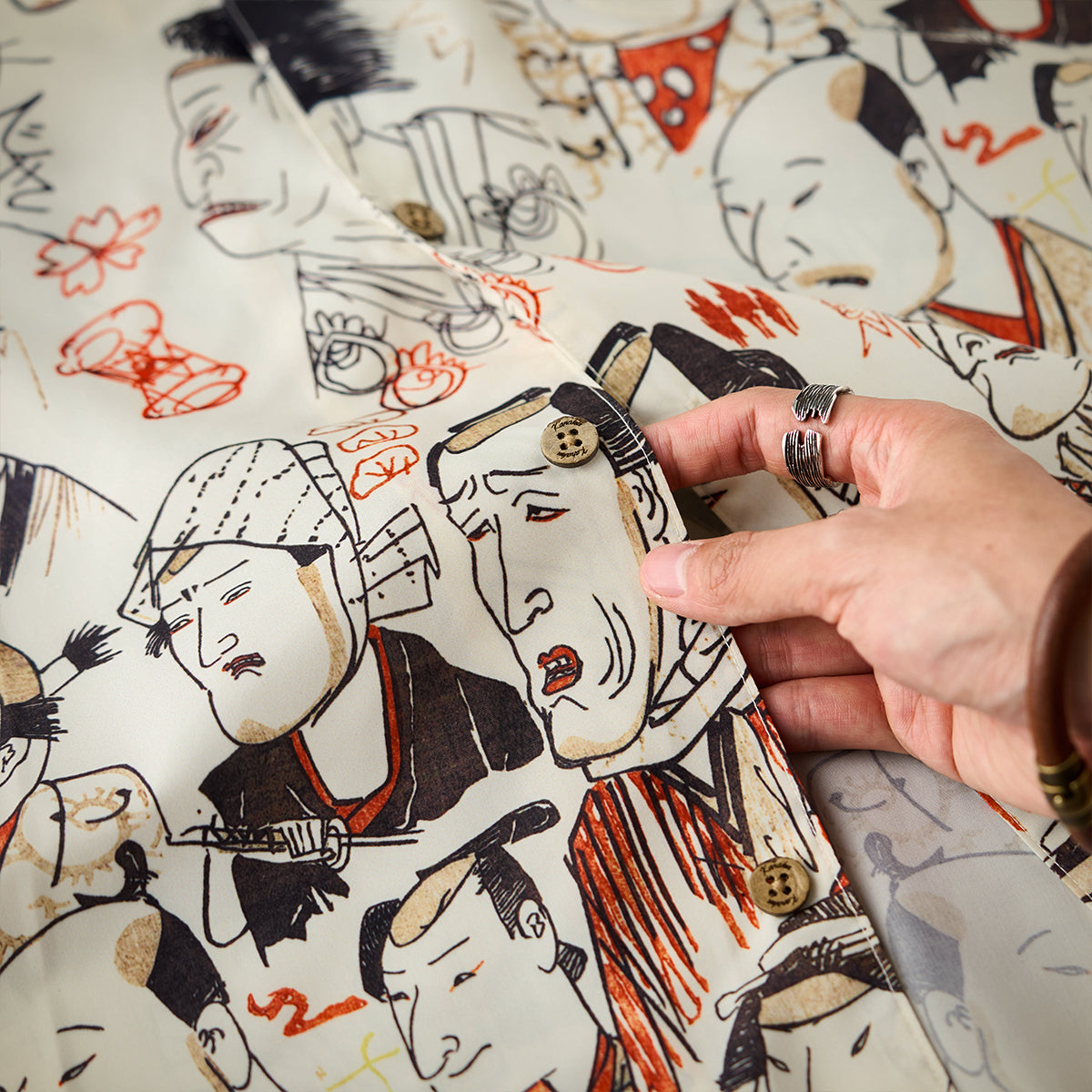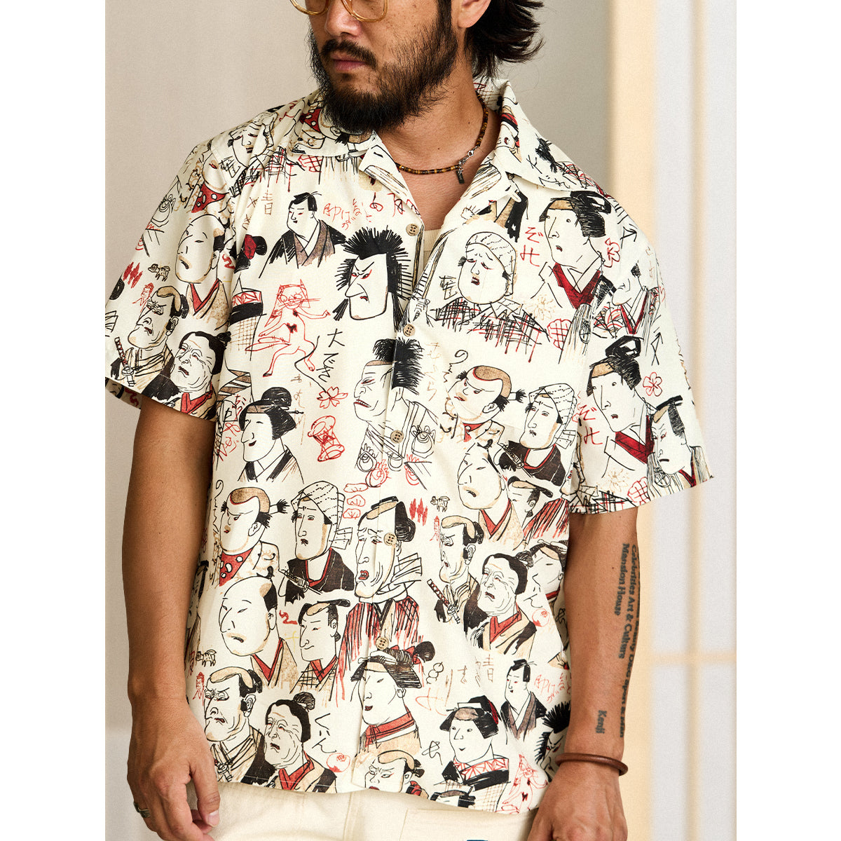 에도 시대 풍자화를 현대적으로 재해석한 위트 있고 감각적인 디자인의 오픈 칼라 셔츠로, 전통색과 부드러운 소재감이 어우러져 예술적이면서도 편안한 착용감을 선사합니다.