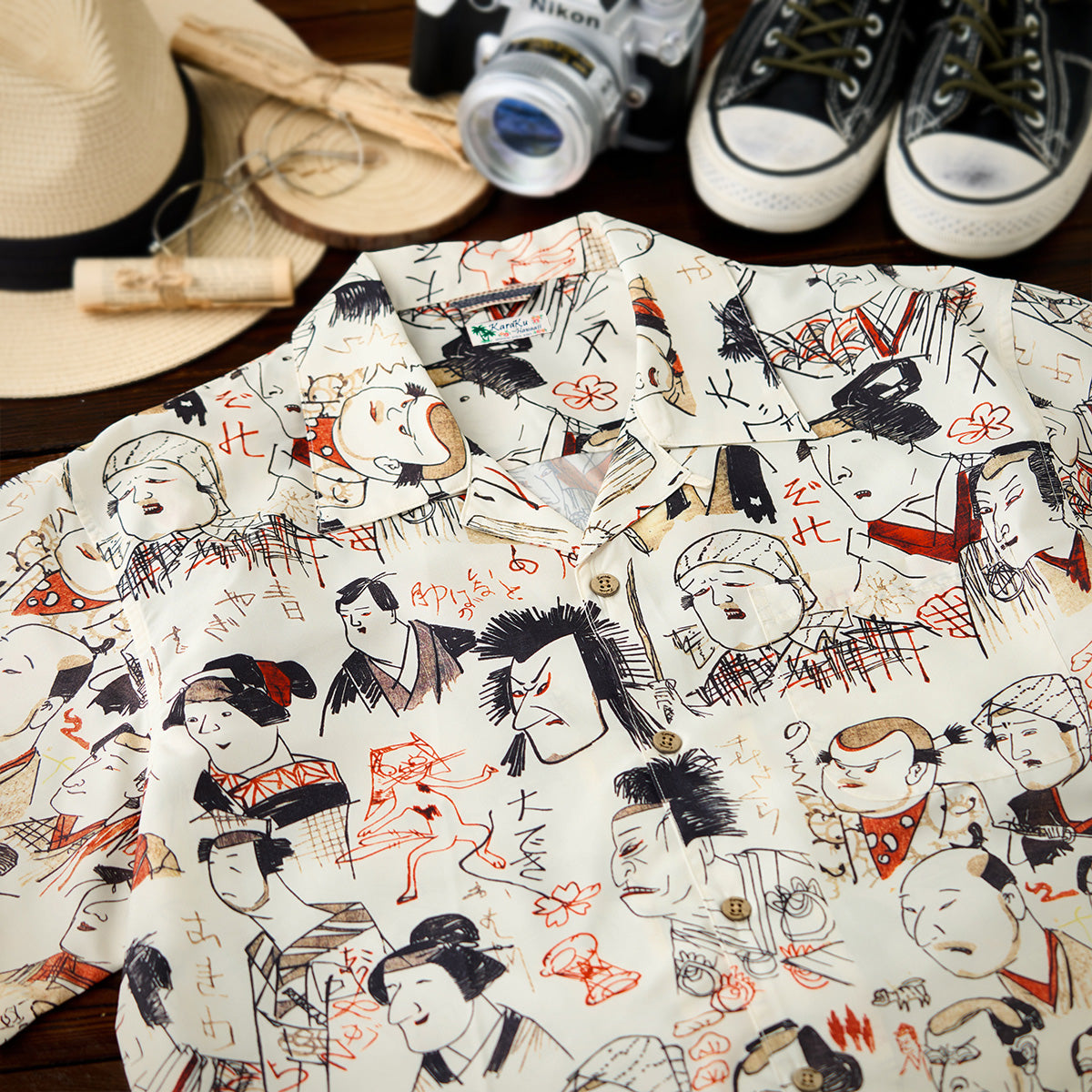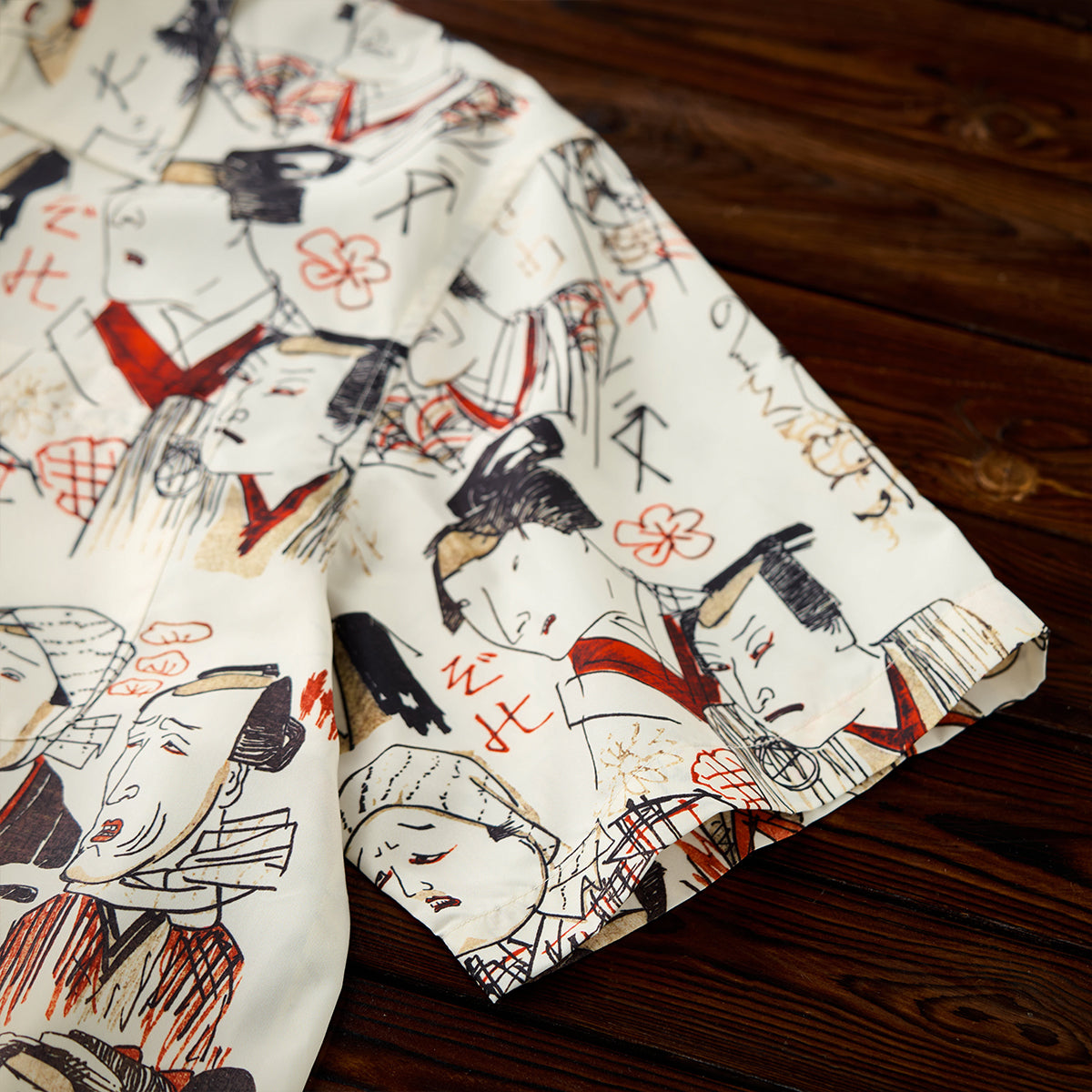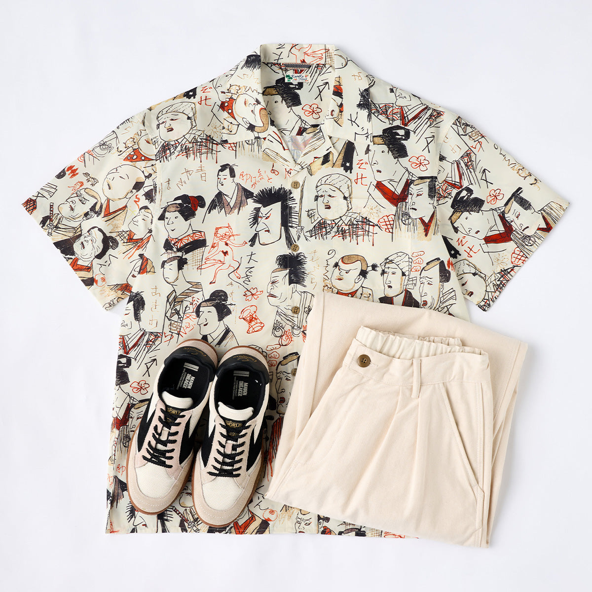 우키요에에서 사용되던 전통적인 색감을 현대적인 알로하 셔츠에 감각적으로 믹스하여, 능숙한 배색이 돋보입니다. 스트리트 패션이나 모드 스타일과도 잘 어울려 다양한 스타일링이 가능합니다.