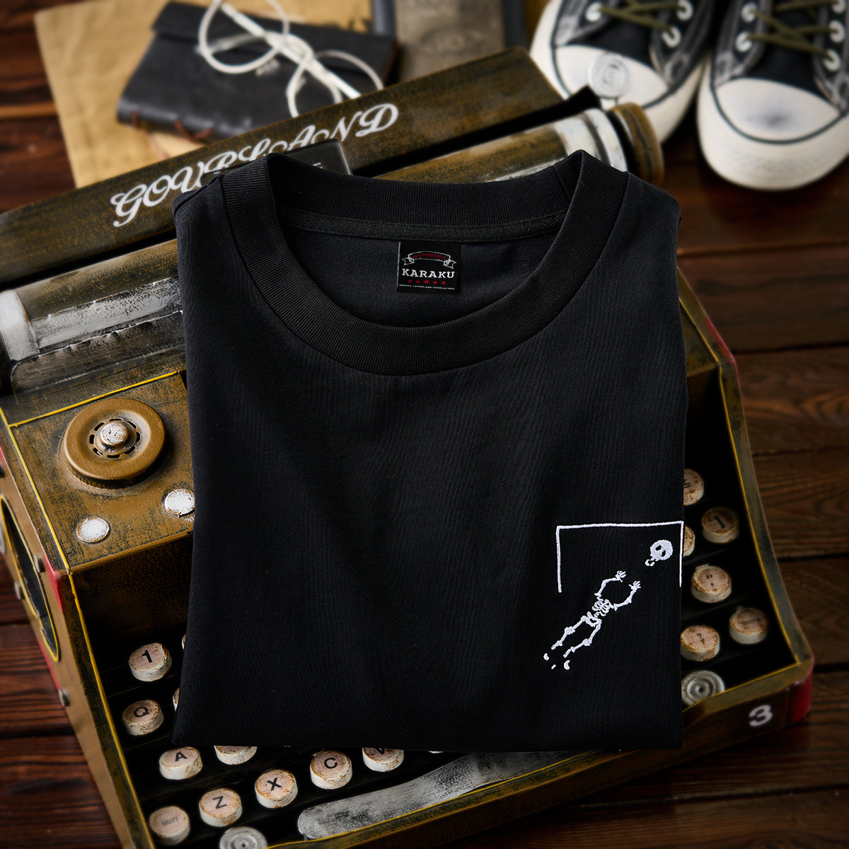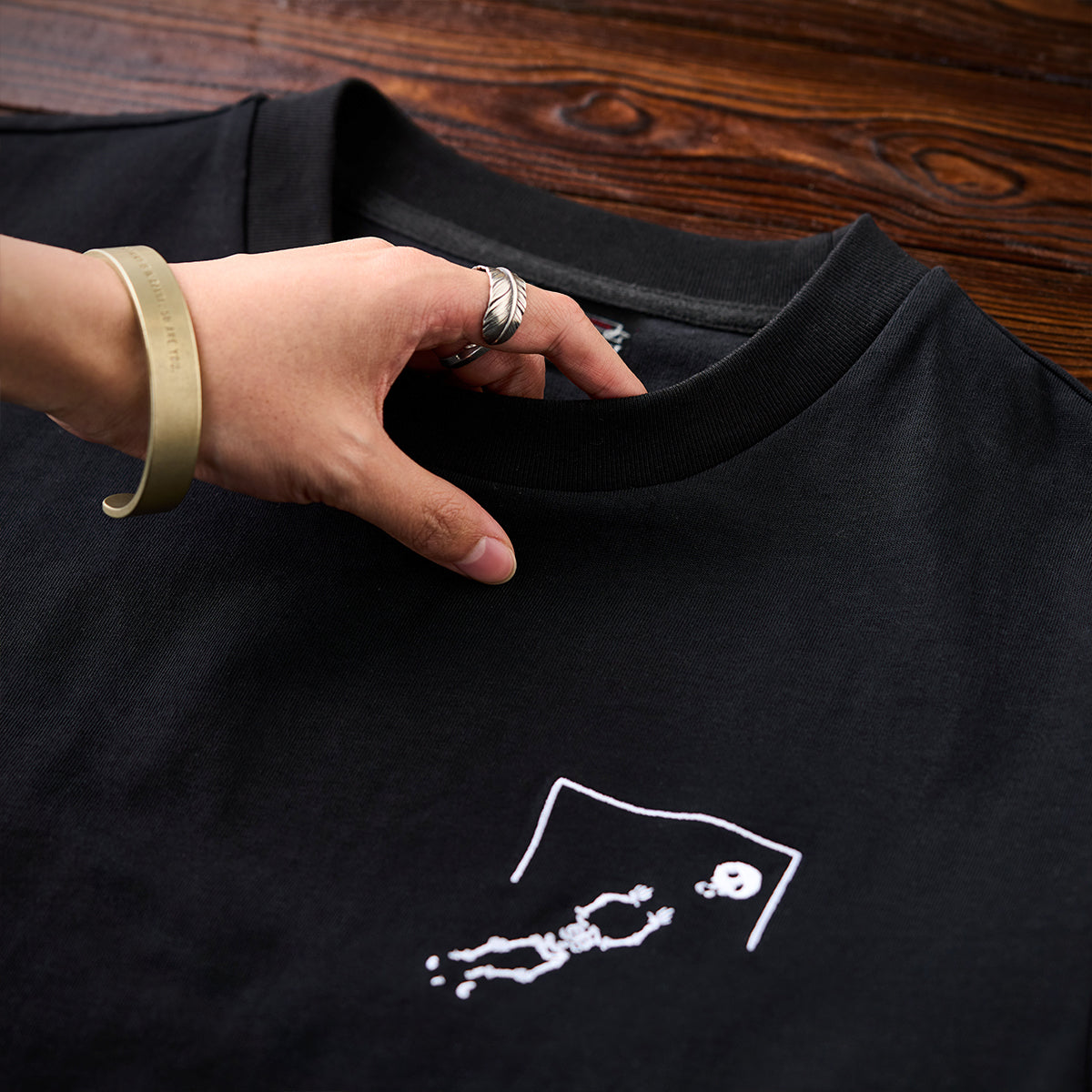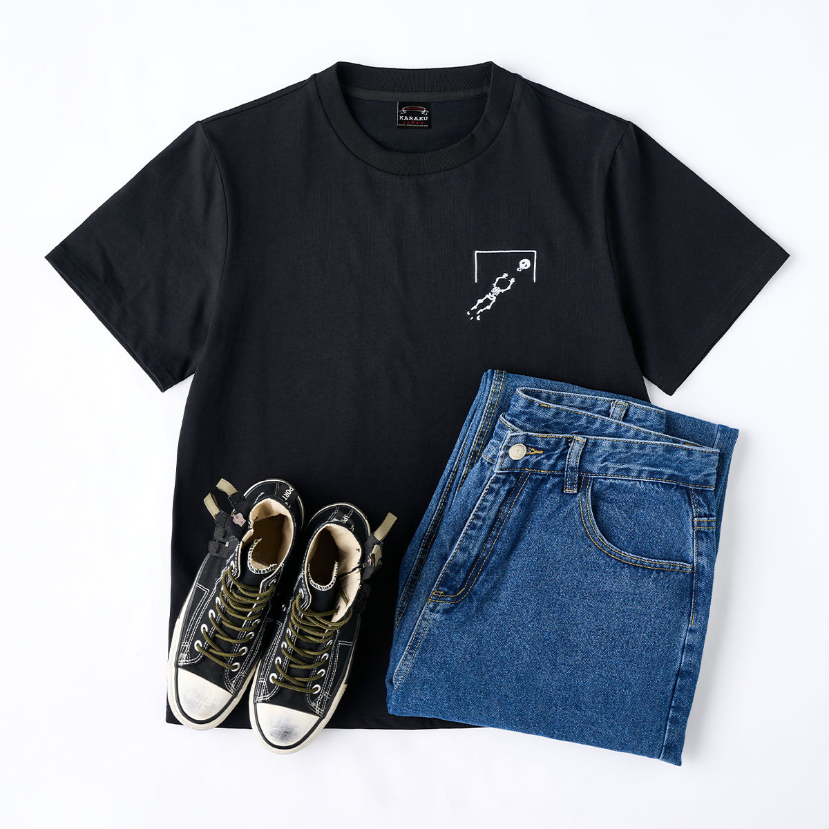 '죽음과의 대결'을 상징하는 골키퍼와 다크서클 축구공을 통해 인생의 투쟁을 표현하며, 코튼 소재로 편안하면서도 스타일리시한 코디를 완성하는 아이템입니다.