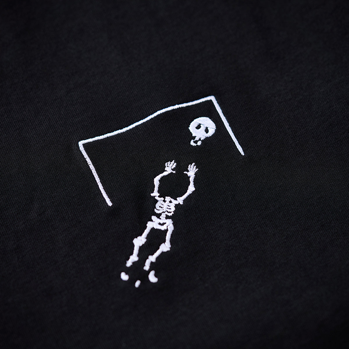 양손을 들고 점프하는 스켈레톤의 포즈는 골키퍼 특유의 다이빙 세이브를 연상시킵니다. 뼈로만 이루어진 모습이 아이러니하면서도, 목숨을 걸고 공을 막으려는 강한 의지를 상징적으로 표현합니다.