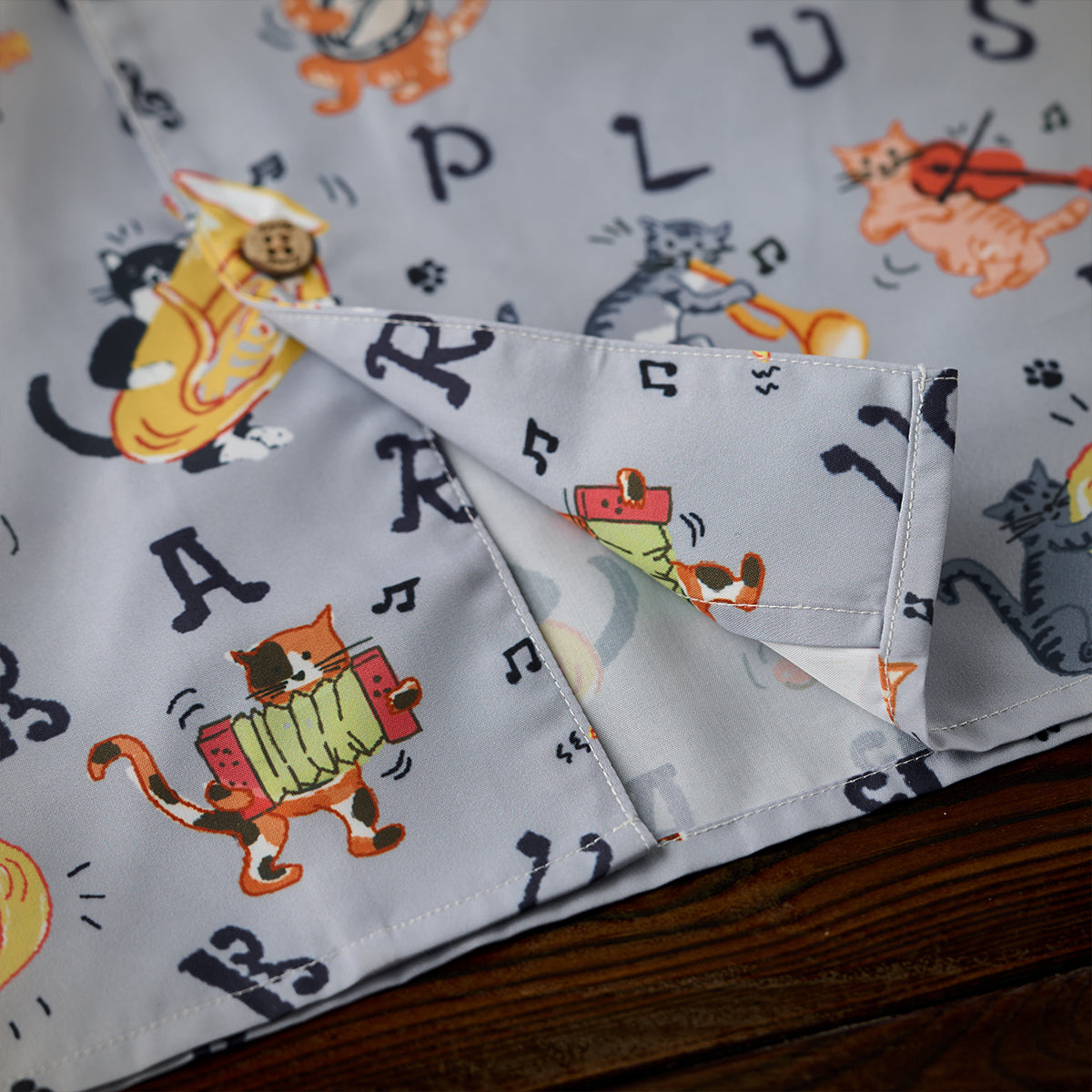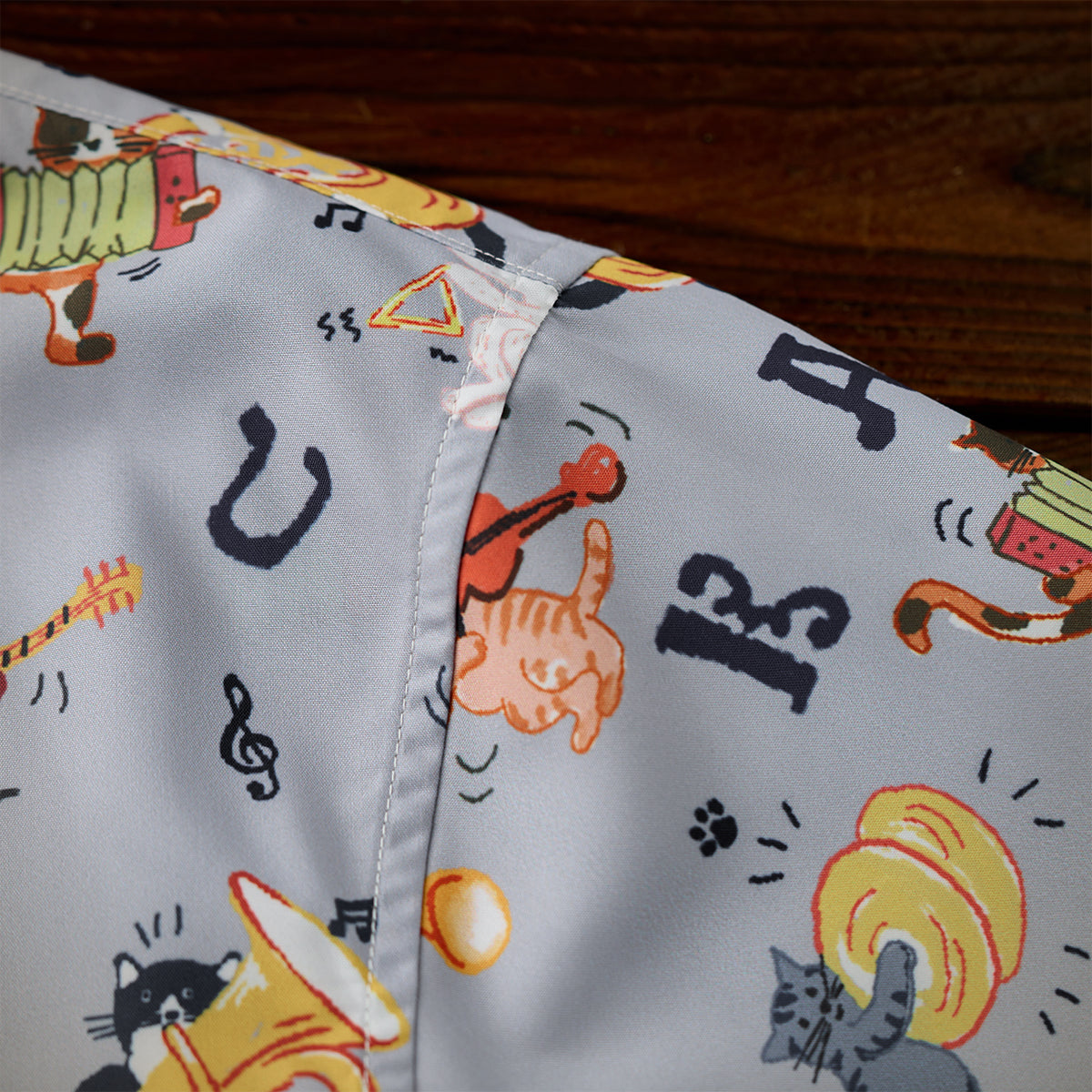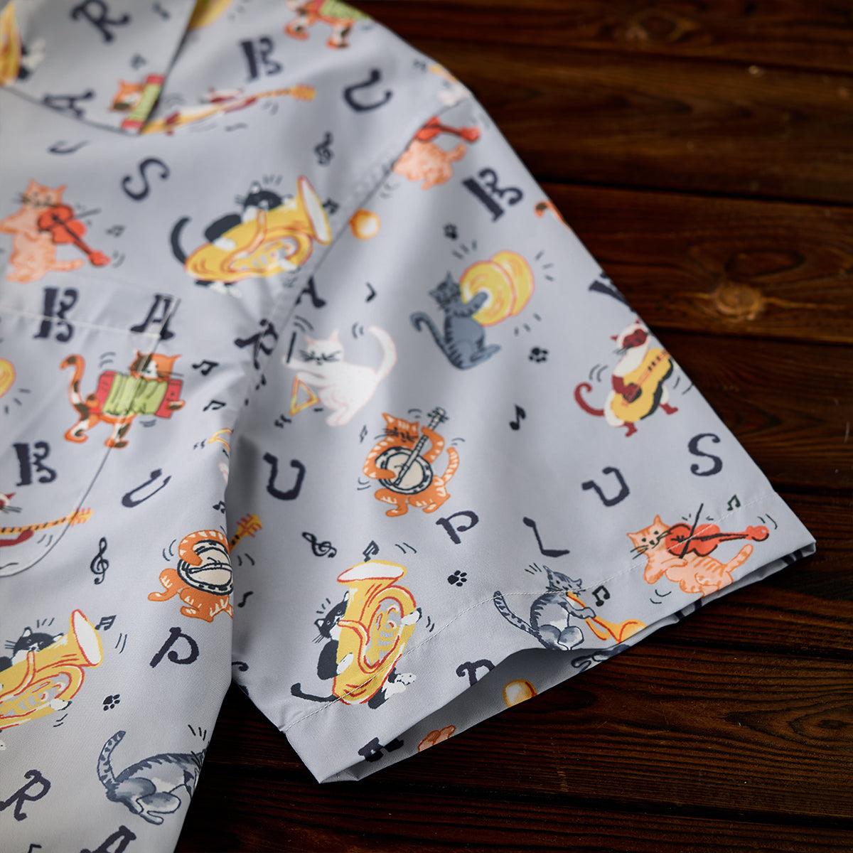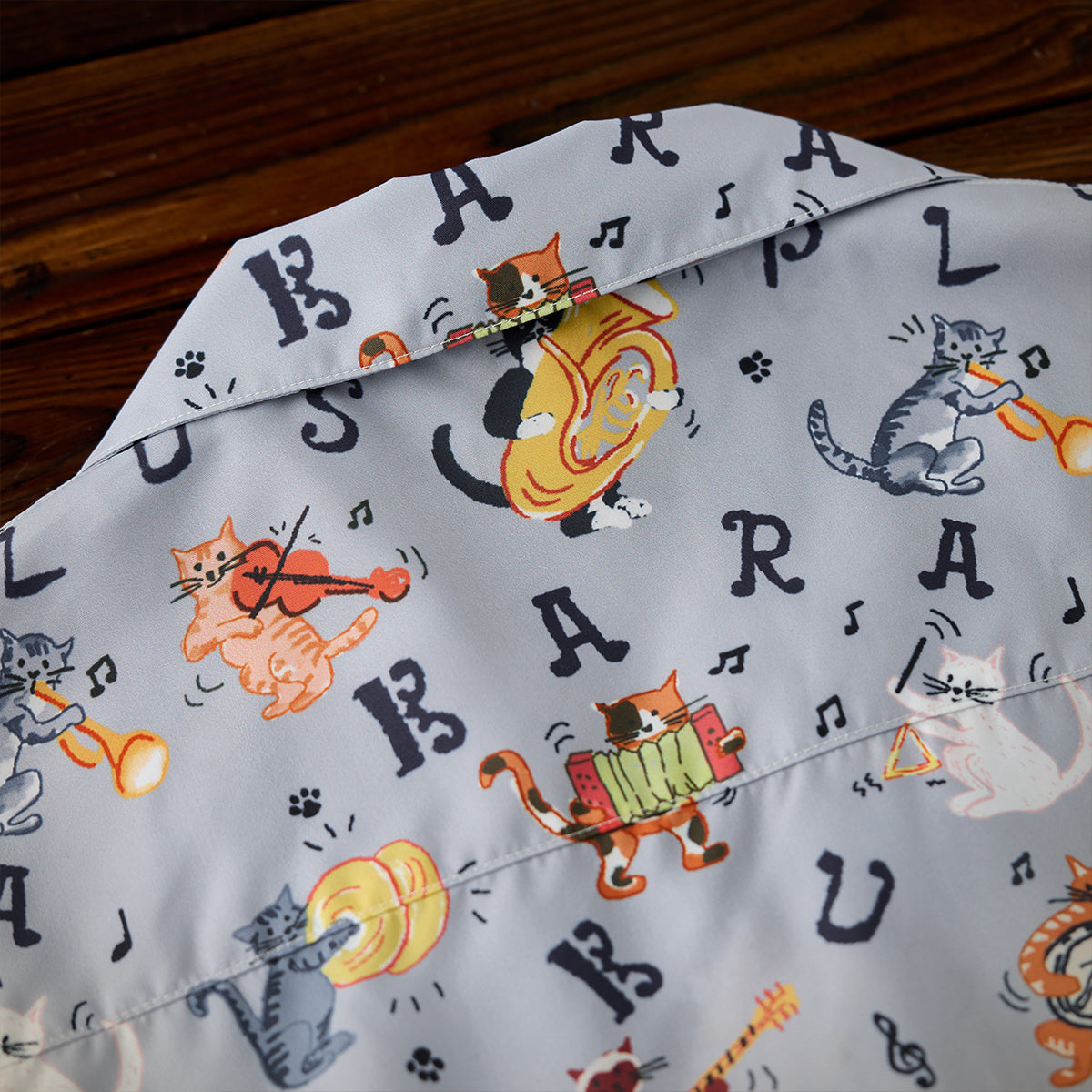 「고양이 음악가의 연주회」패턴 오픈칼라 셔츠