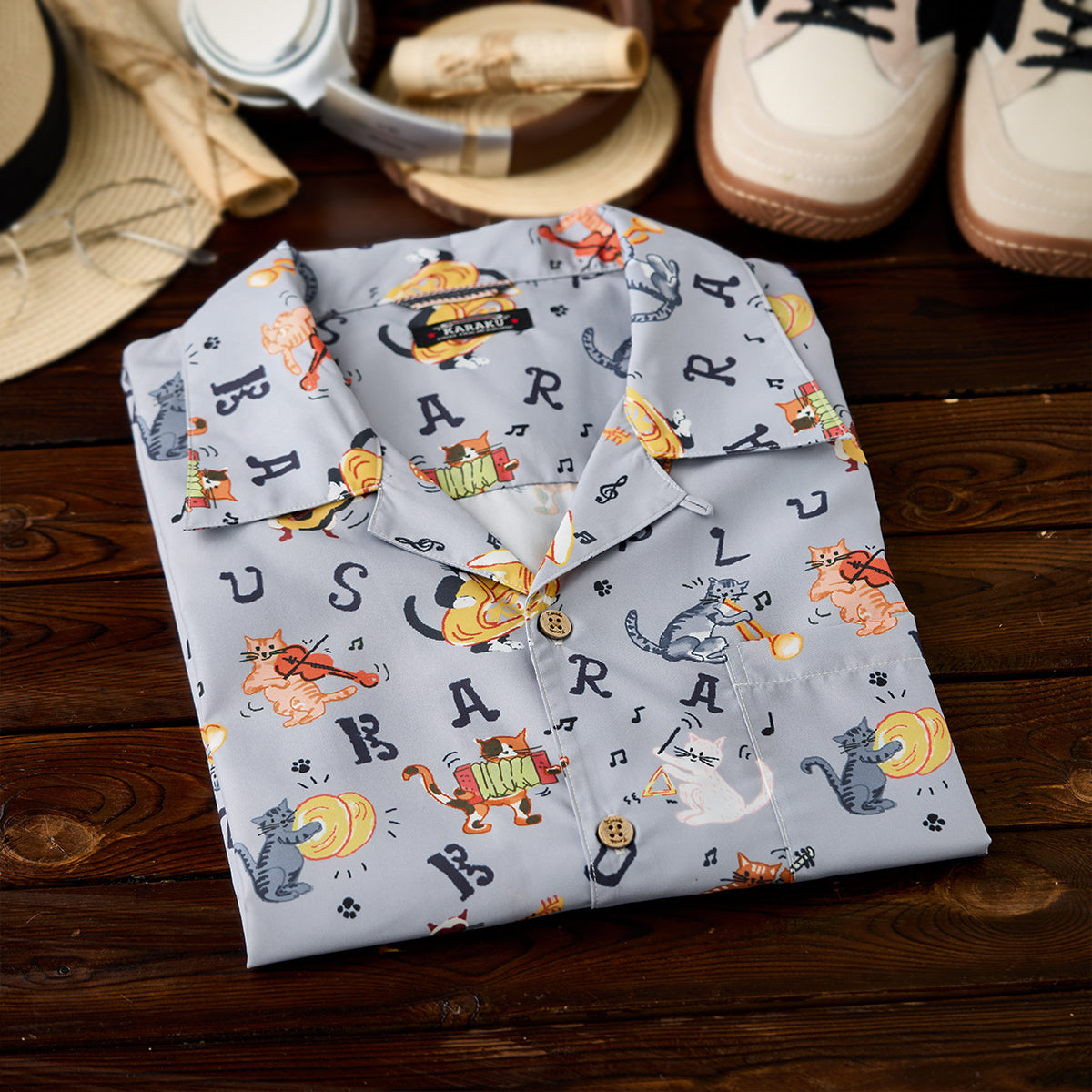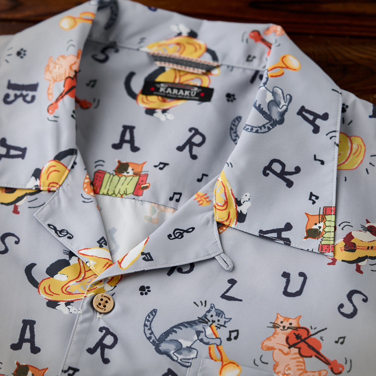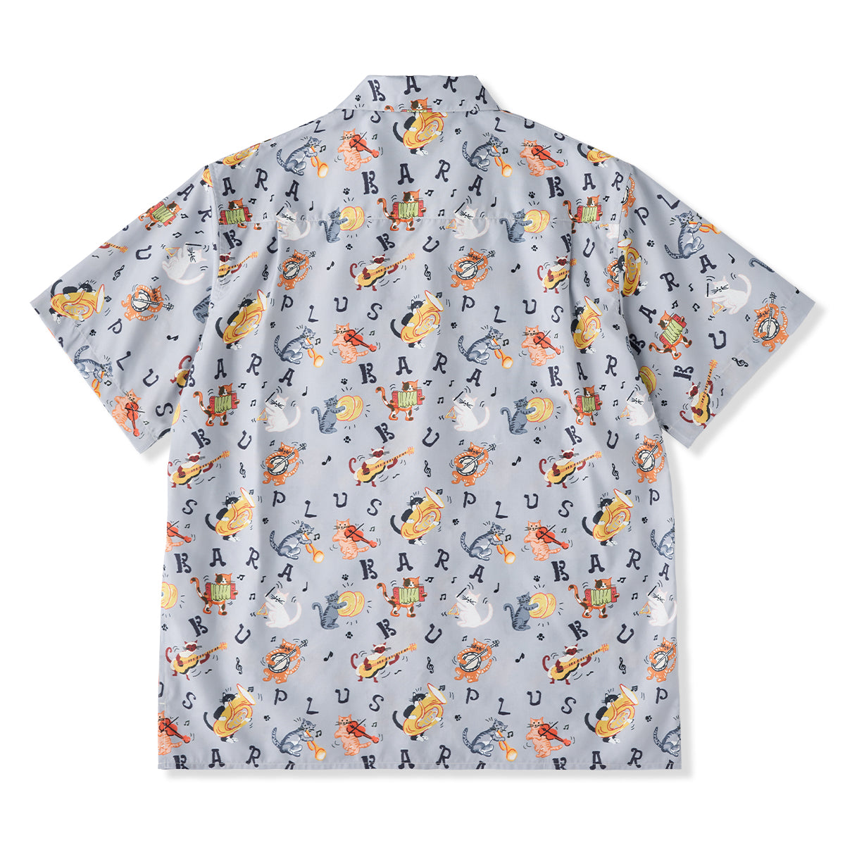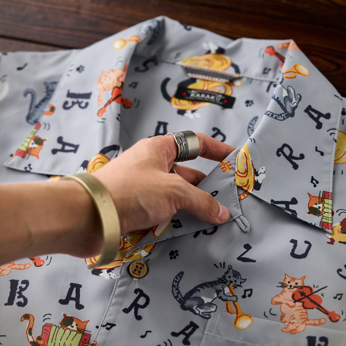 「고양이 음악가의 연주회」패턴 오픈칼라 셔츠