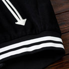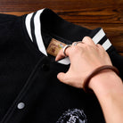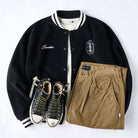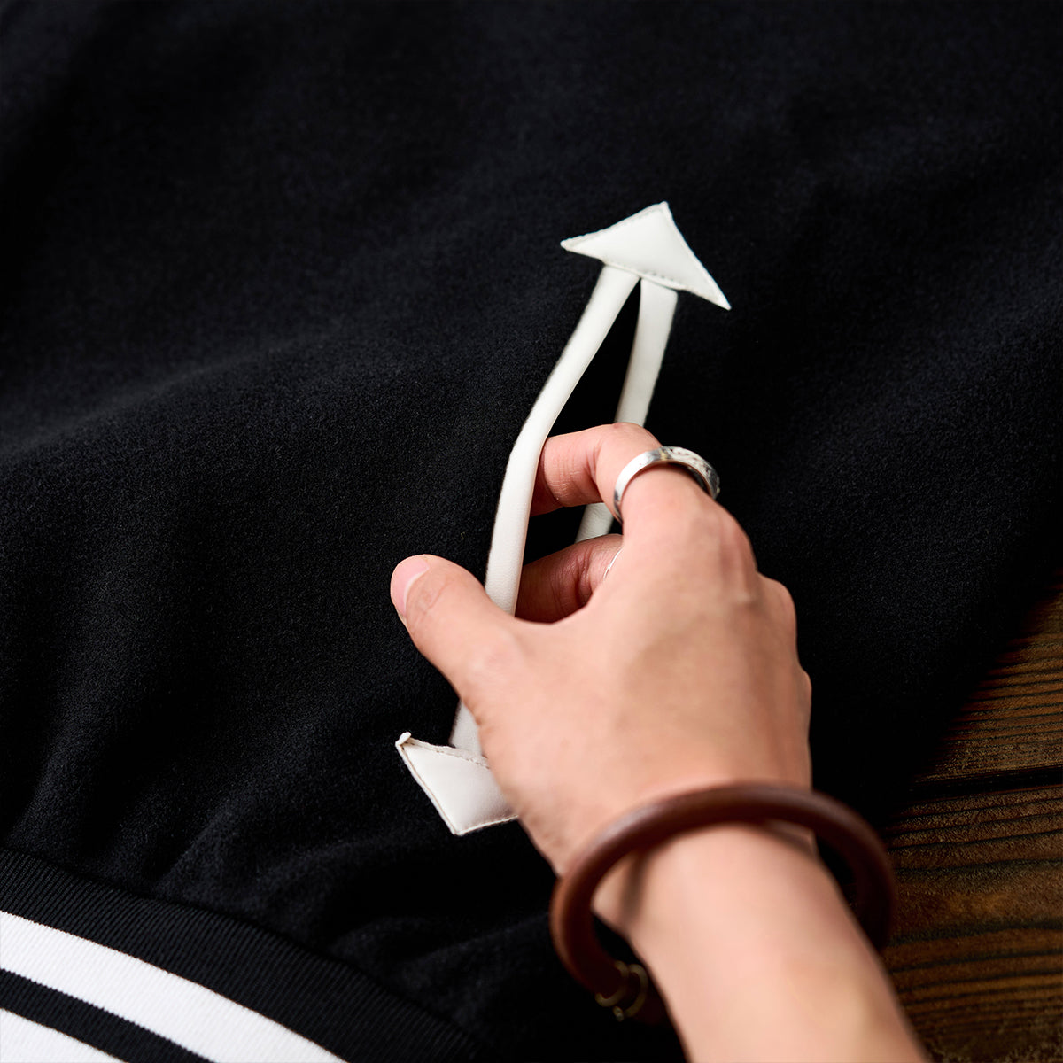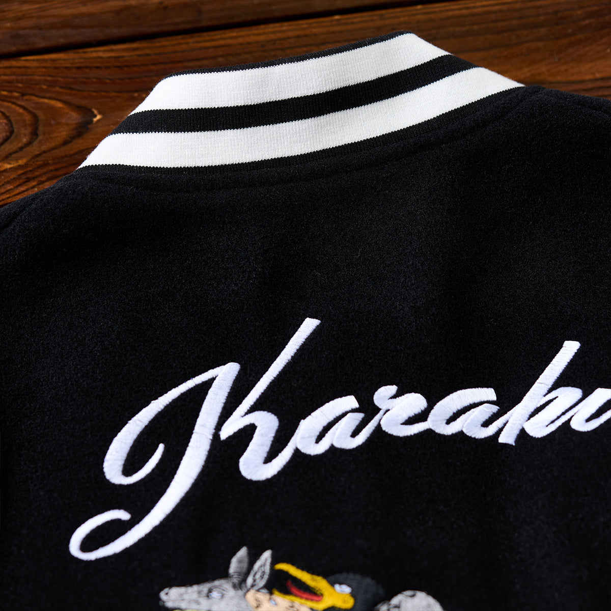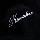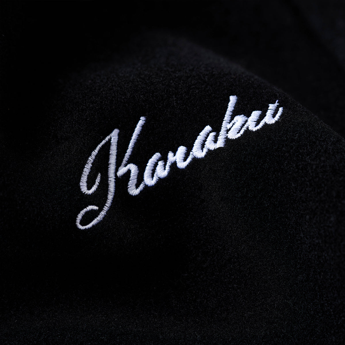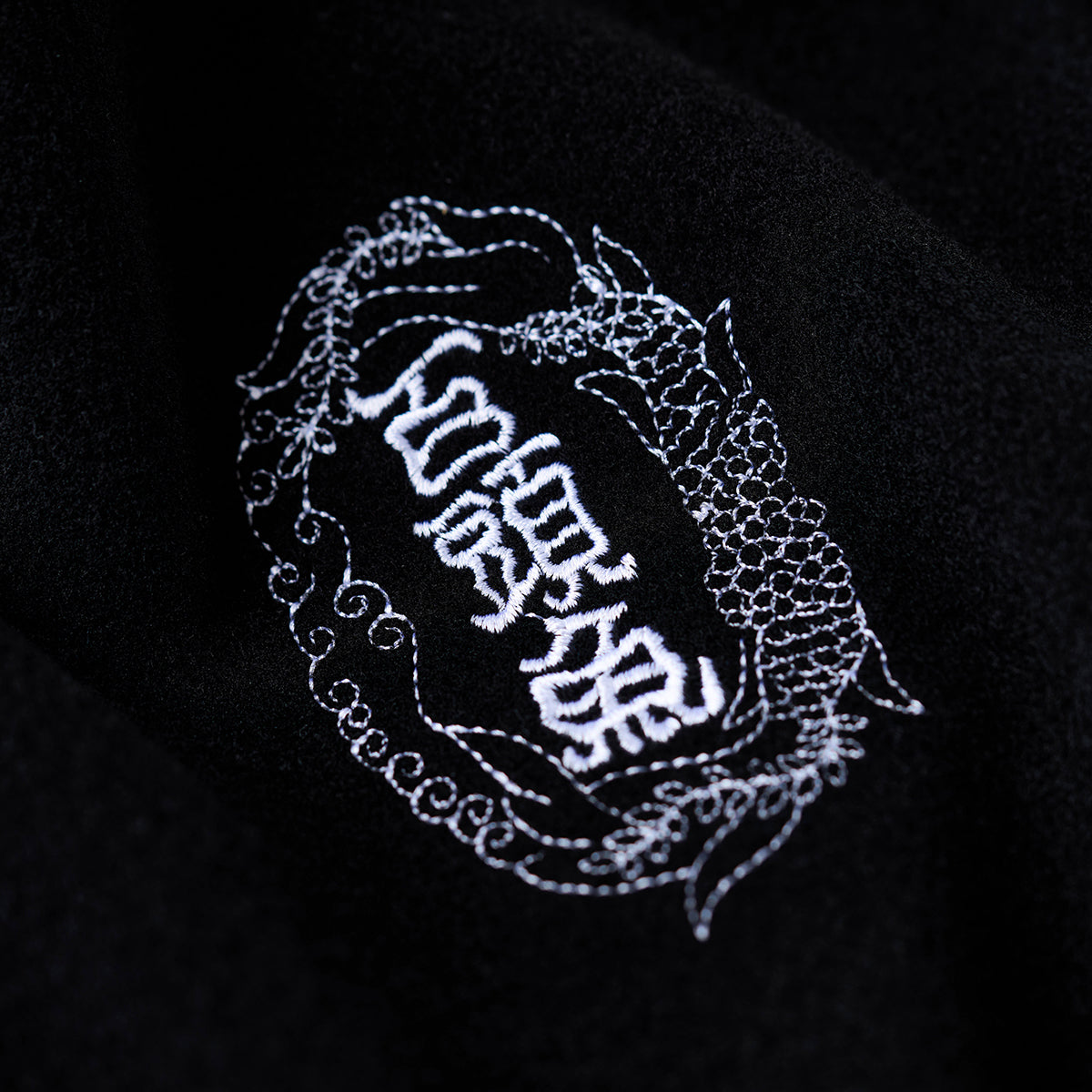 왼쪽 가슴에는 ‘백두어(百頭魚)’ 자수가 새겨져 글자 주변에 물고기 모티브 장식이 더해졌으며, 오른쪽 가슴에는 ‘Karaku’ 로고가 자수되어 서양풍 서체와 일본풍 자수가 조화를 이룹니다.