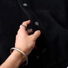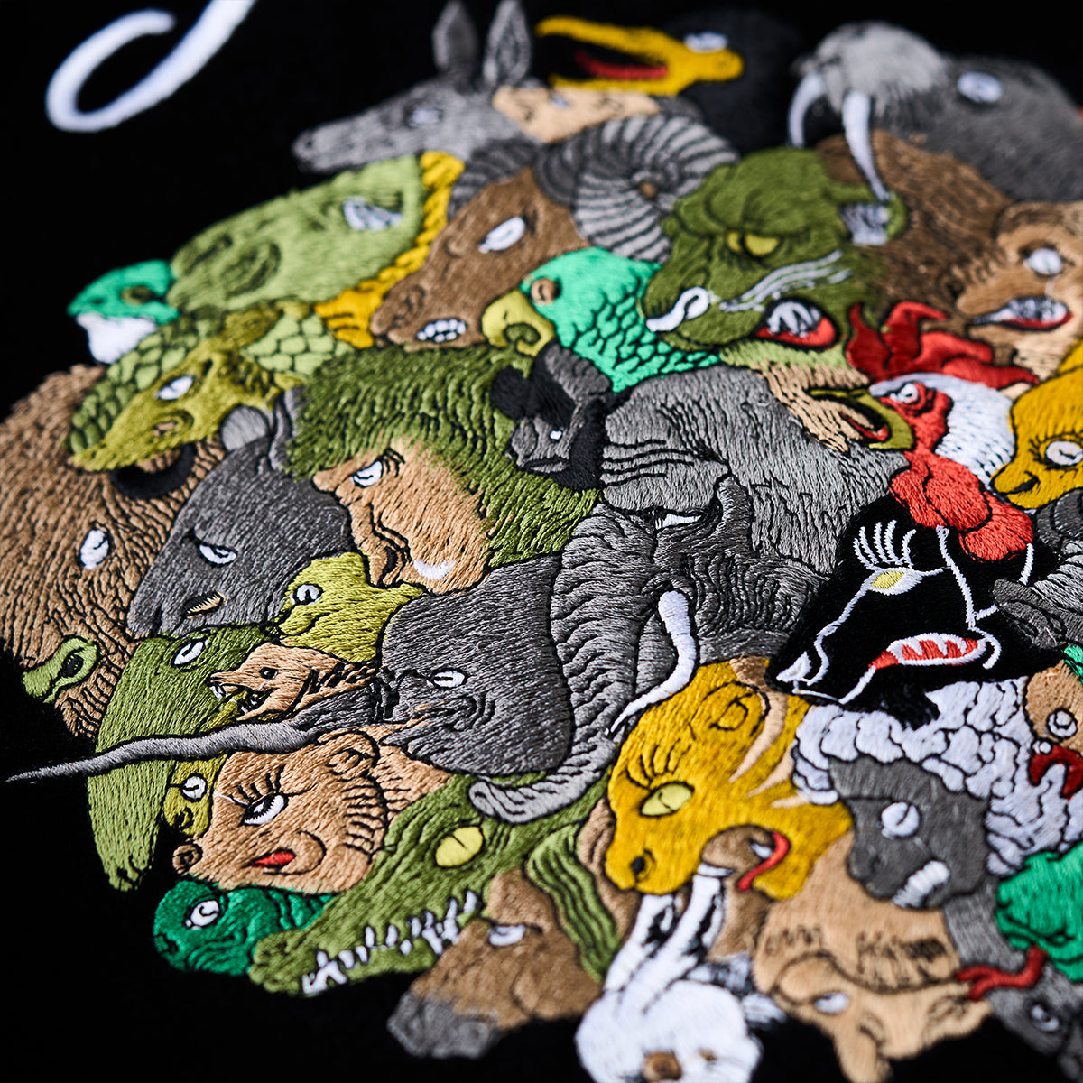 뒷면에는 백두어 자수가 들어가 있으며, 백 가지 동물 얼굴로 물고기 몸체를 형상화해 ‘생명의 혼돈과 조화’를 상징합니다. 섬세한 윤곽선으로 우키요에(浮世絵) 화가의 ‘선의 리듬’을 재현했습니다.