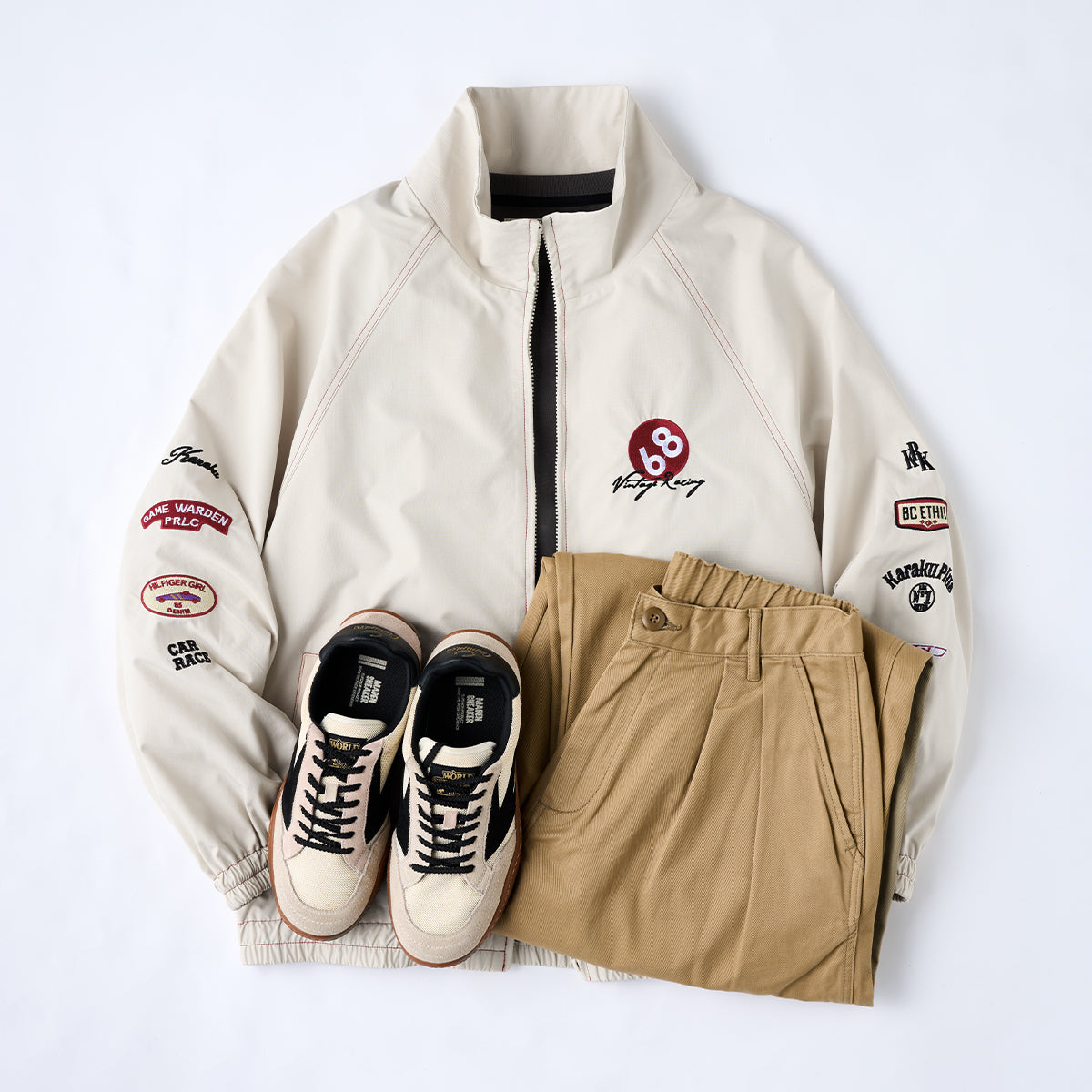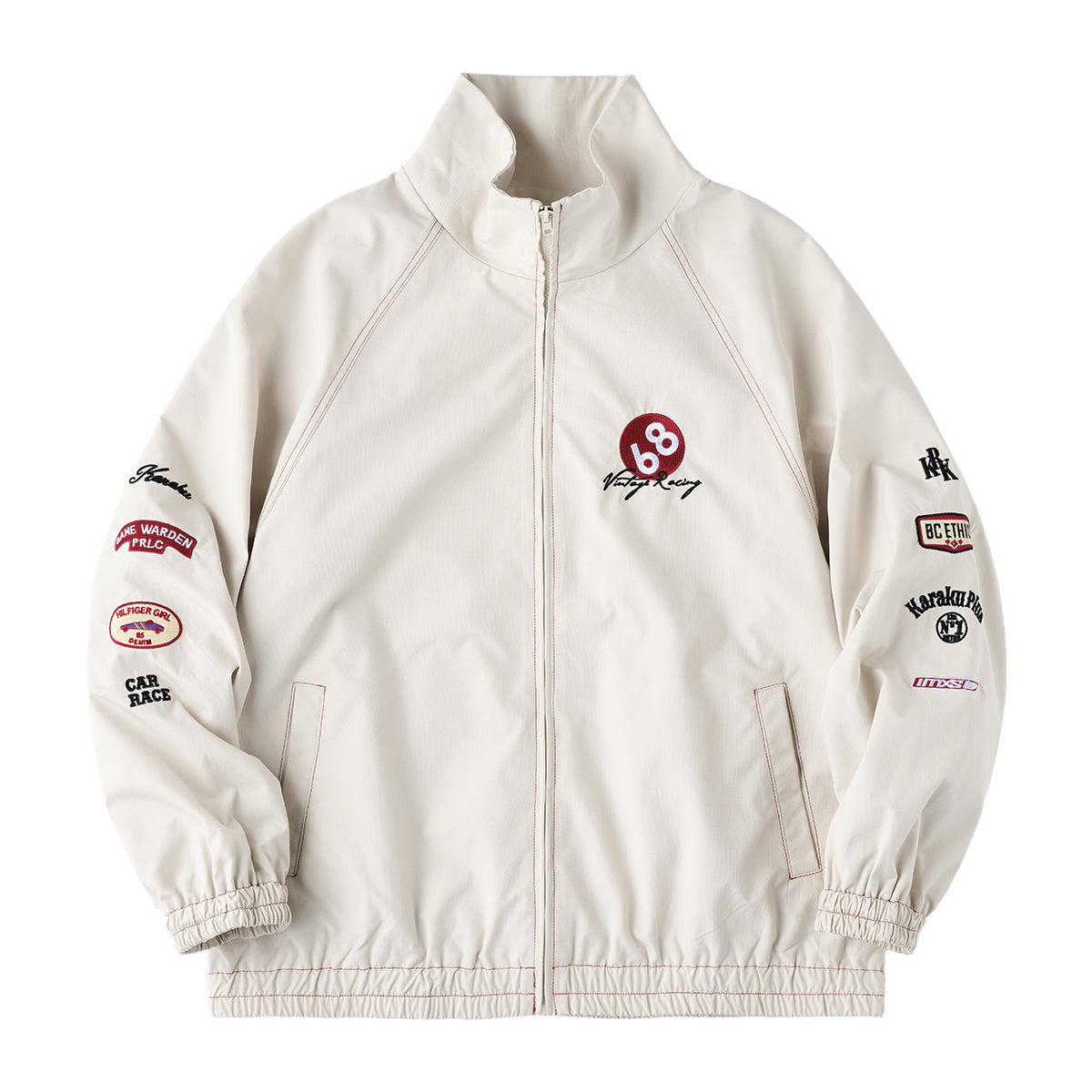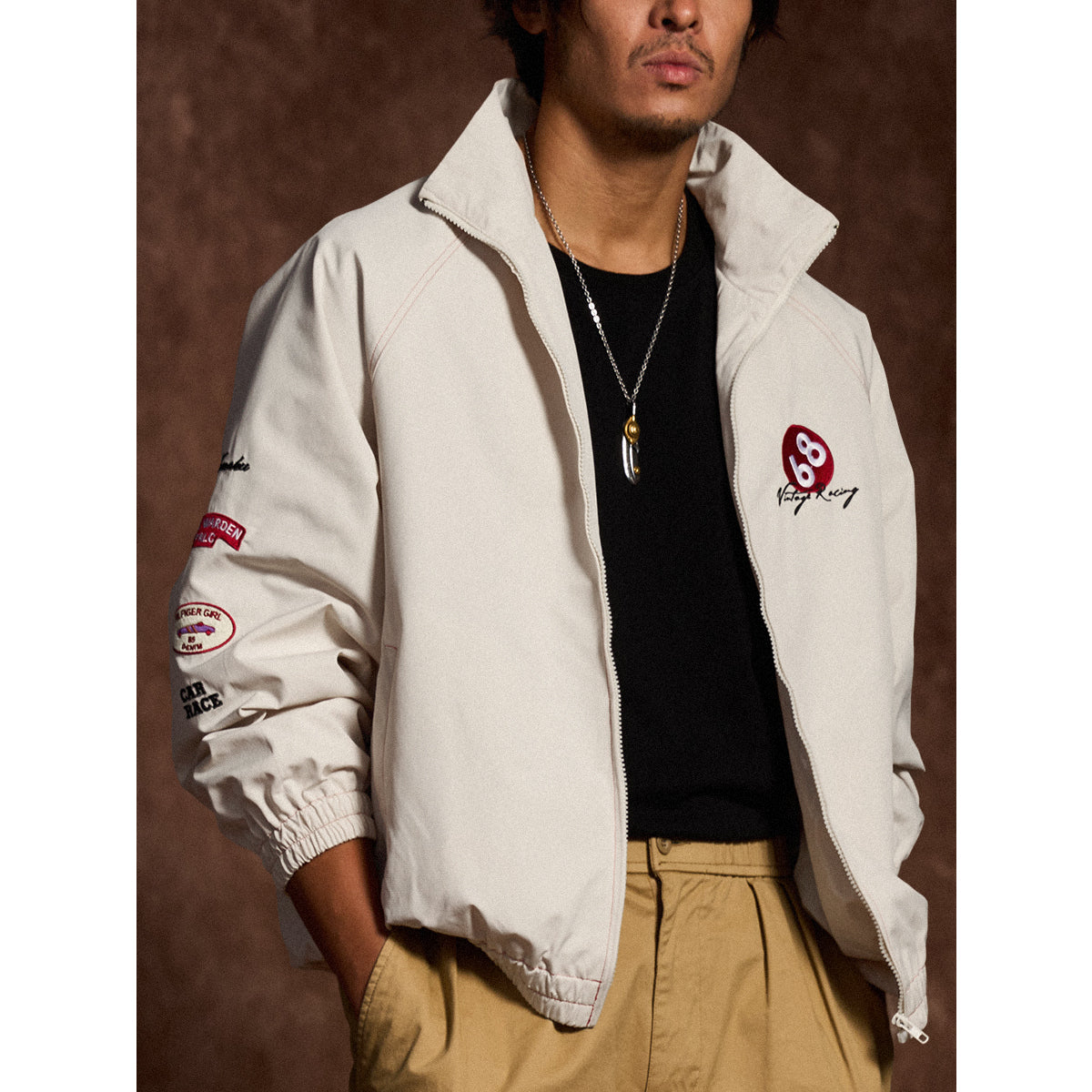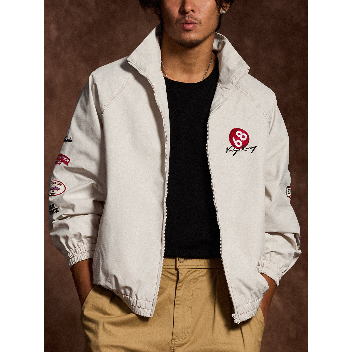 왼쪽 가슴 ‘68’ 자수와 ‘Vintage Racing’ 필기체, 소매 자수·와펜 디테일로 레이싱 감성과 스트리트 무드를 자연스럽게 연결한 디자인.