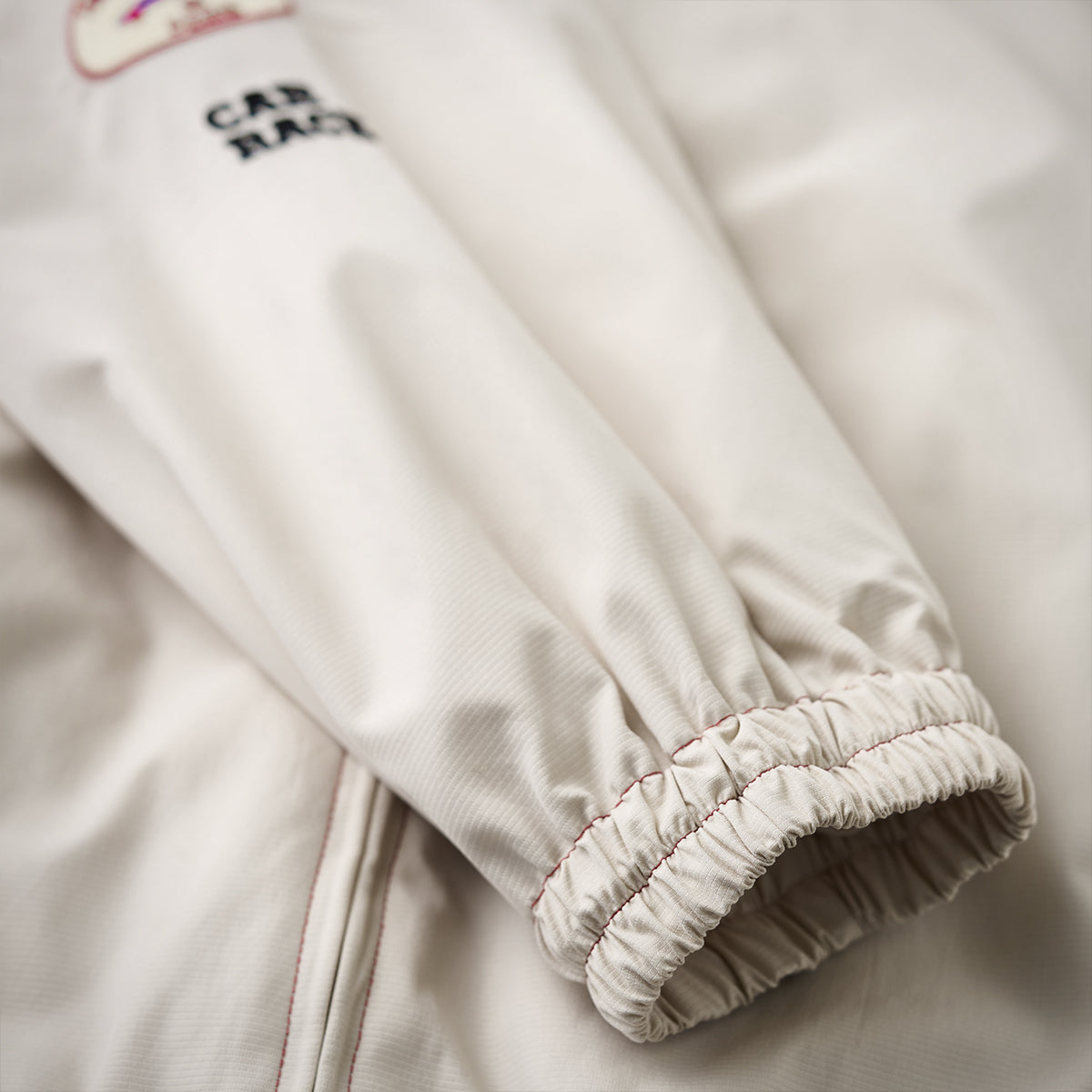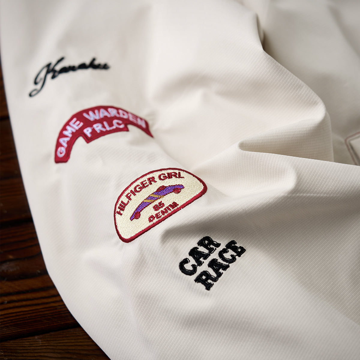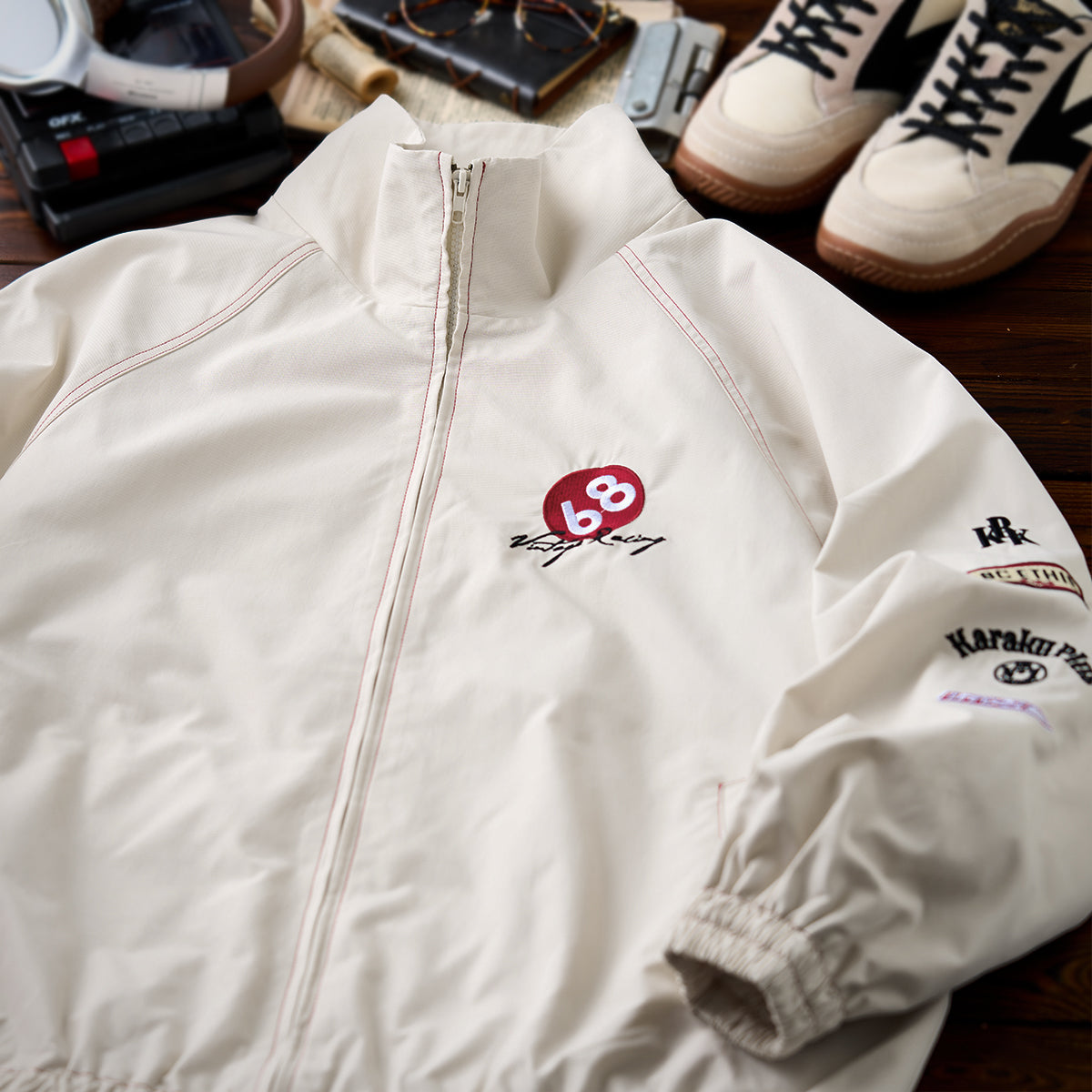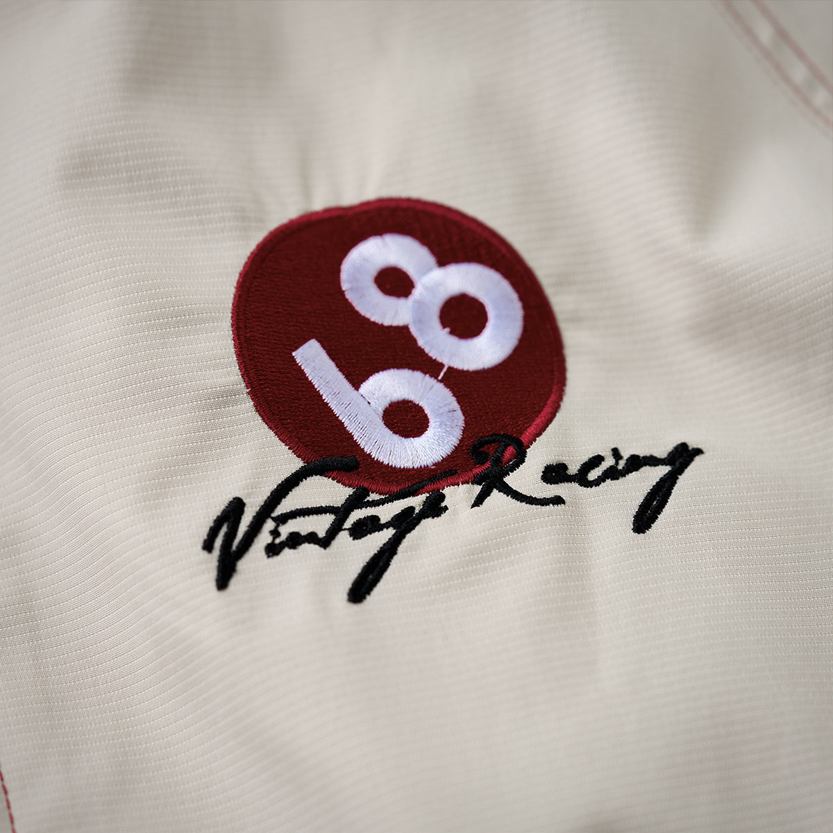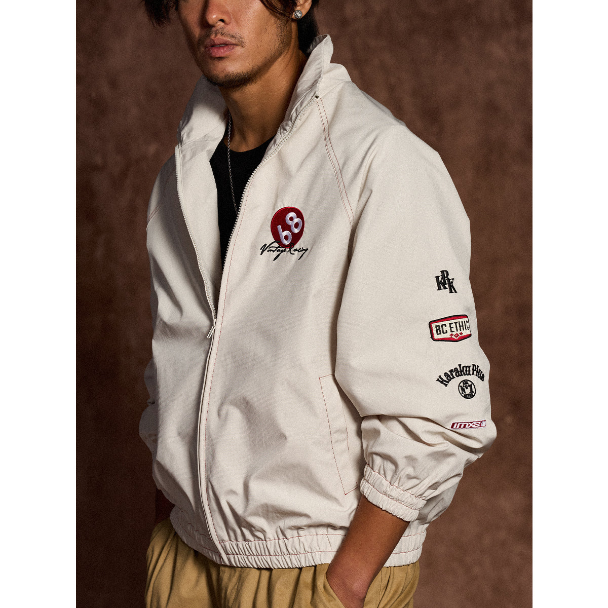 왼쪽 가슴 ‘68’ 자수와 ‘Vintage Racing’ 필기체, 소매 자수·와펜 디테일로 레이싱 감성과 스트리트 무드를 자연스럽게 연결한 디자인.