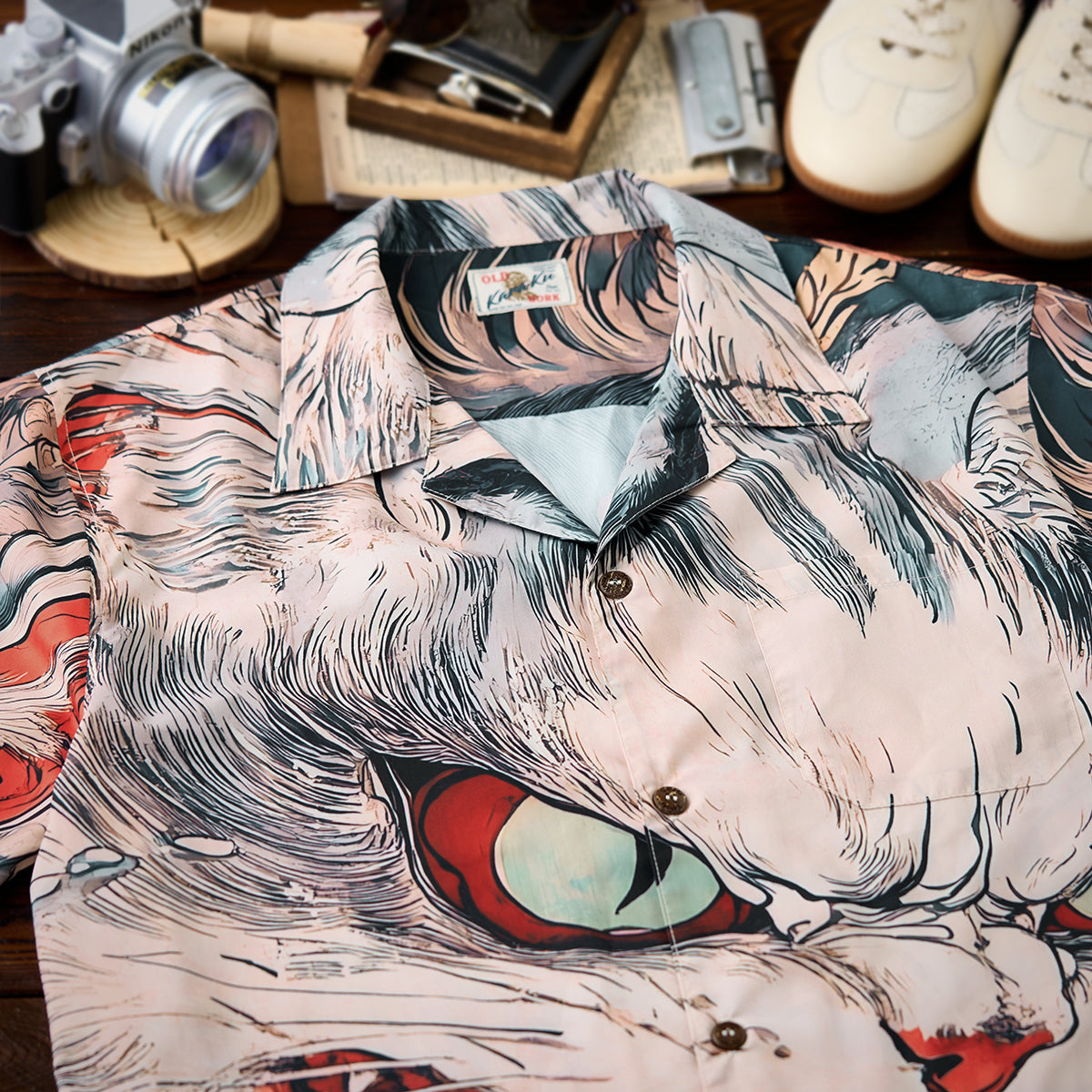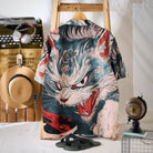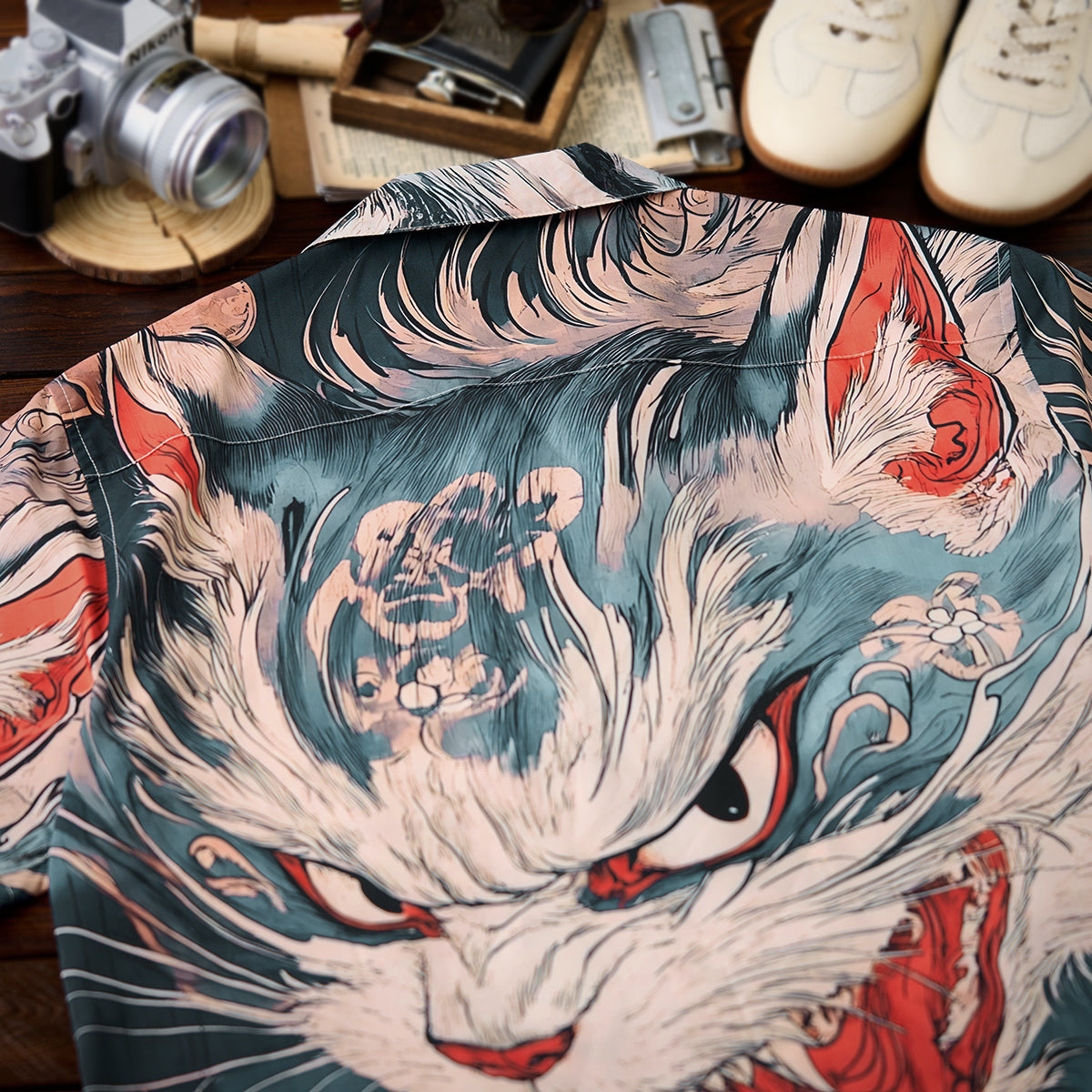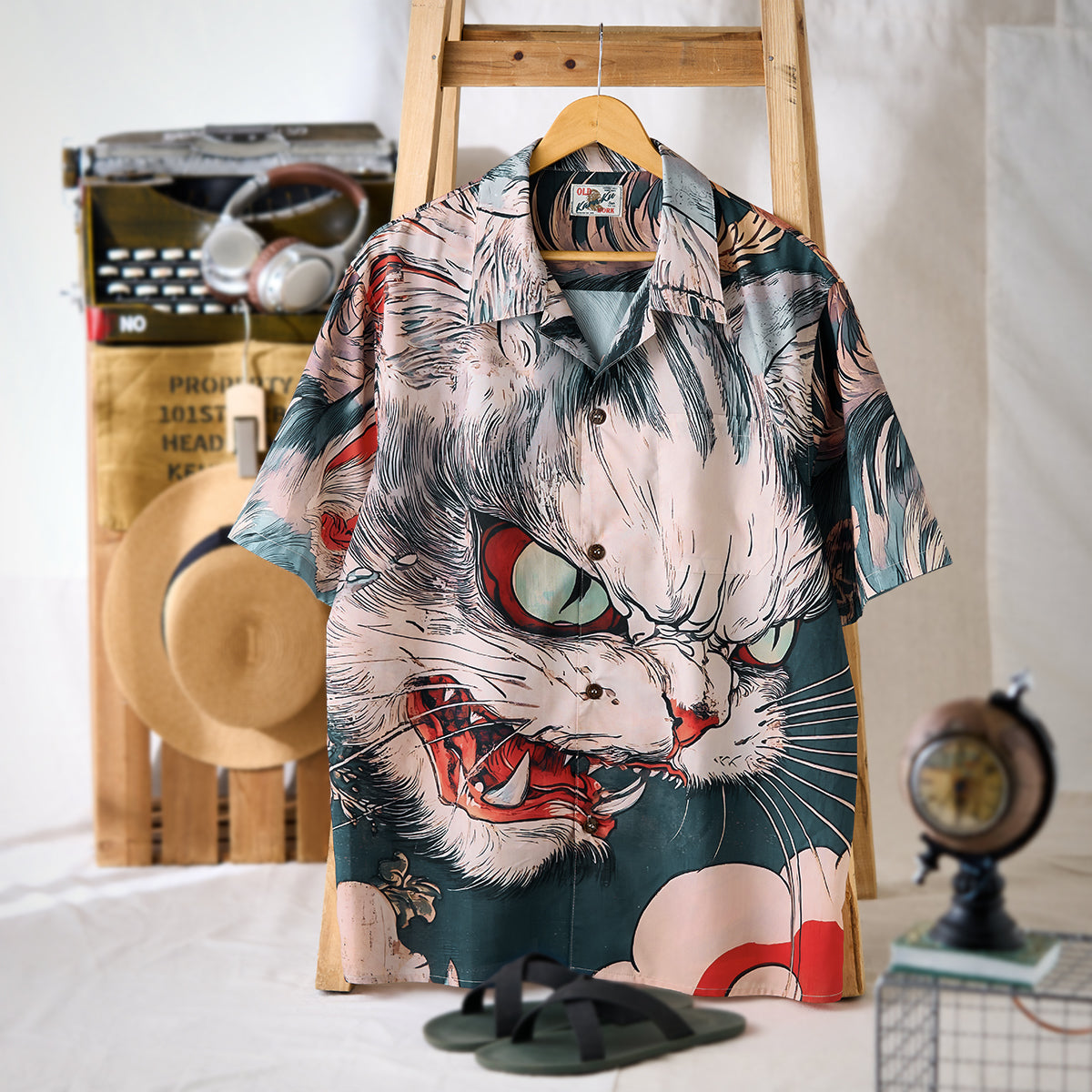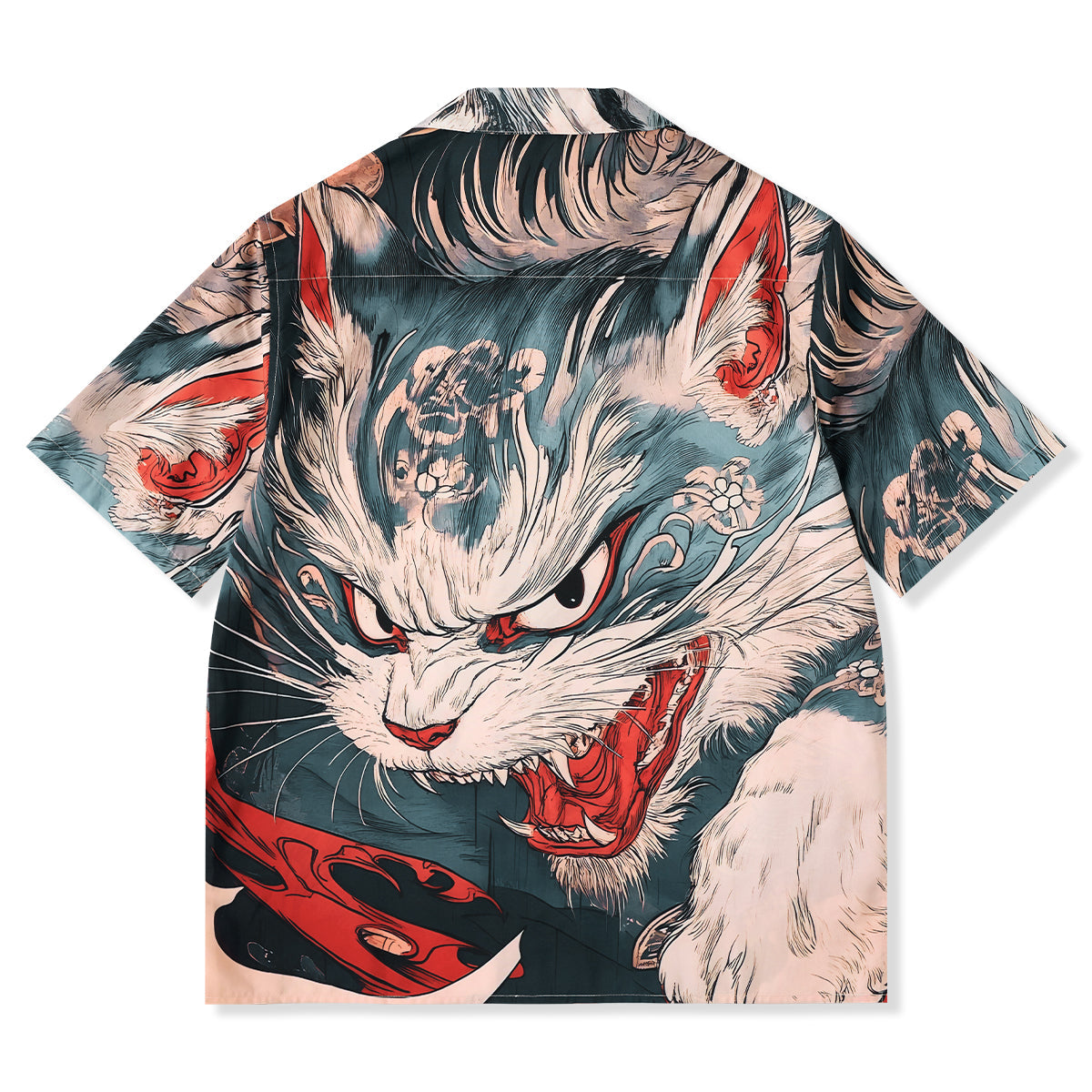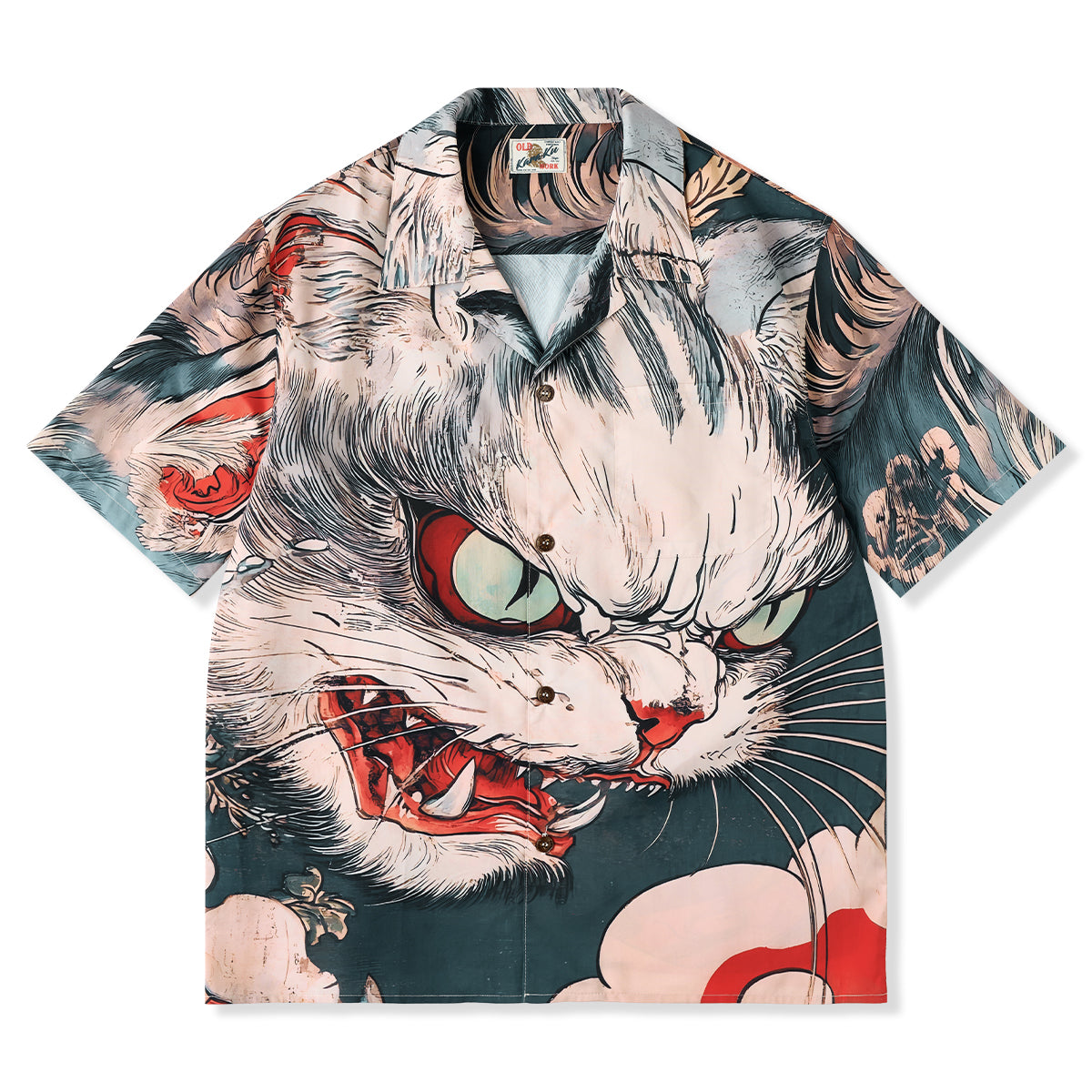 「울부짖는 요괴 고양이」우키요에 전후 비대칭 프린트 오픈칼라 셔츠