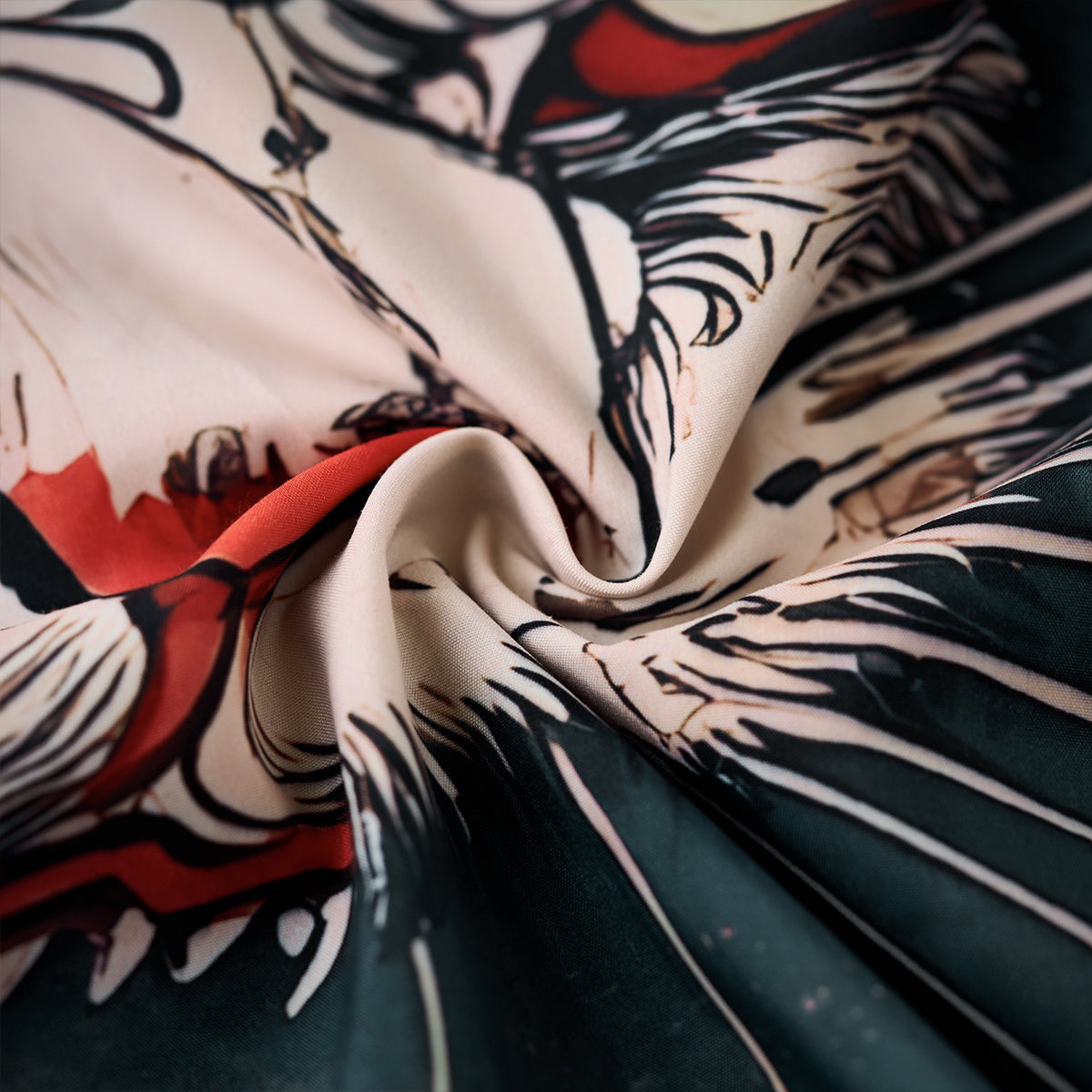 일본 요괴 전승 속 '요괴 고양이' 또는 '네코마타'를 바탕으로 하였습니다. 전면과 후면에 서로 다른 고양이의 표정을 담은 다이내믹한 패턴이 특징이며, 섬세한 털 표현과 날카로운 눈빛, 송곳니가 마치 달려들 것 같은 강렬한 인상을 줍니다.