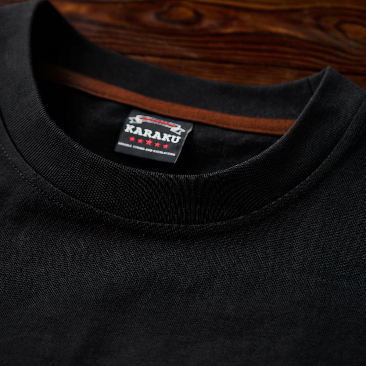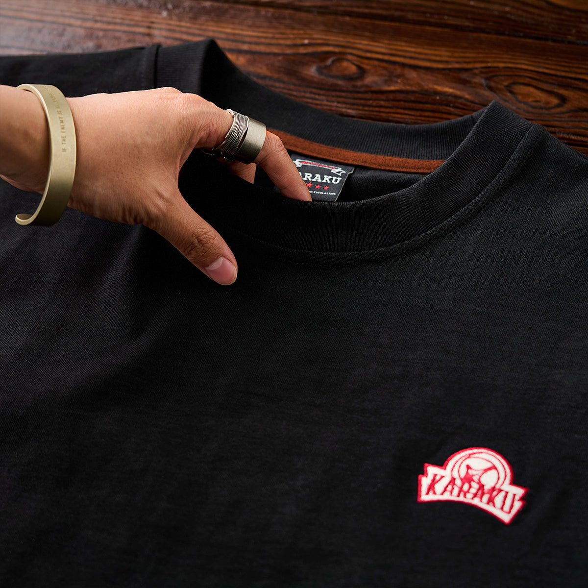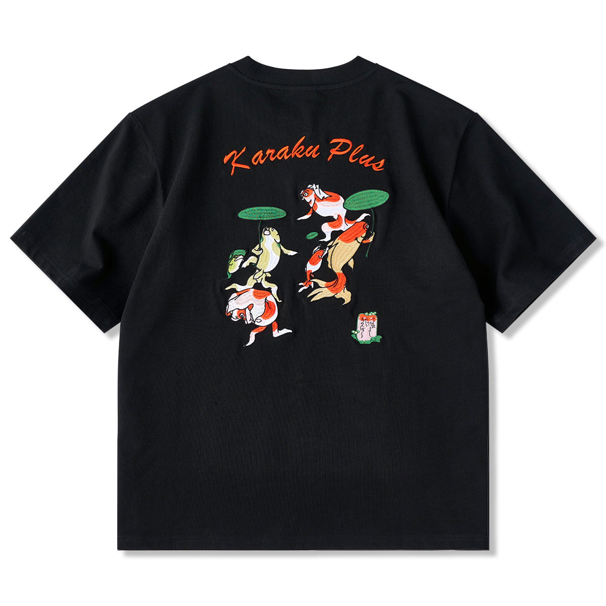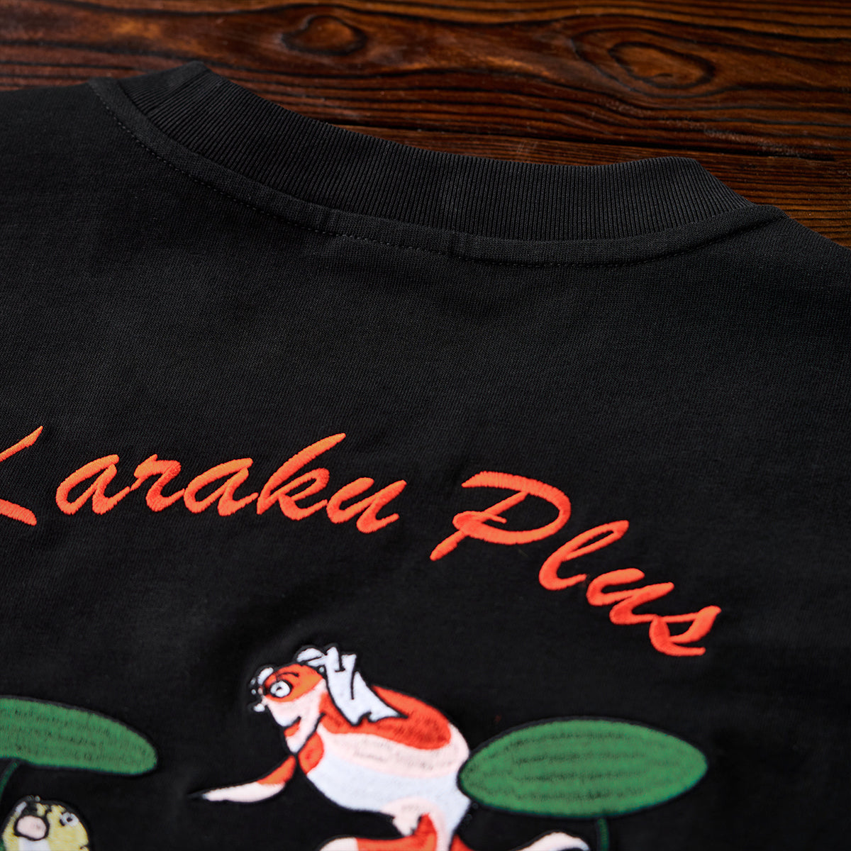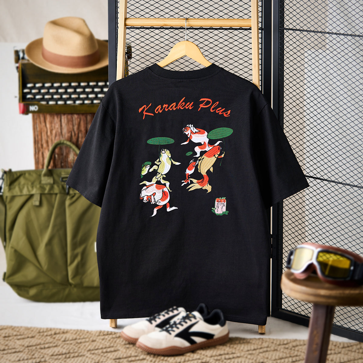 프론트에는 심플한 로고 자수가, 백에는 우타가와 쿠니요시(歌川国芳)의 「금붕어즈쿠시」에서 영감을 받은 자수 아트가 포인트인 티셔츠입니다. 한 장만으로도 강렬한 인상을 남기는 와팝(WA-POP) 스타일입니다.