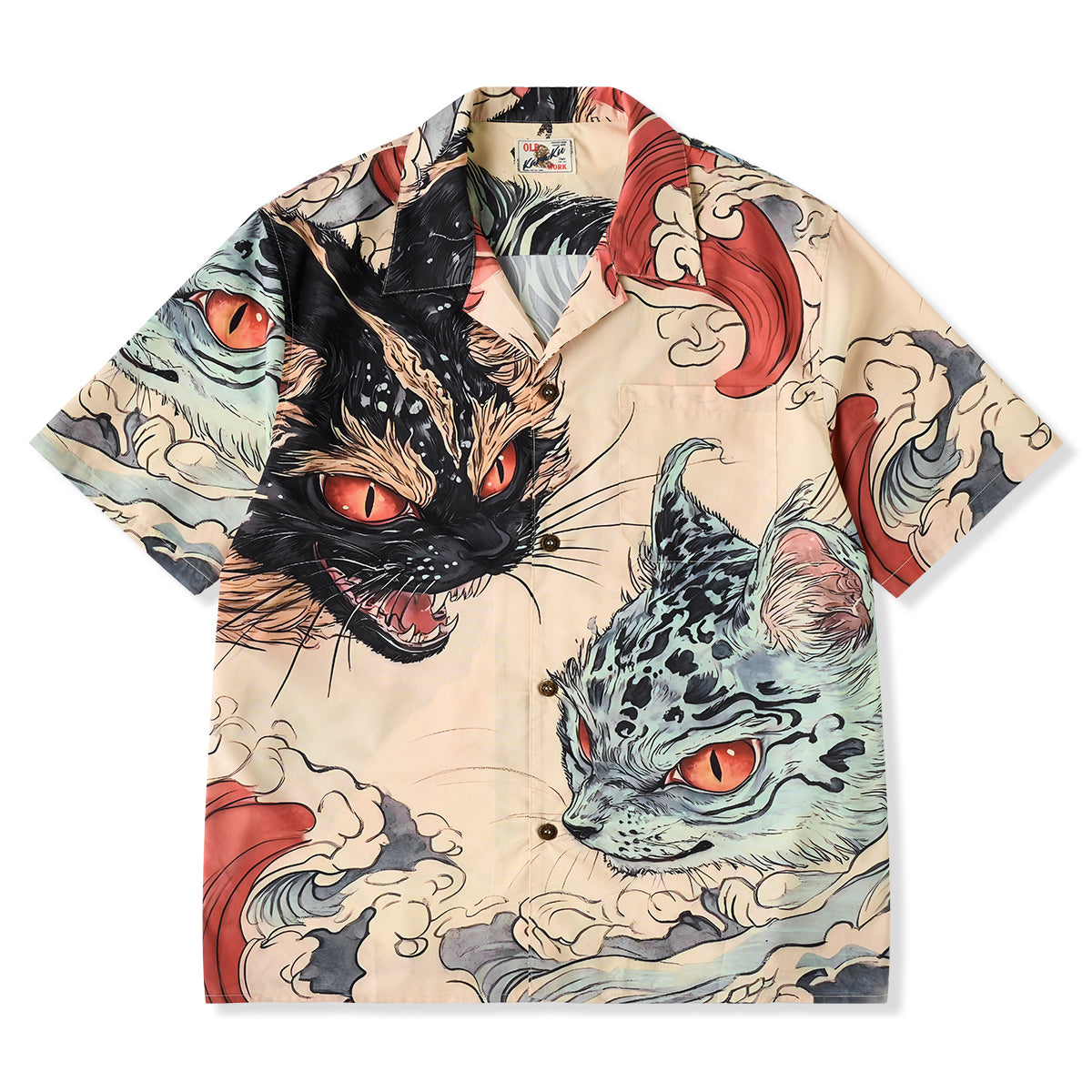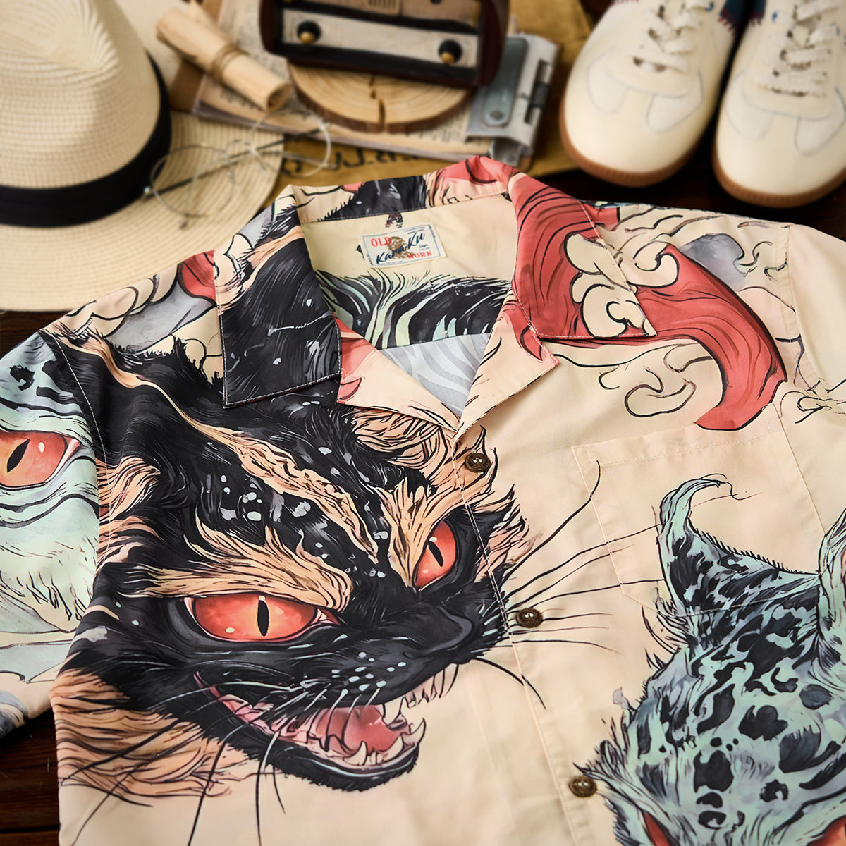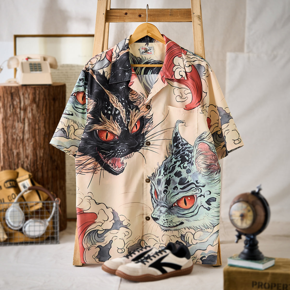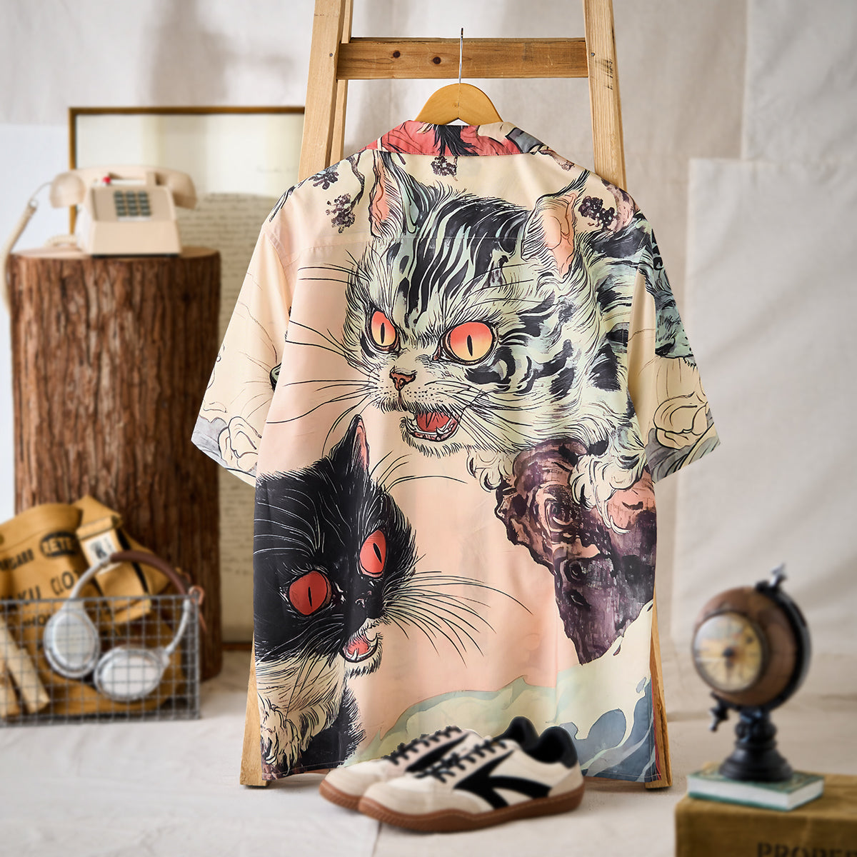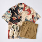 우키요에 고양이와 호랑이 무늬 셔츠입니다. 가볍고 부드러운 페이크 텐셀 소재로, 전통과 현대 컬러 조합이 캐주얼·스트리트 패션을 연출할 수 있습니다.
