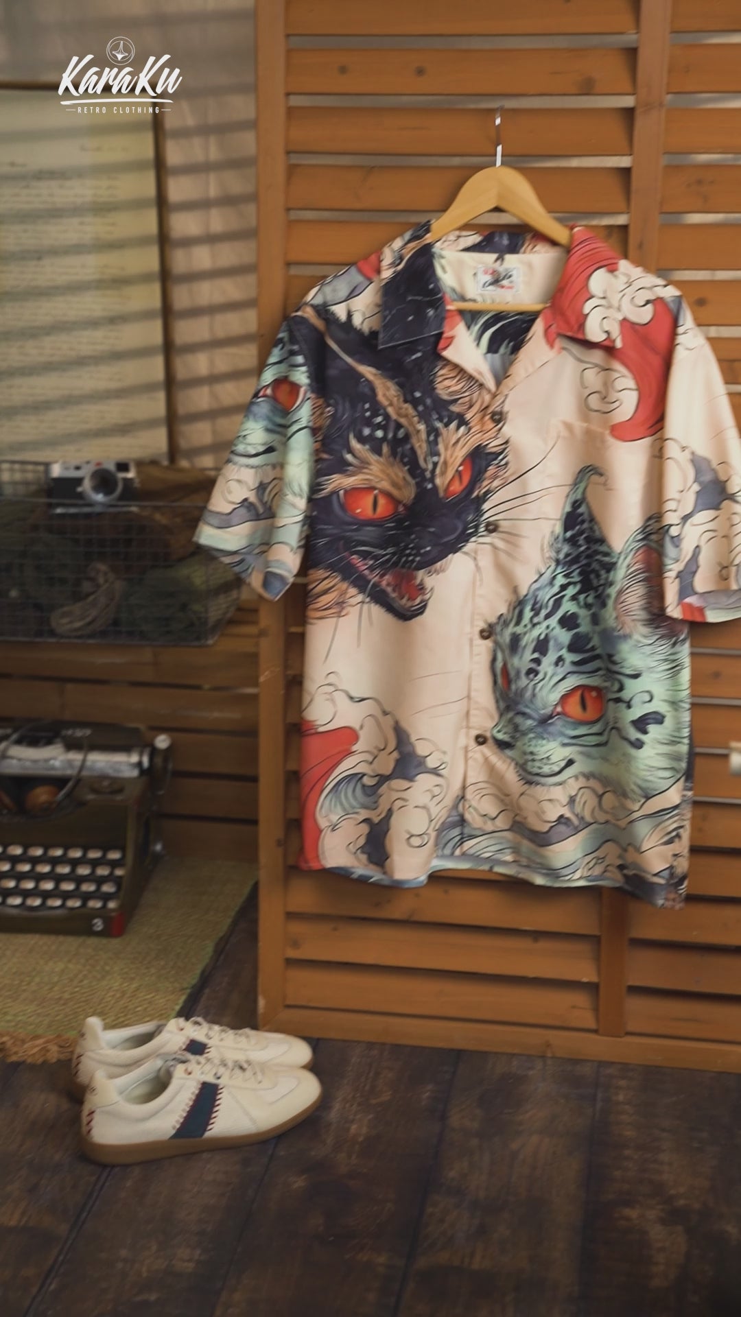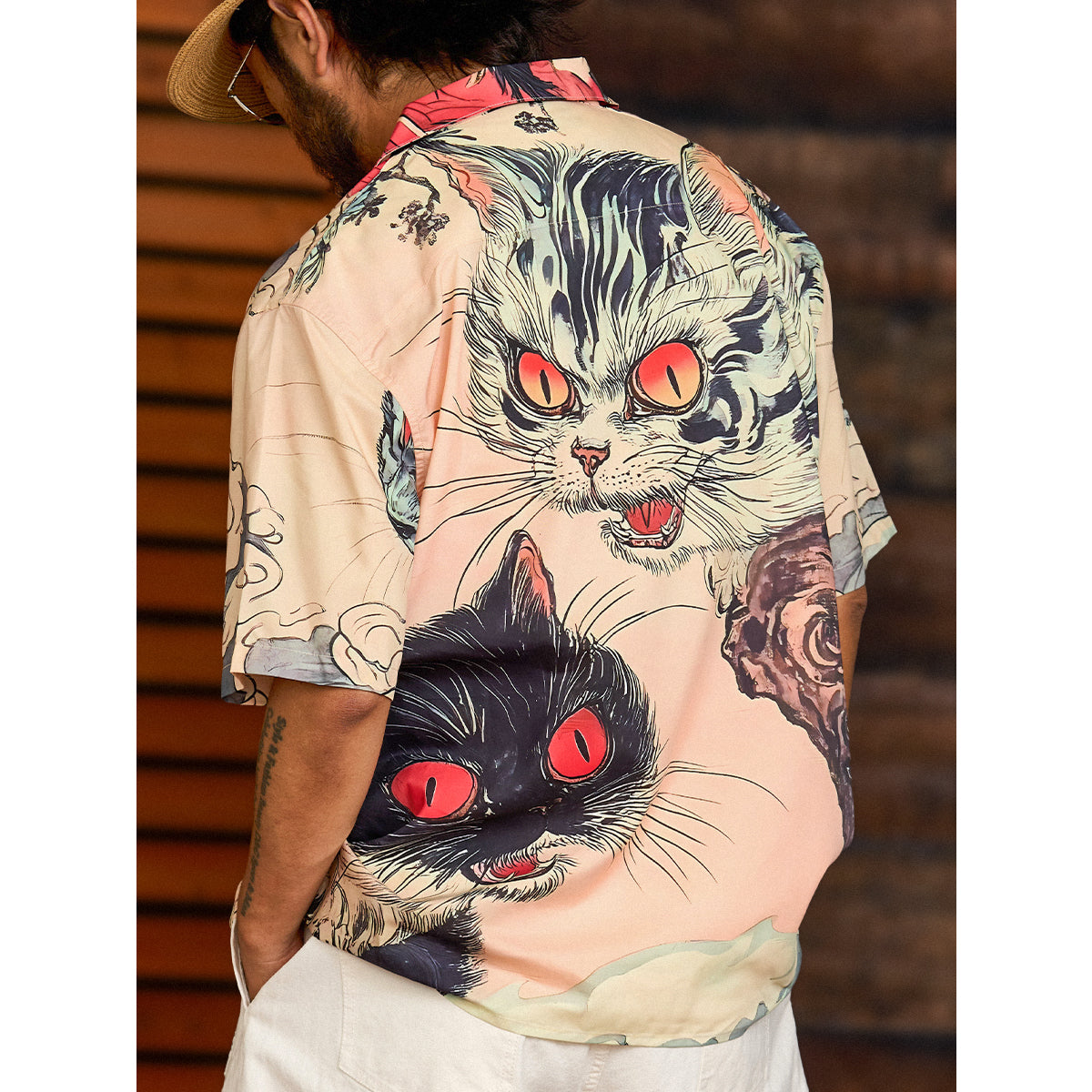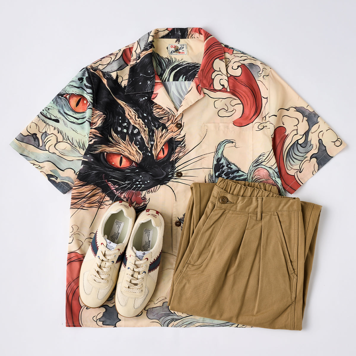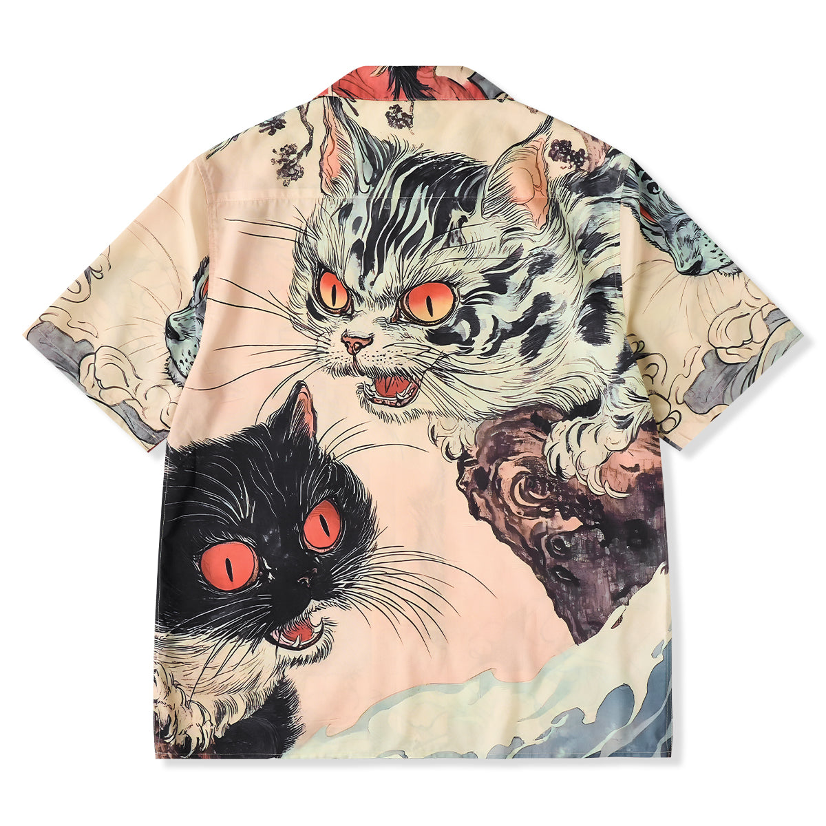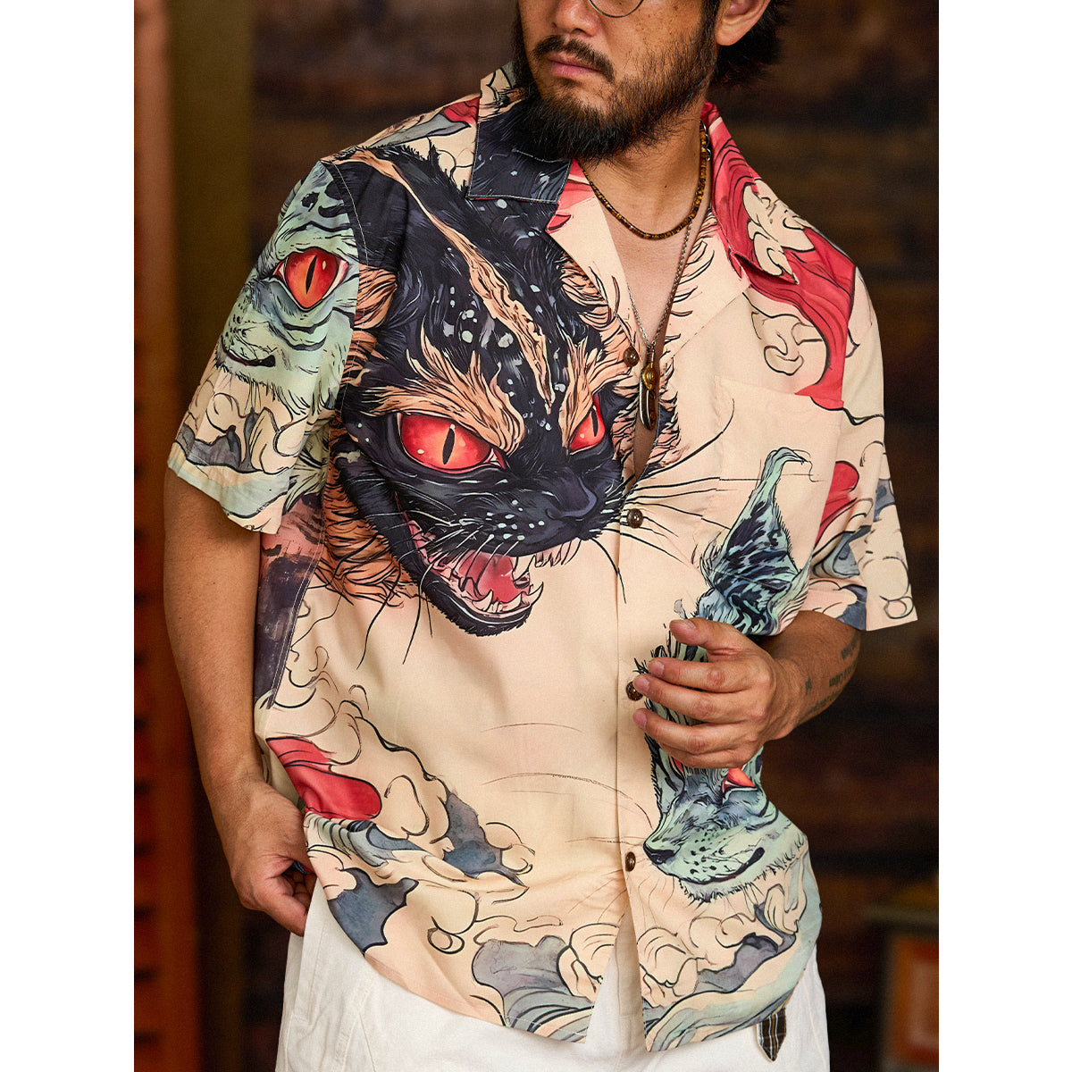 우키요에 고양이와 호랑이 무늬 셔츠입니다. 가볍고 부드러운 페이크 텐셀 소재로, 전통과 현대 컬러 조합이 캐주얼·스트리트 패션을 연출할 수 있습니다.