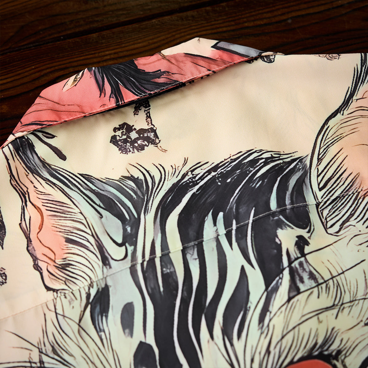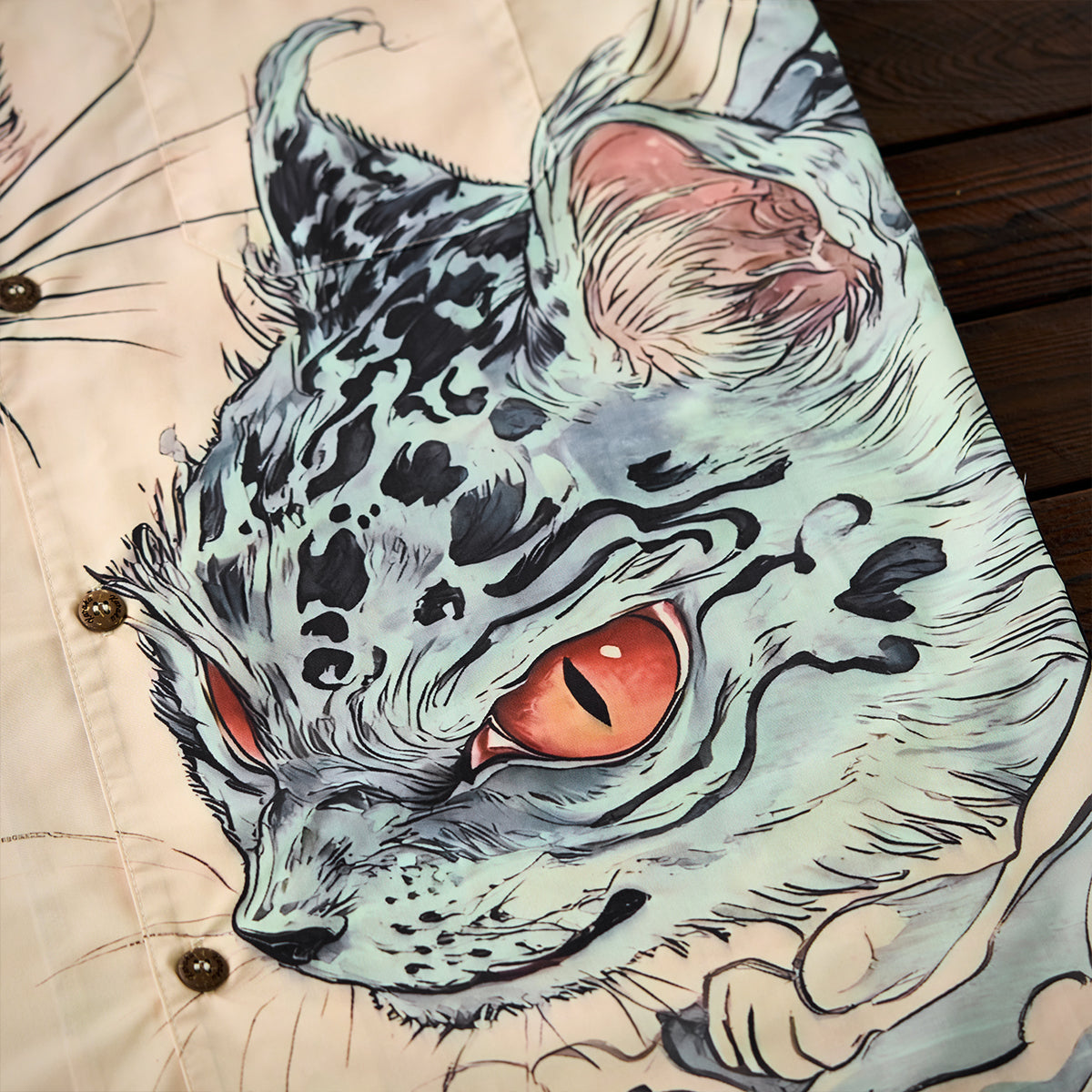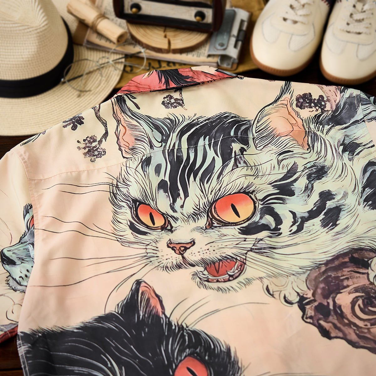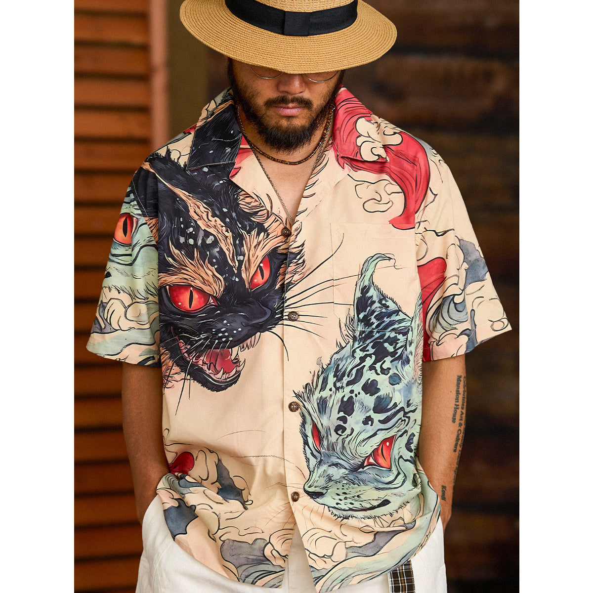 우키요에 고양이와 호랑이 무늬 셔츠입니다. 가볍고 부드러운 페이크 텐셀 소재로, 전통과 현대 컬러 조합이 캐주얼·스트리트 패션을 연출할 수 있습니다.