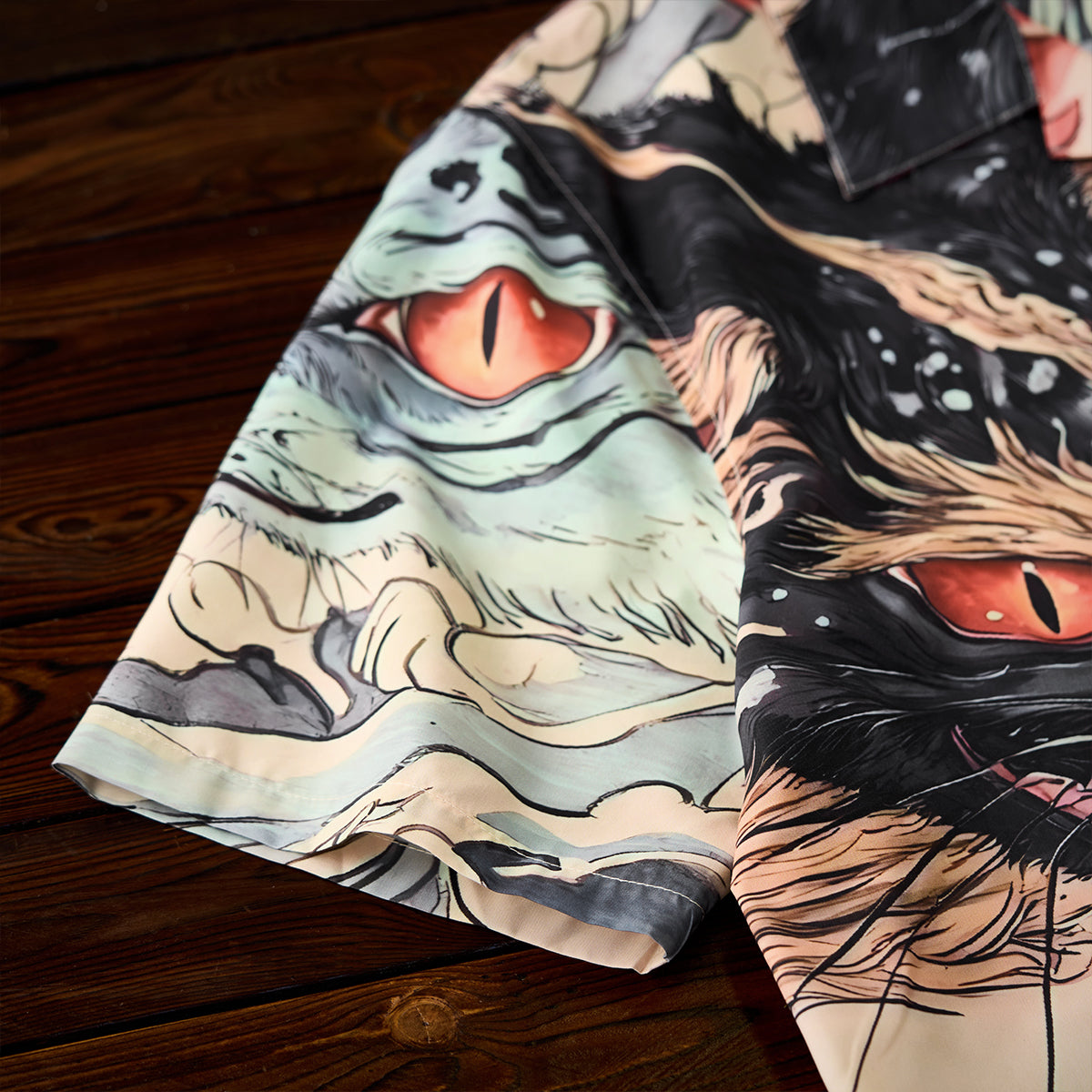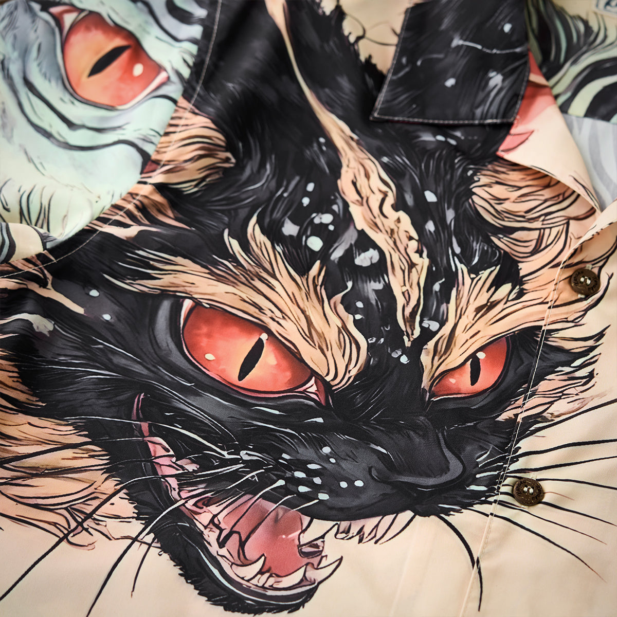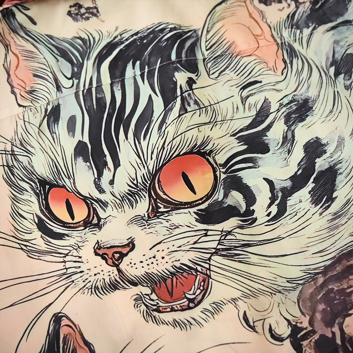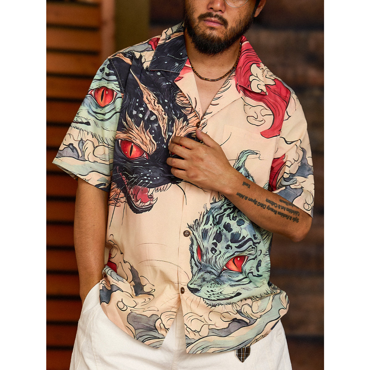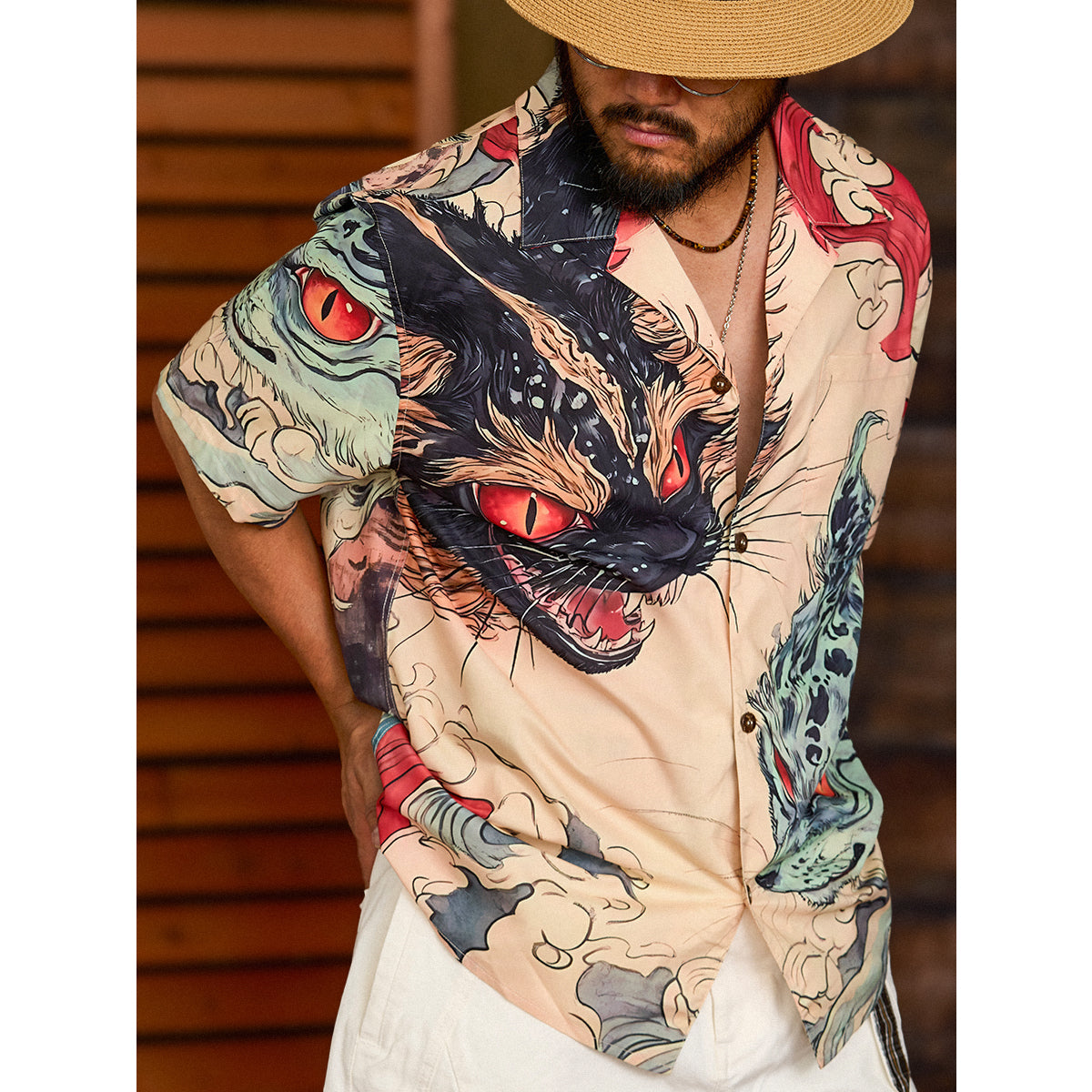 우키요에 고양이와 호랑이 무늬 셔츠입니다. 가볍고 부드러운 페이크 텐셀 소재로, 전통과 현대 컬러 조합이 캐주얼·스트리트 패션을 연출할 수 있습니다.