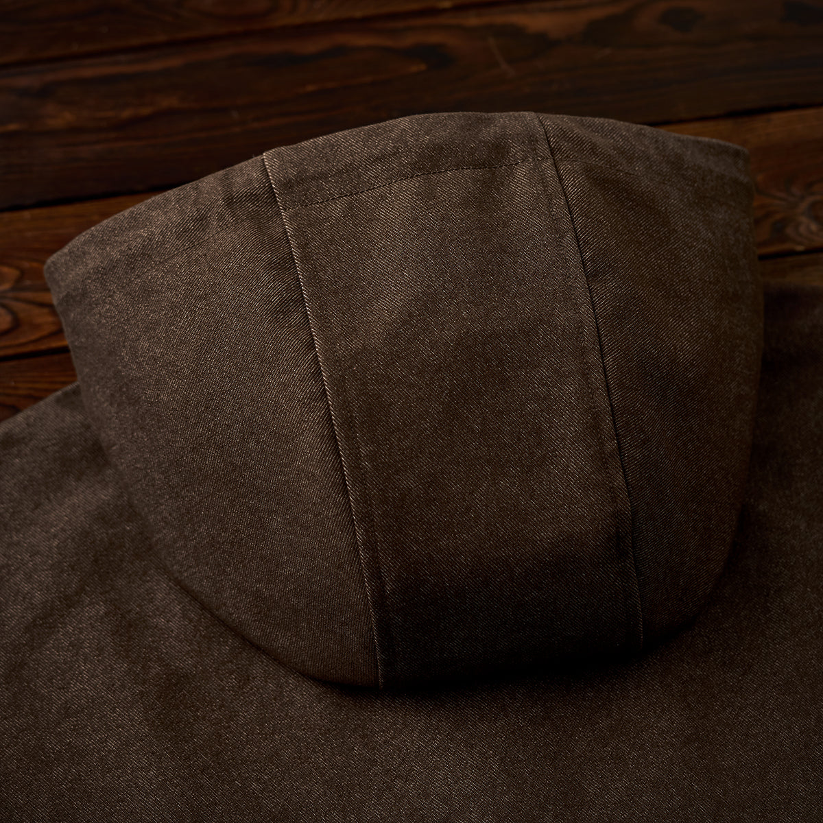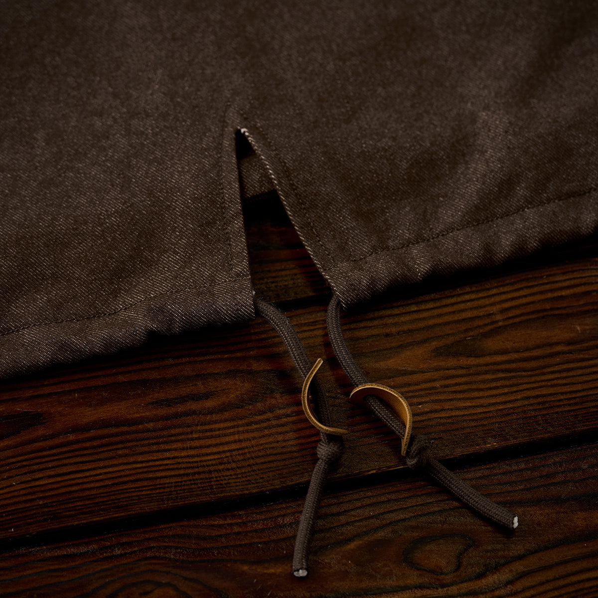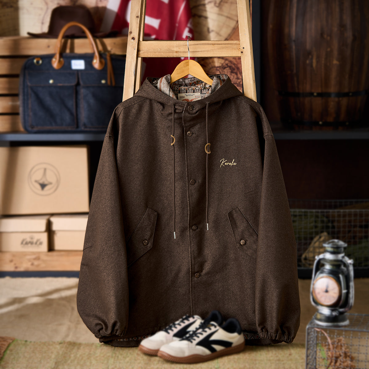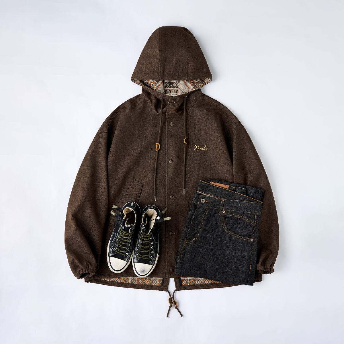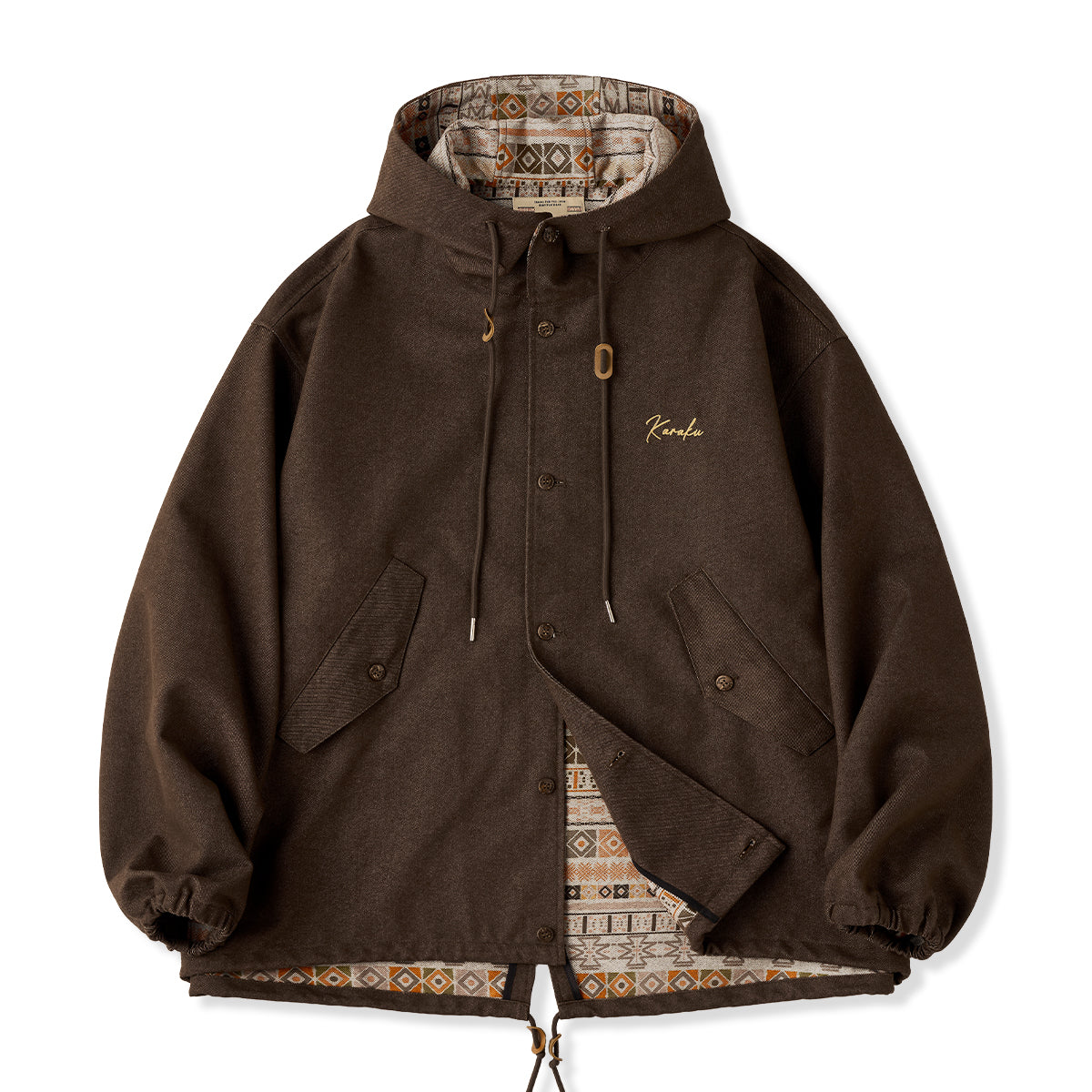 안감과 후드 안쪽의 에스닉 기하학 패턴과 가슴의 은은한 Karaku 자수가 포인트인 데님 재킷입니다. 뒷면은 살짝 길게 떨어지고 여유로운 핏으로 활동성을 높였습니다.