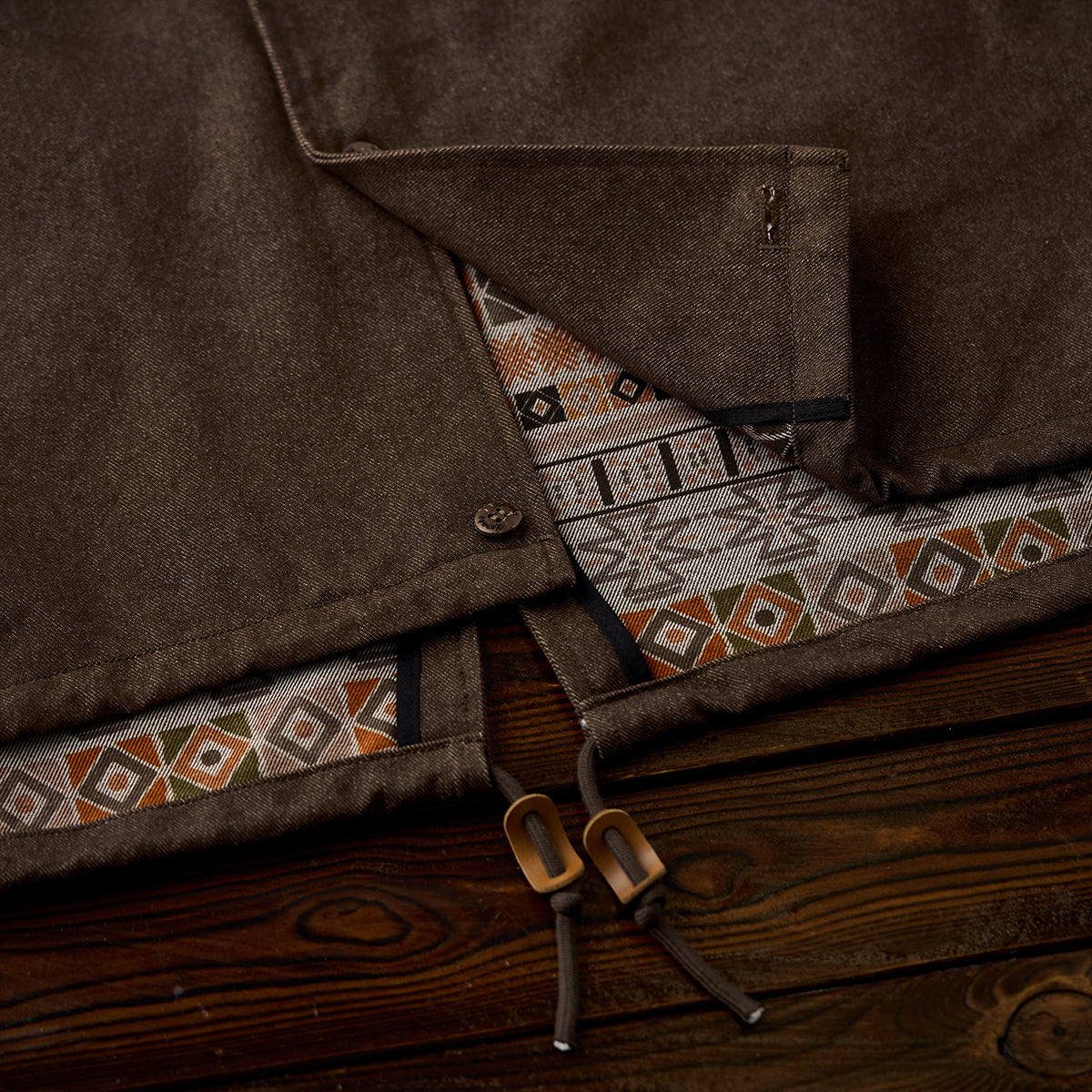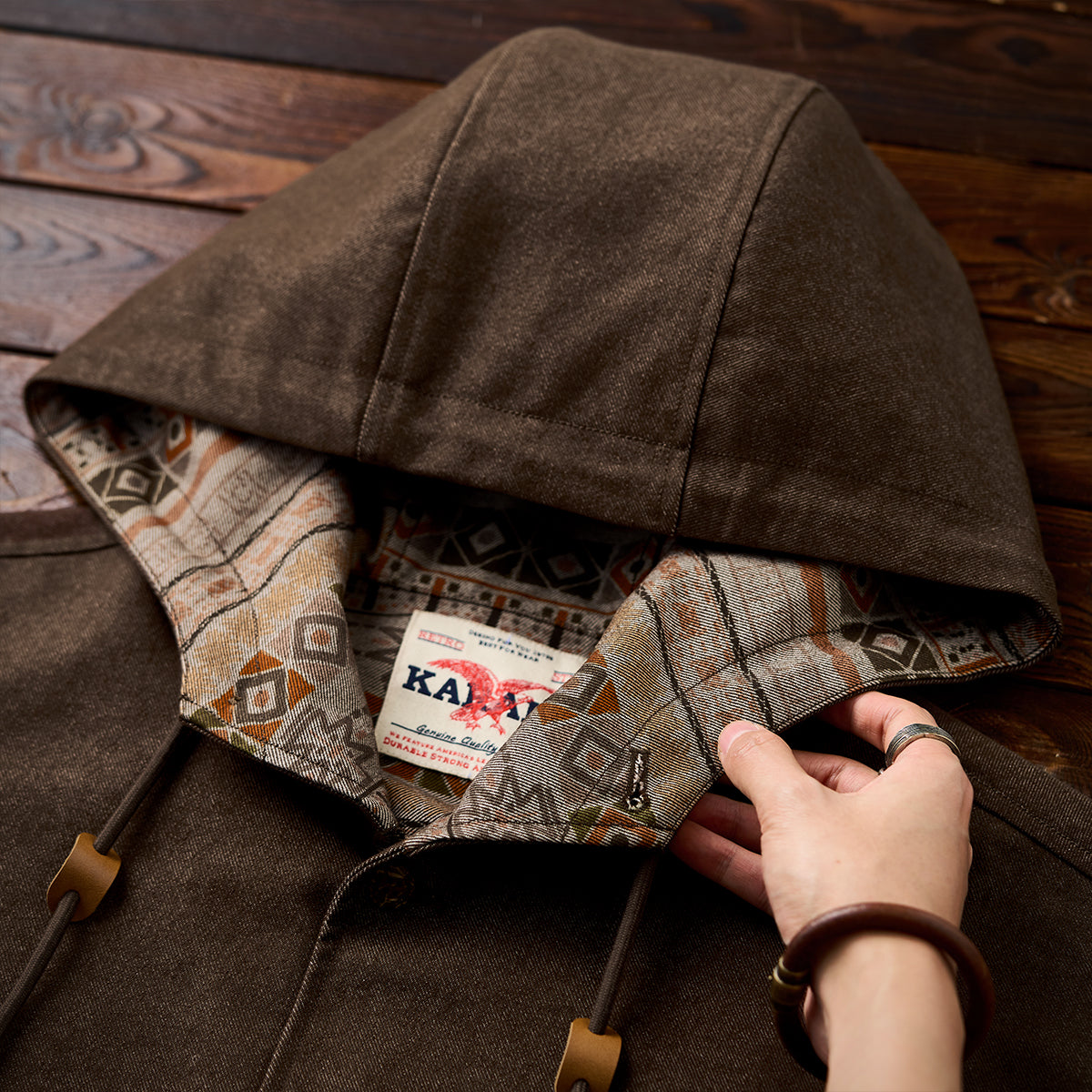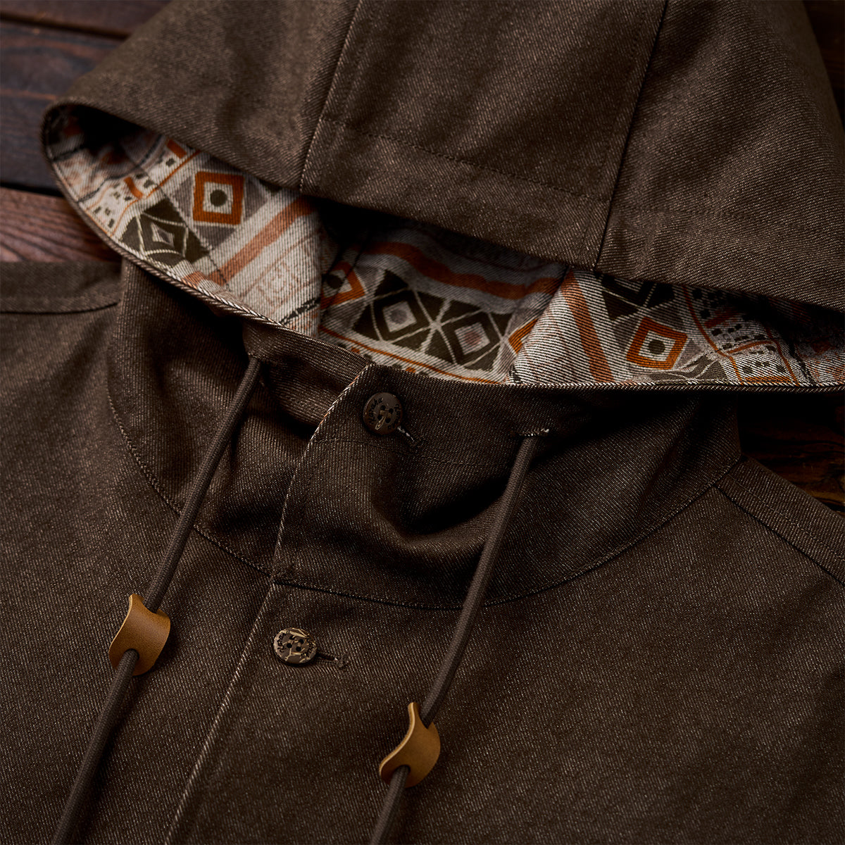 안감과 후드 안쪽에 에스닉 기하학 패턴을 더해 데님과 조화로운 포인트를 만든 디자인입니다.