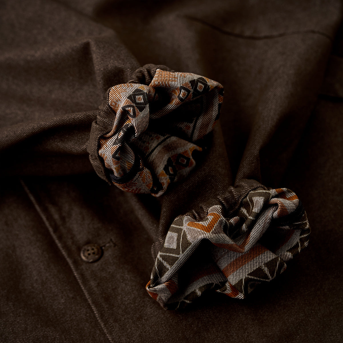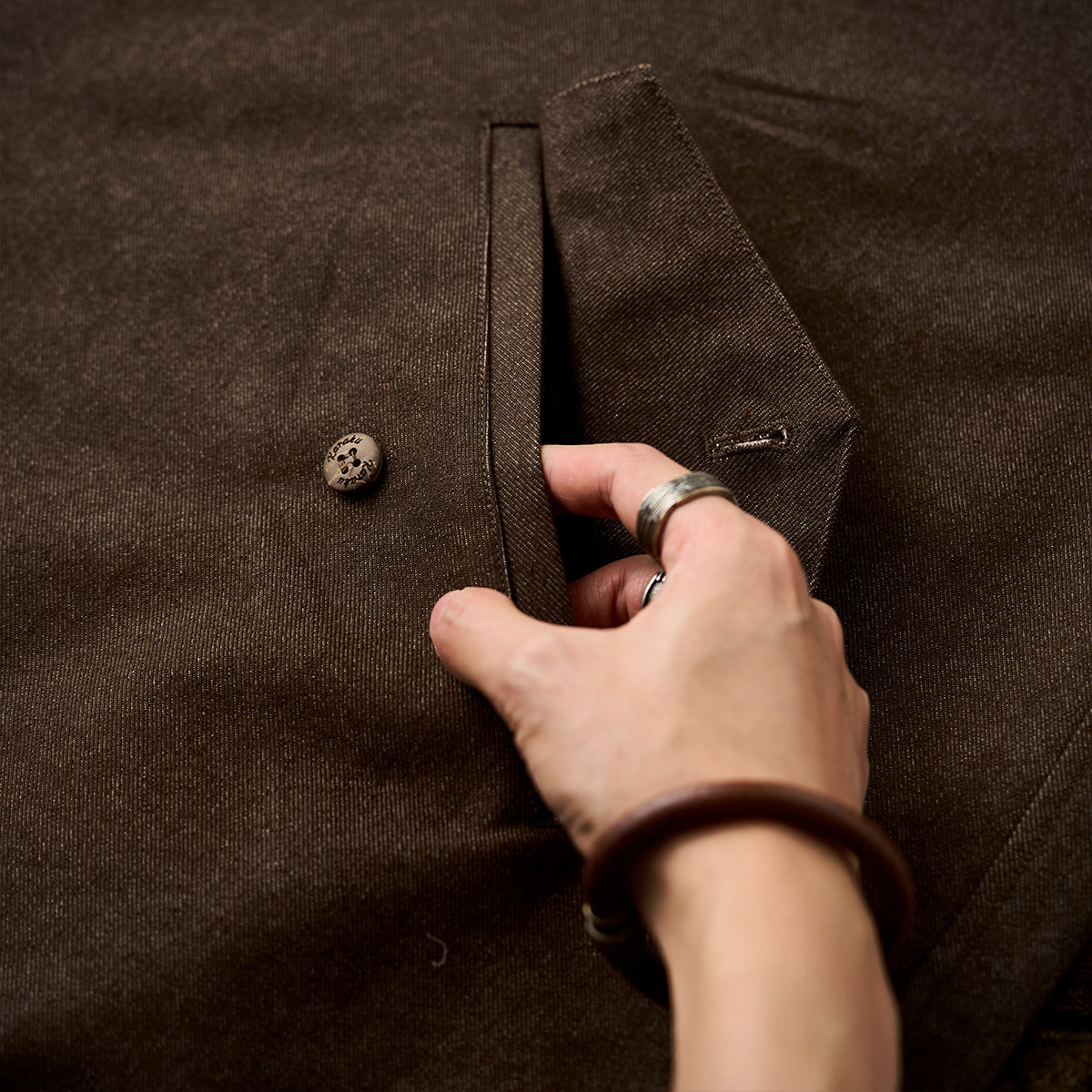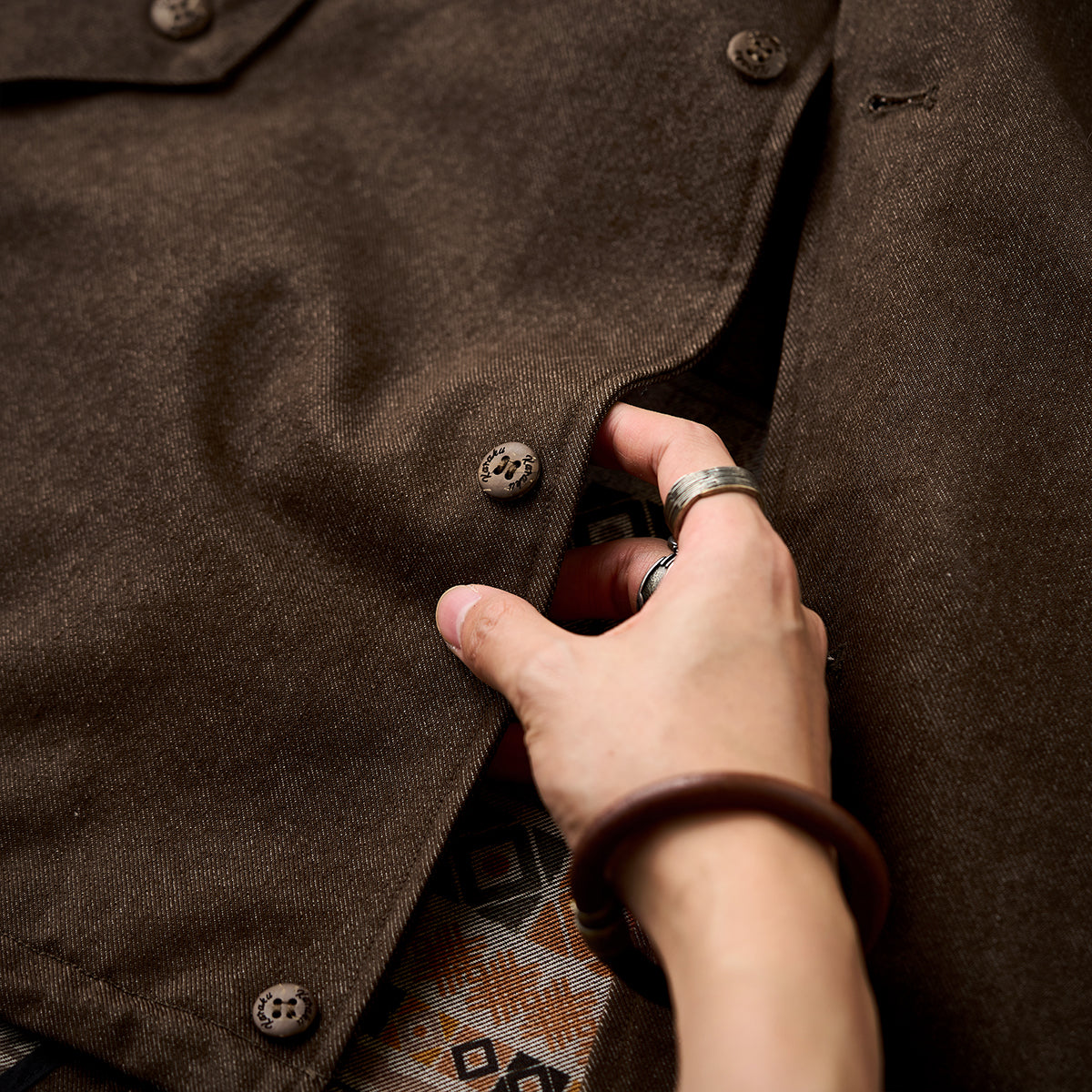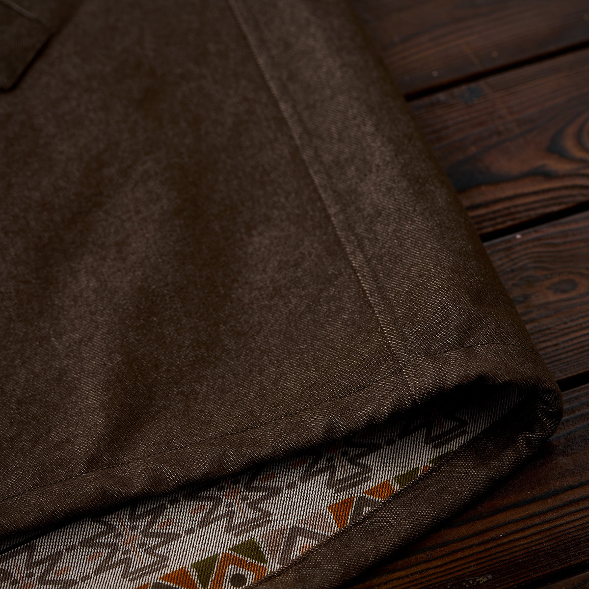 데님이나 치노팬츠와 매치하면 차분한 톤의 스타일링이 완성되며, 안감의 에스닉 패턴을 살려 내추럴 컬러 아이템과 함께 코디하는 것도 좋습니다.