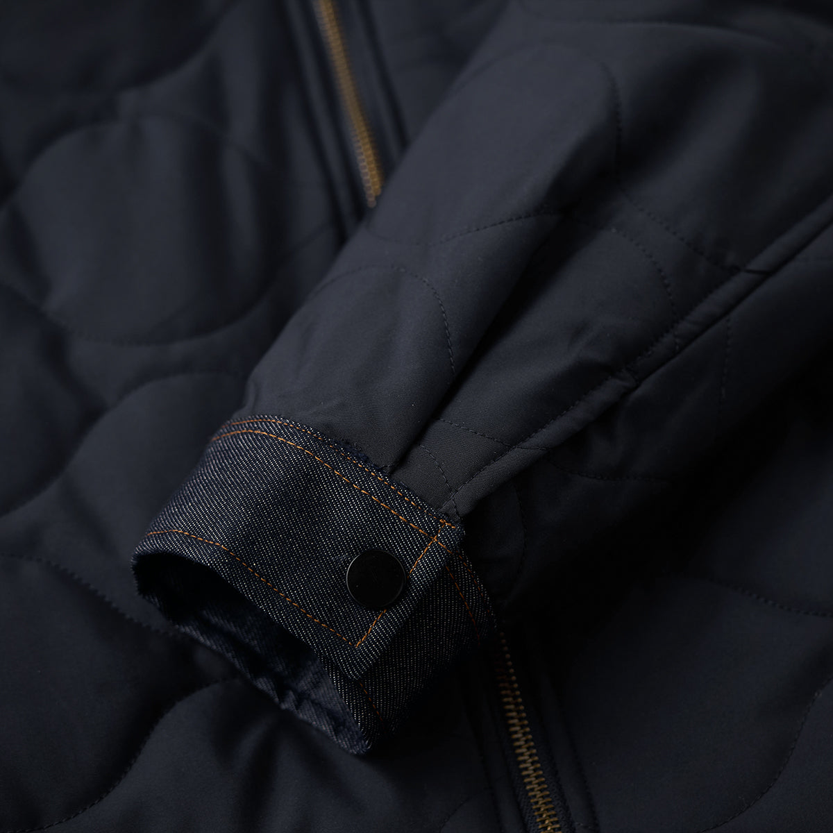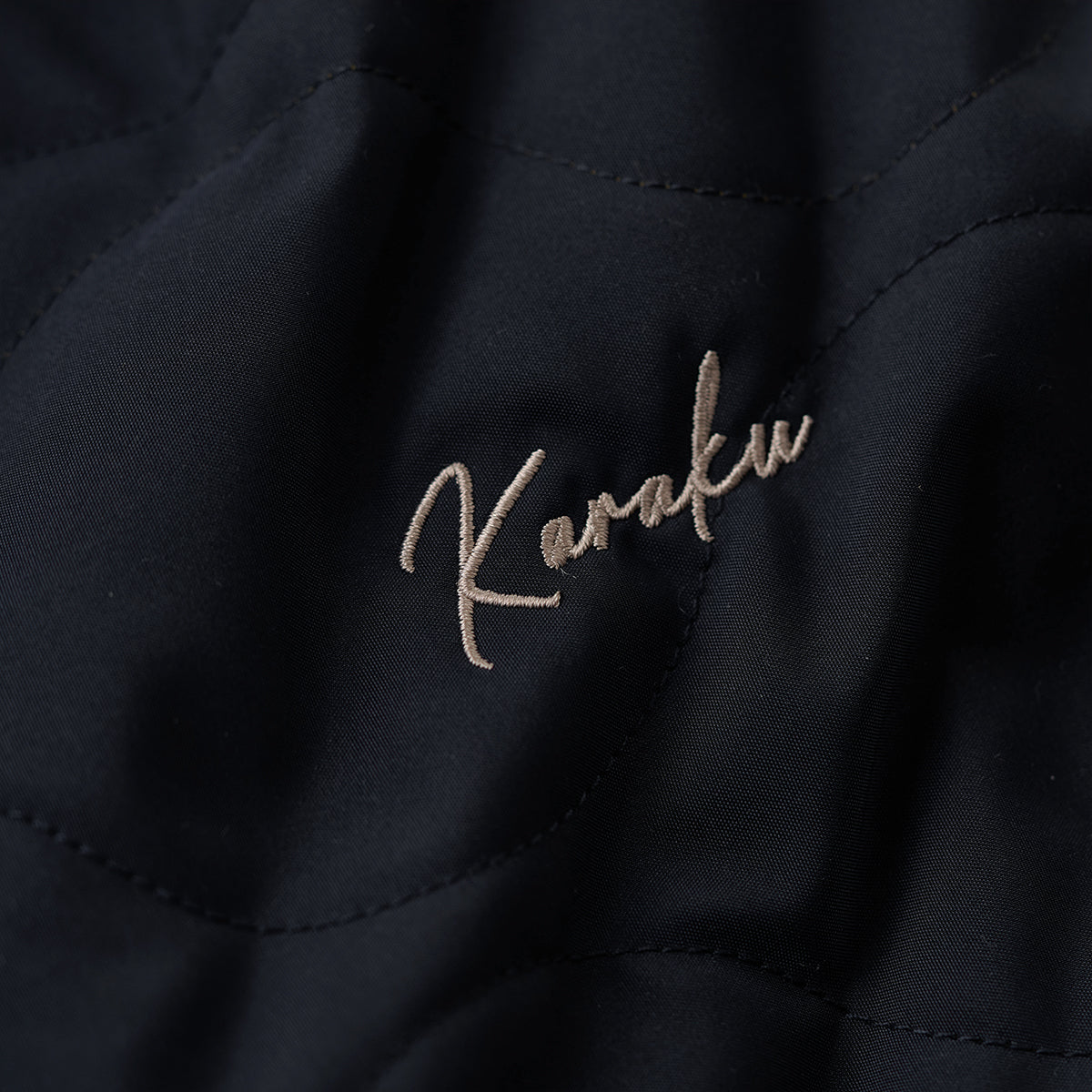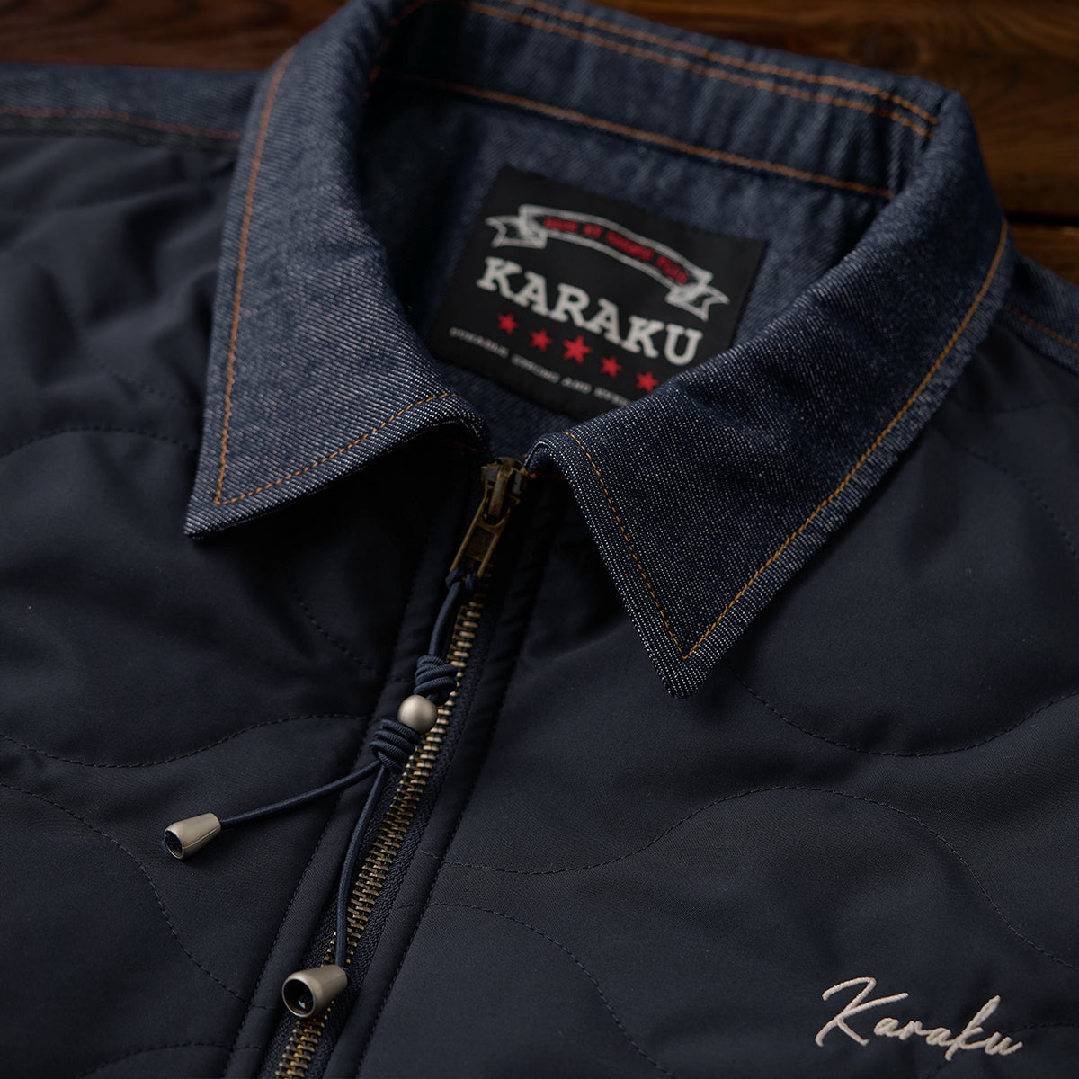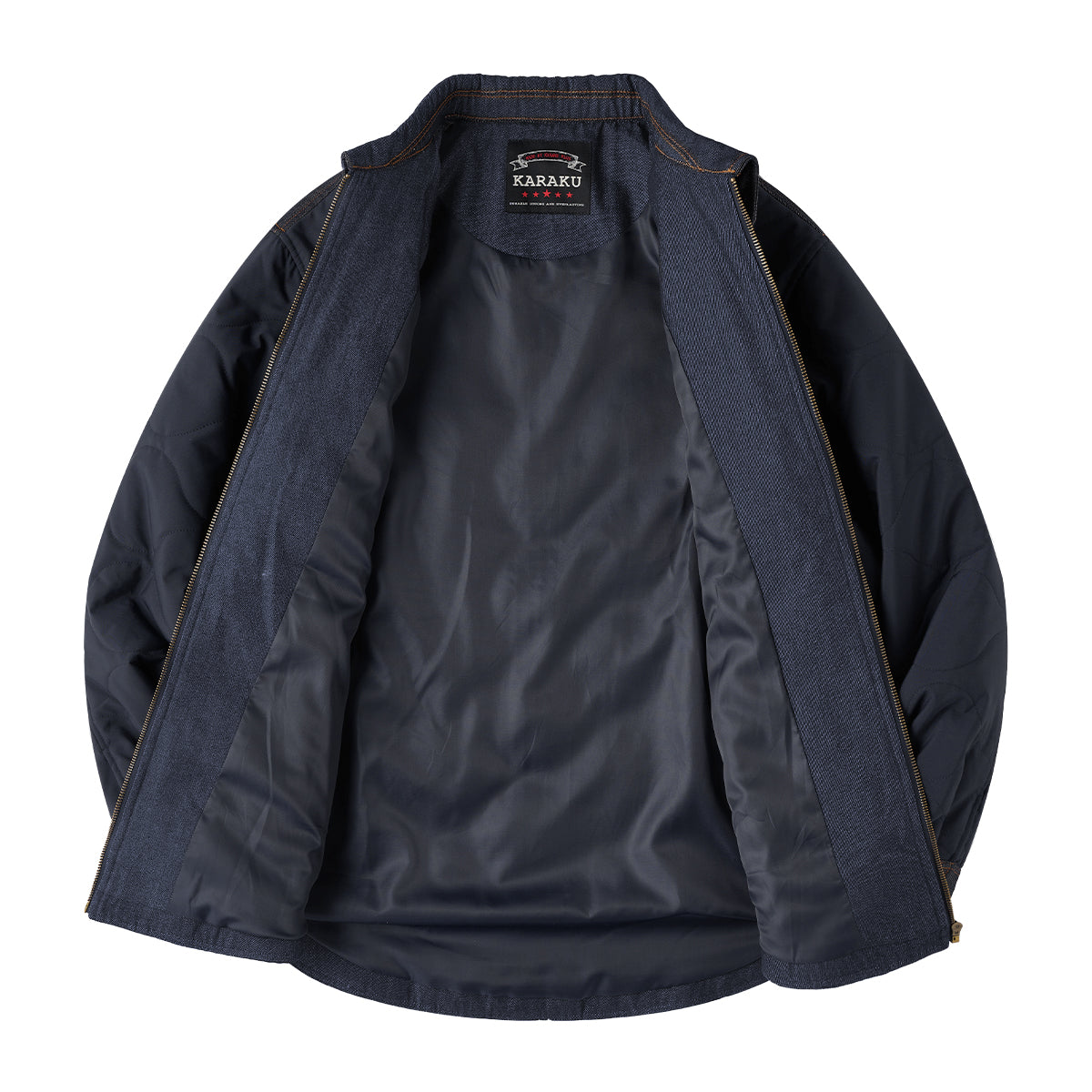 왼쪽 가슴의 은은한 Karaku 로고 자수와 금빛 지퍼, 어깨 배색 데님으로 심플하면서도 포인트 디테일이 돋보이는 솜 안감 자켓입니다.