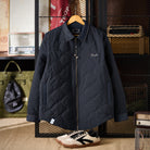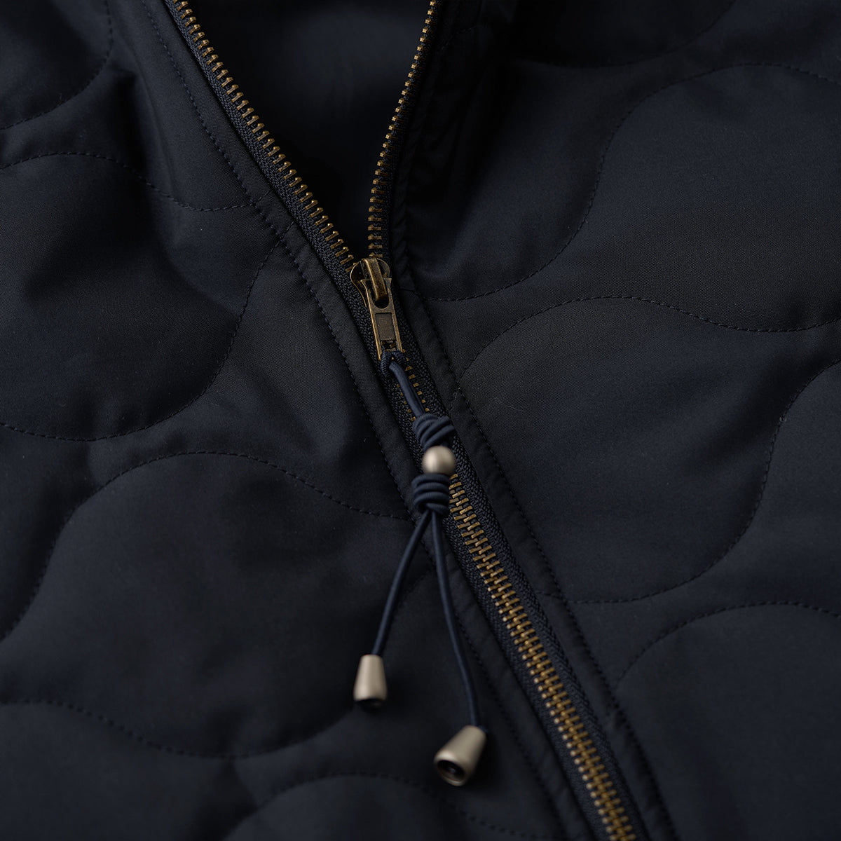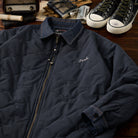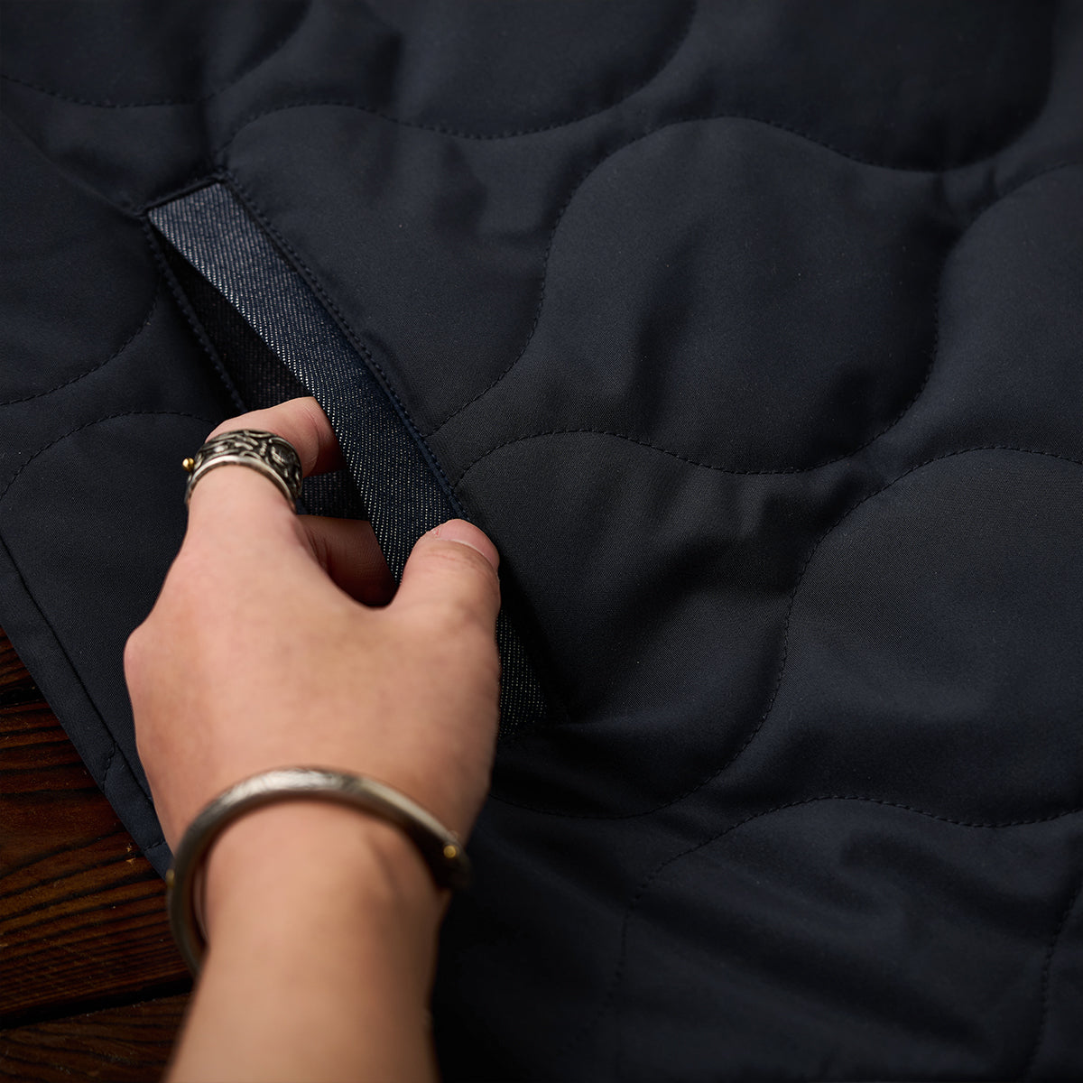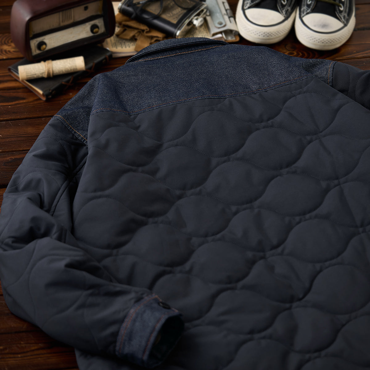 왼쪽 가슴의 은은한 Karaku 로고 자수와 금빛 지퍼, 어깨 배색 데님으로 심플하면서도 포인트 디테일이 돋보이는 솜 안감 자켓입니다.