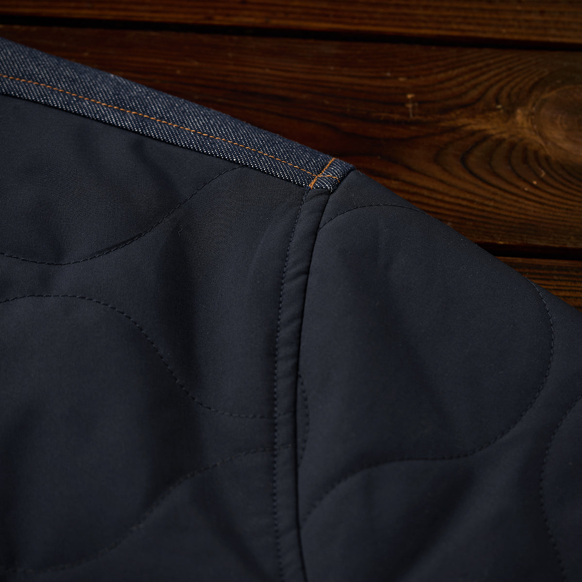 데님은 칼라, 어깨, 소맷단, 포켓에 사용해 마모가 쉬운 부분을 강화했습니다. 특히 어깨 배색은 시각적 포인트를 주며 자켓 실루엣을 한층 깔끔하게 잡아줍니다.
