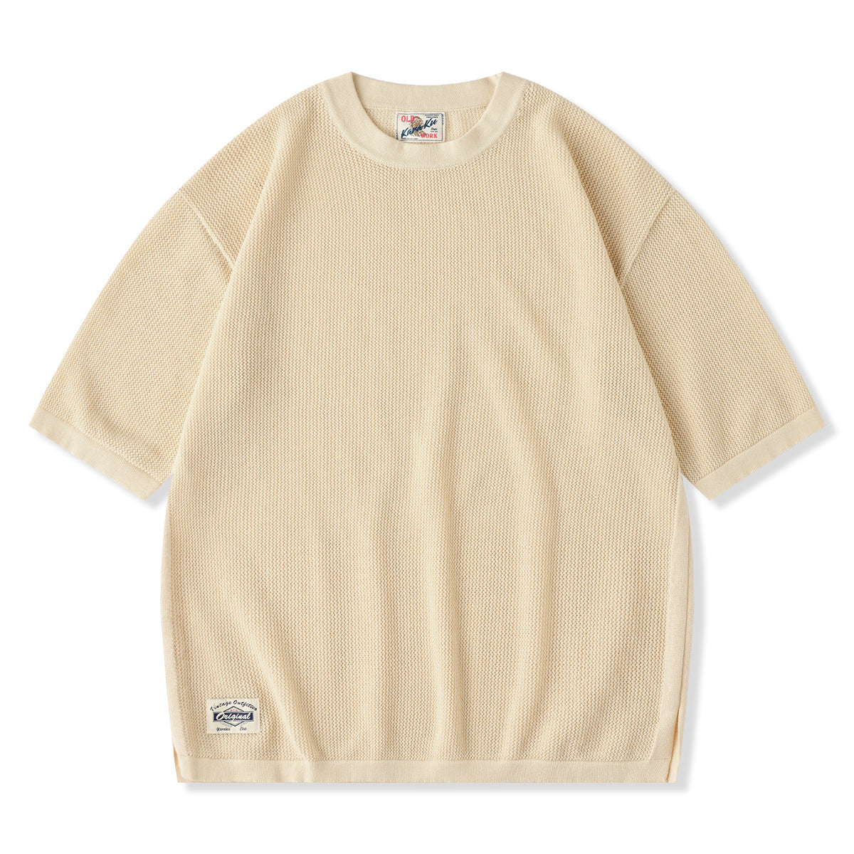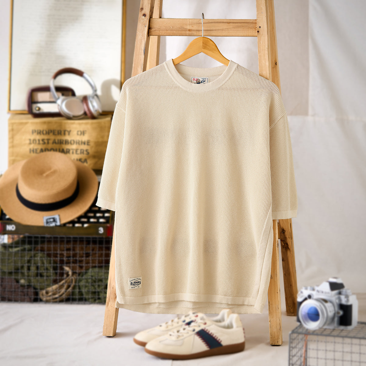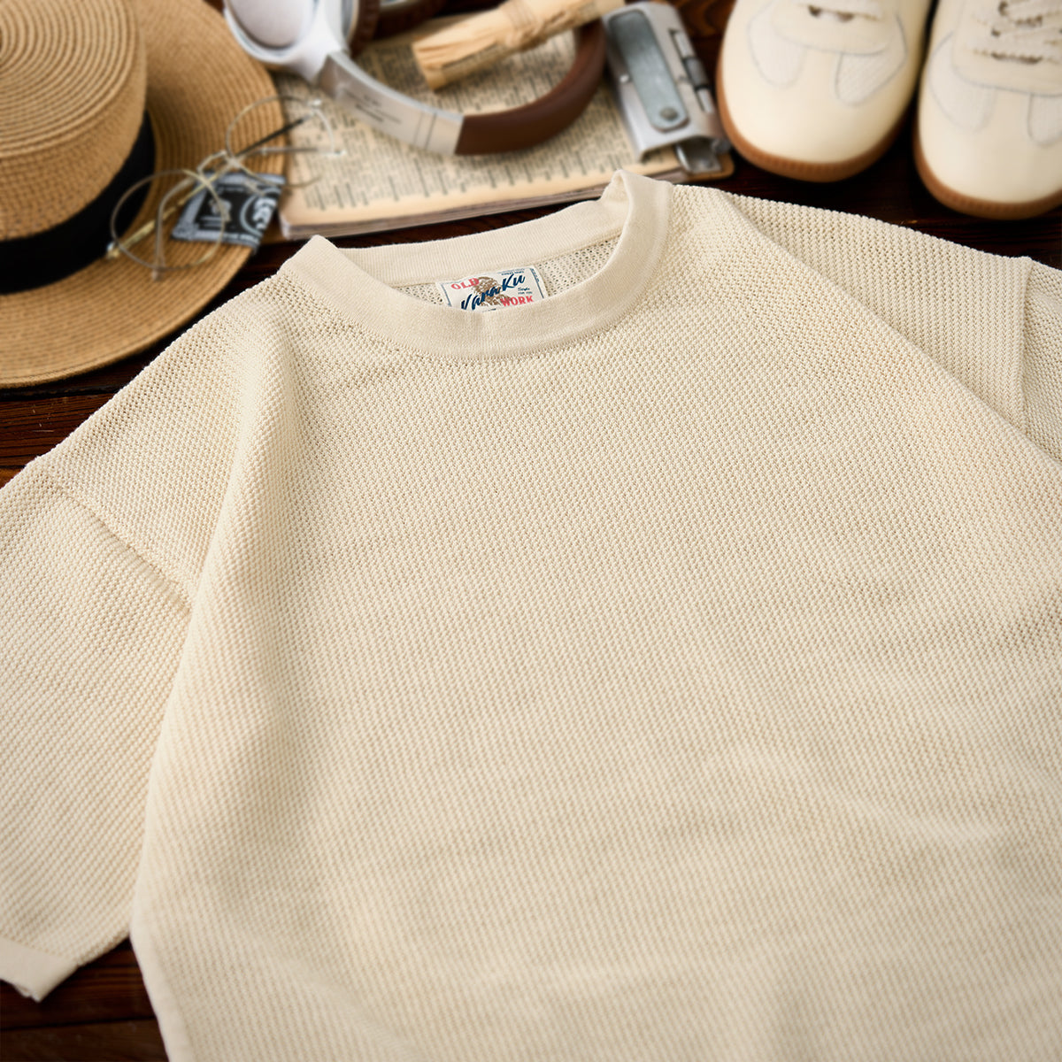 시스루 짜임과 립 디테일로 고급스러운 분위기를 더한 니트 티셔츠. 가볍고 통기성이 좋아 봄·여름에도 쾌적하게 착용할 수 있는 아이템입니다.