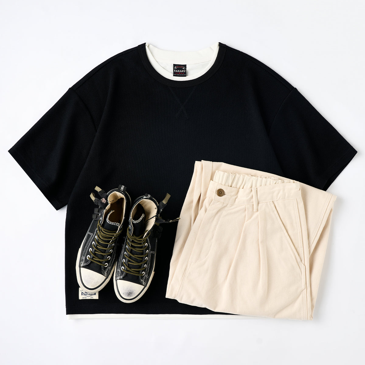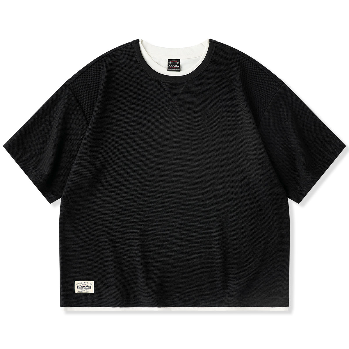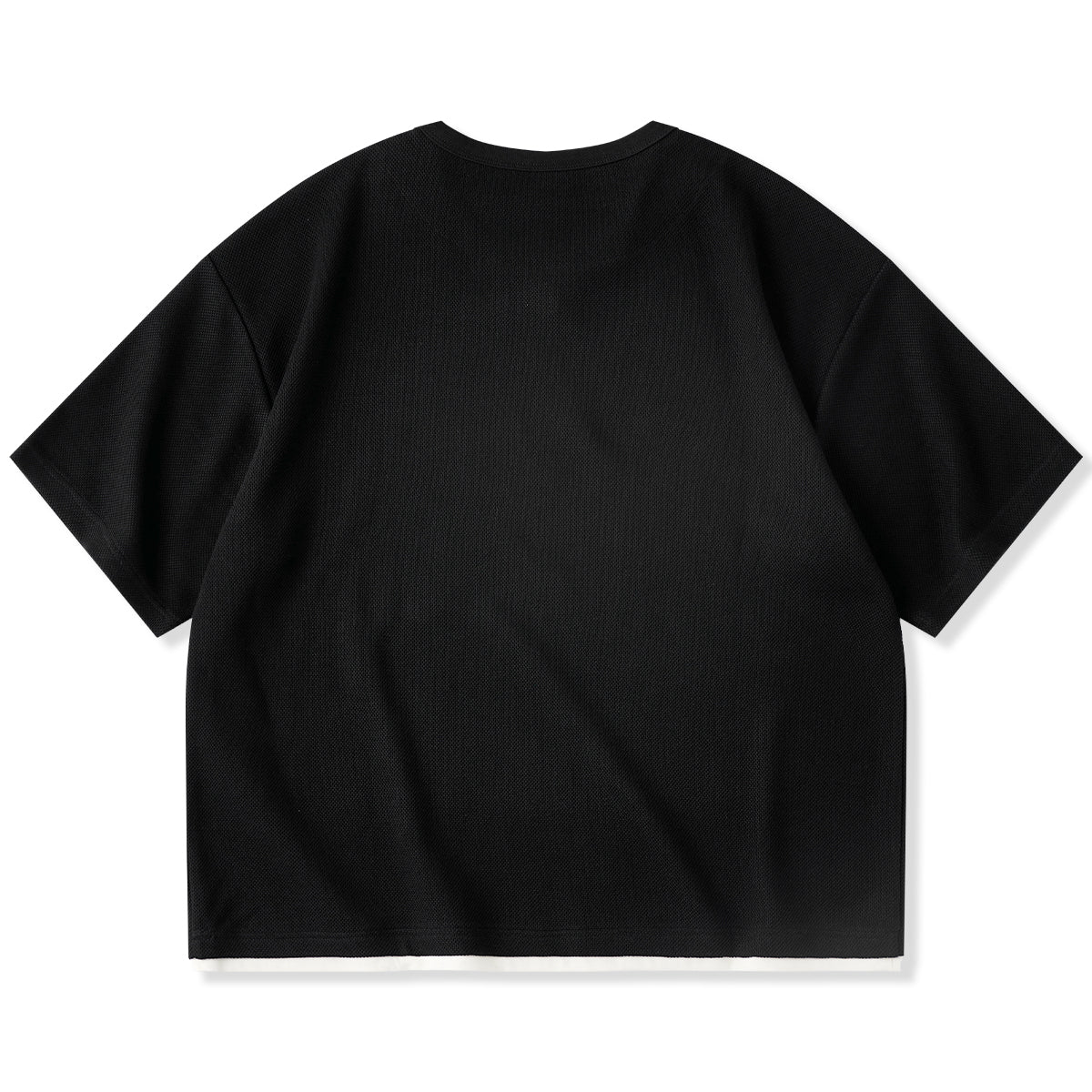 페이크 레이어드, ‘V’ 스티치, 미세한 텍스처가 돋보이는 드롭 숄더 디자인의 심플하고 세련된 티셔츠입니다.