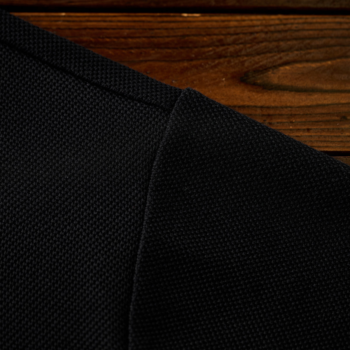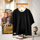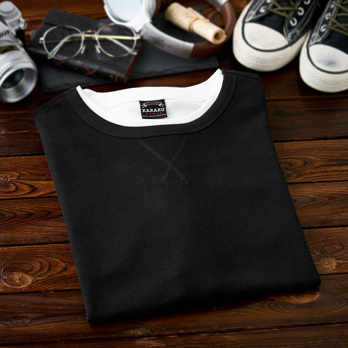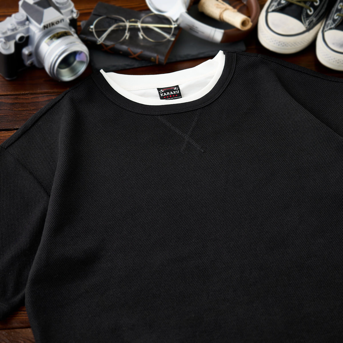 페이크 레이어드, ‘V’ 스티치, 미세한 텍스처가 돋보이는 드롭 숄더 디자인의 심플하고 세련된 티셔츠입니다.