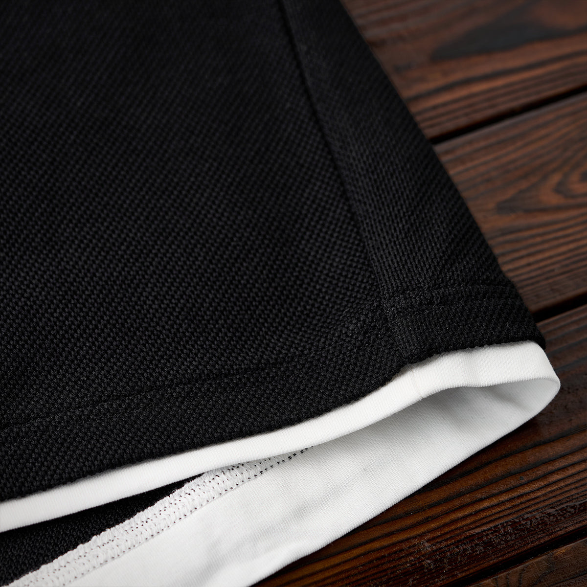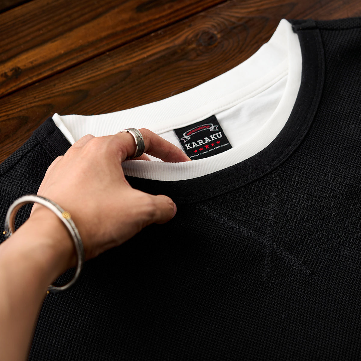목과 밑단에 페이크 레이어드 디테일이 더해져 겹쳐 입은 듯한 입체감을 연출합니다.