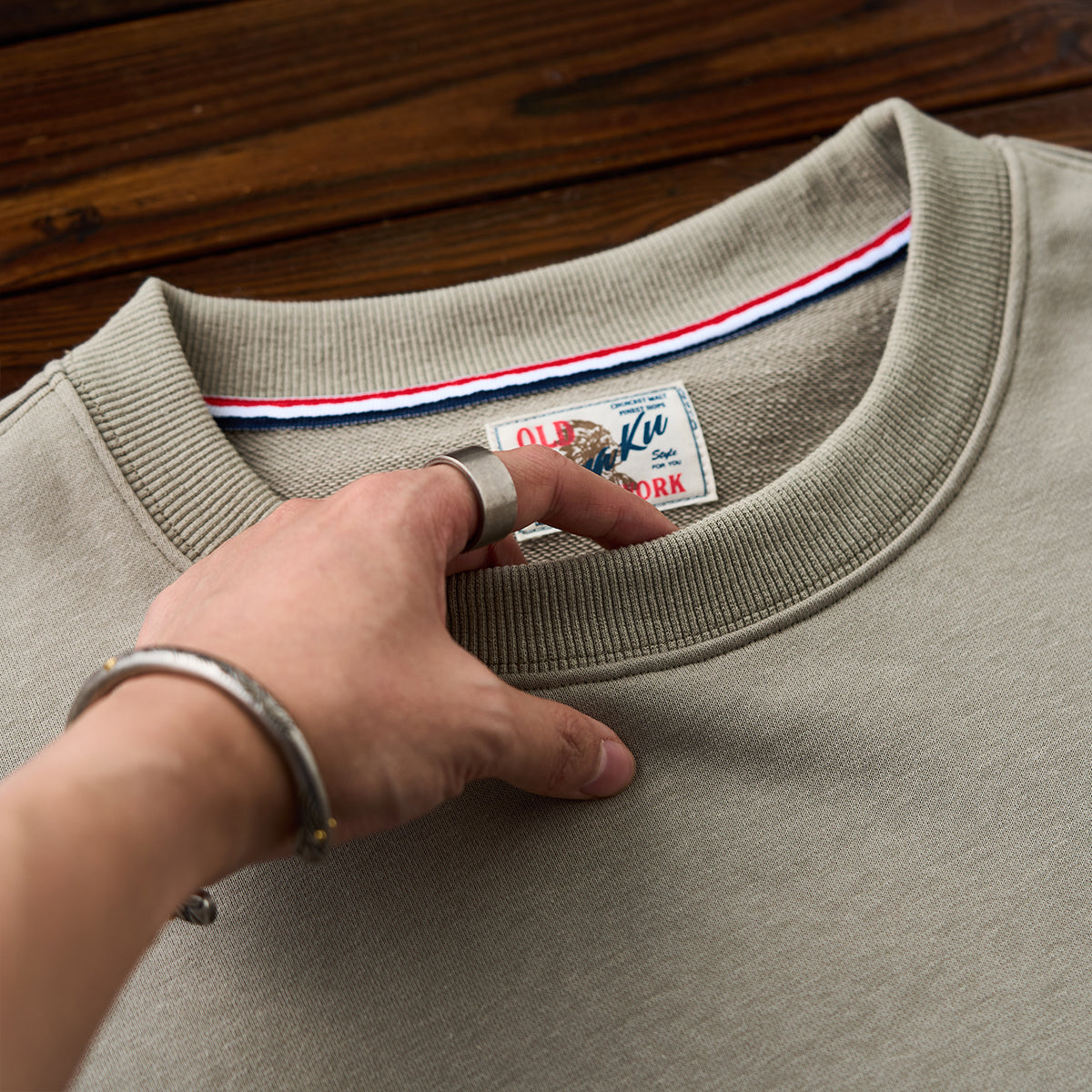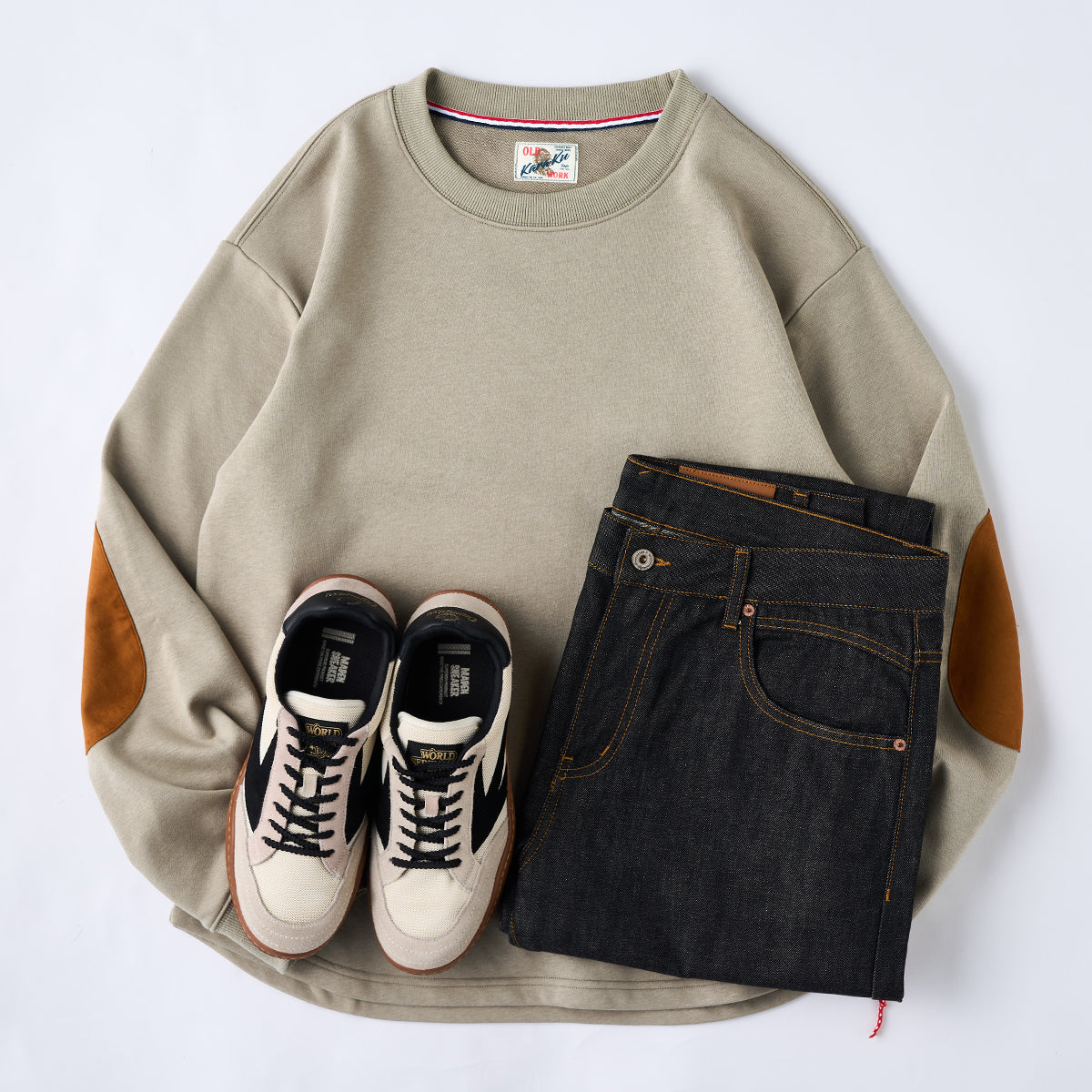 밑단의 빨간 끈과 팔꿈치 스웨이드 패치가 돋보이는 크루넥 스웨트입니다. 단독은 물론 셔츠나 아우터와의 레이어드에도 활용하기 좋습니다.