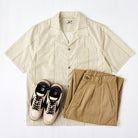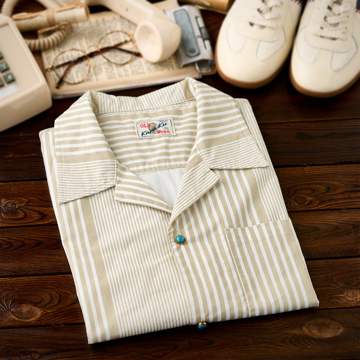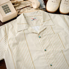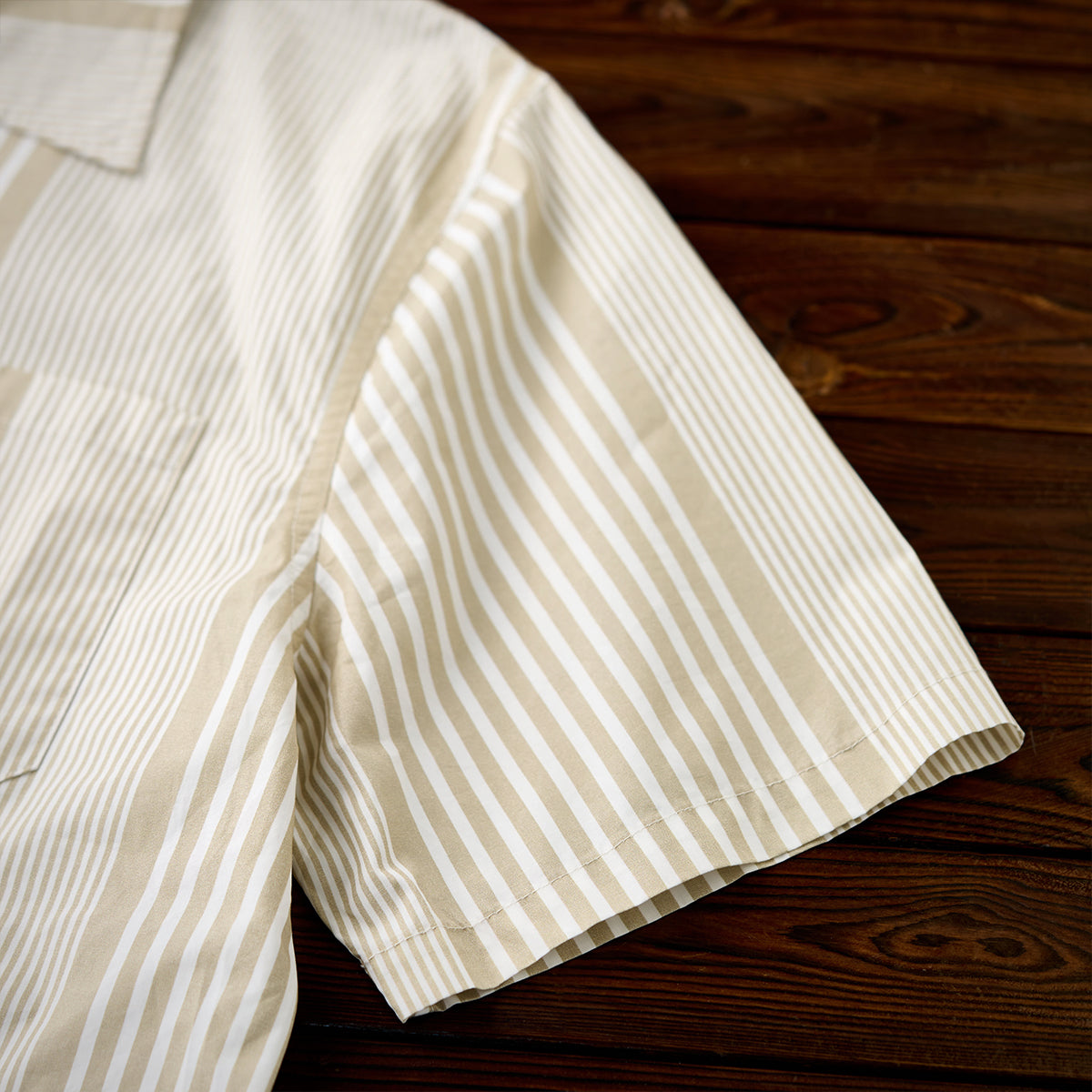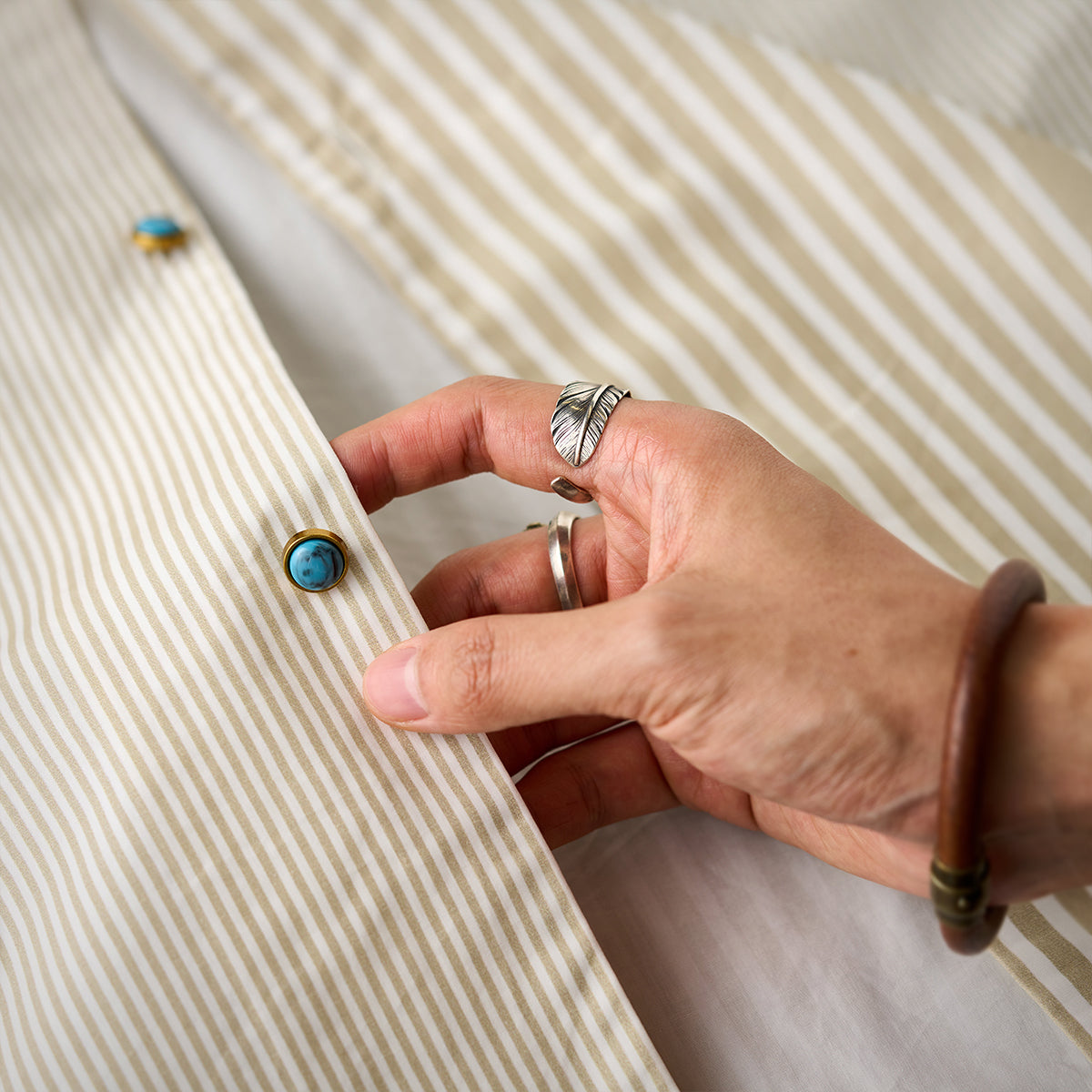 부드러운 베이지와 화이트 톤에 터키석 단추가 포인트인 오픈칼라 코튼 셔츠로, 청량한 여름 룩에 잘 어울리며 캐주얼하게 즐기기 좋은 디자인입니다.