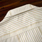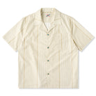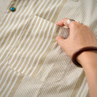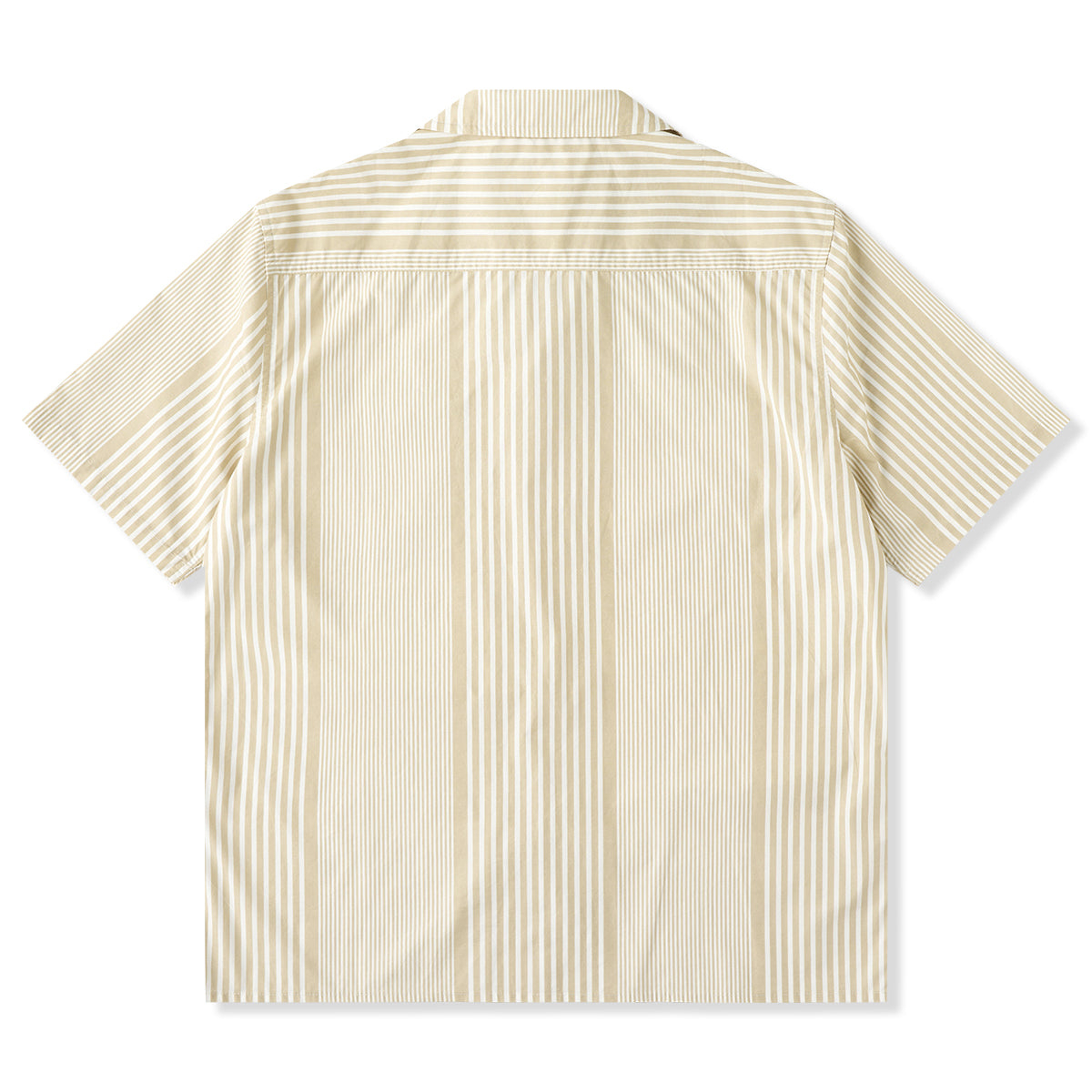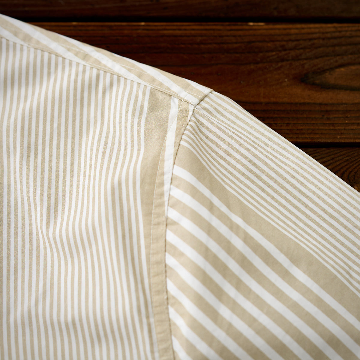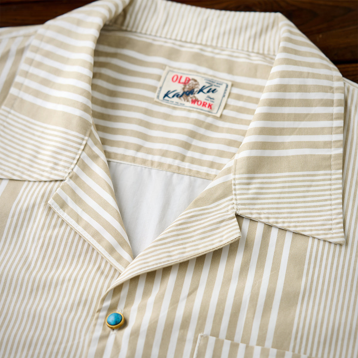 부드러운 베이지와 화이트 톤에 터키석 단추가 포인트인 오픈칼라 코튼 셔츠로, 청량한 여름 룩에 잘 어울리며 캐주얼하게 즐기기 좋은 디자인입니다.