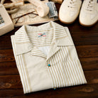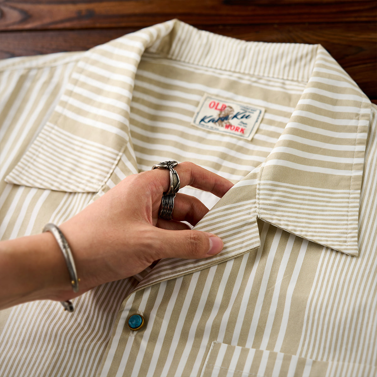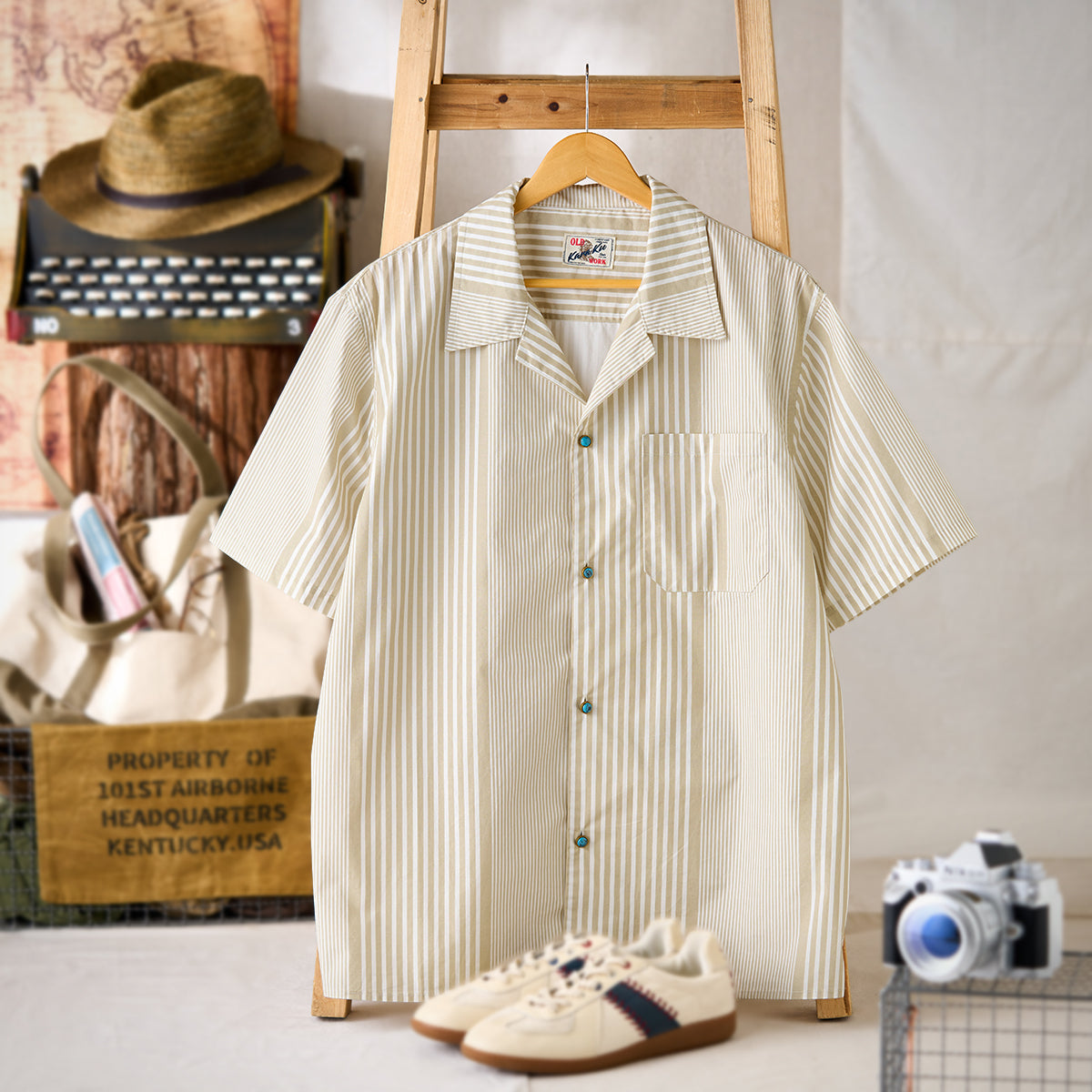 터키석 단추 스트라이프 코튼 오픈칼라 셔츠