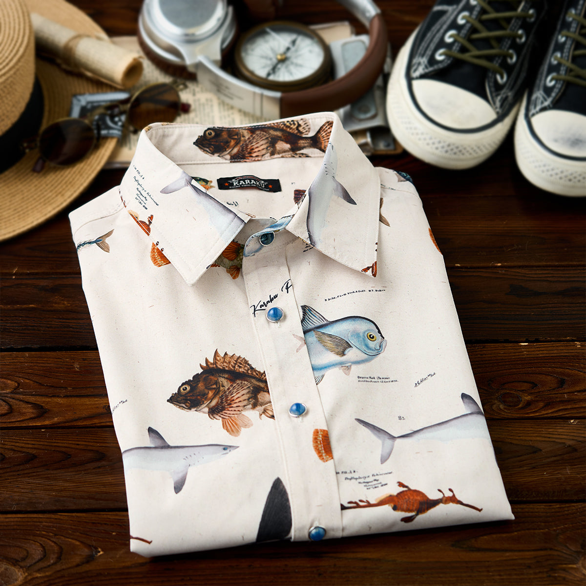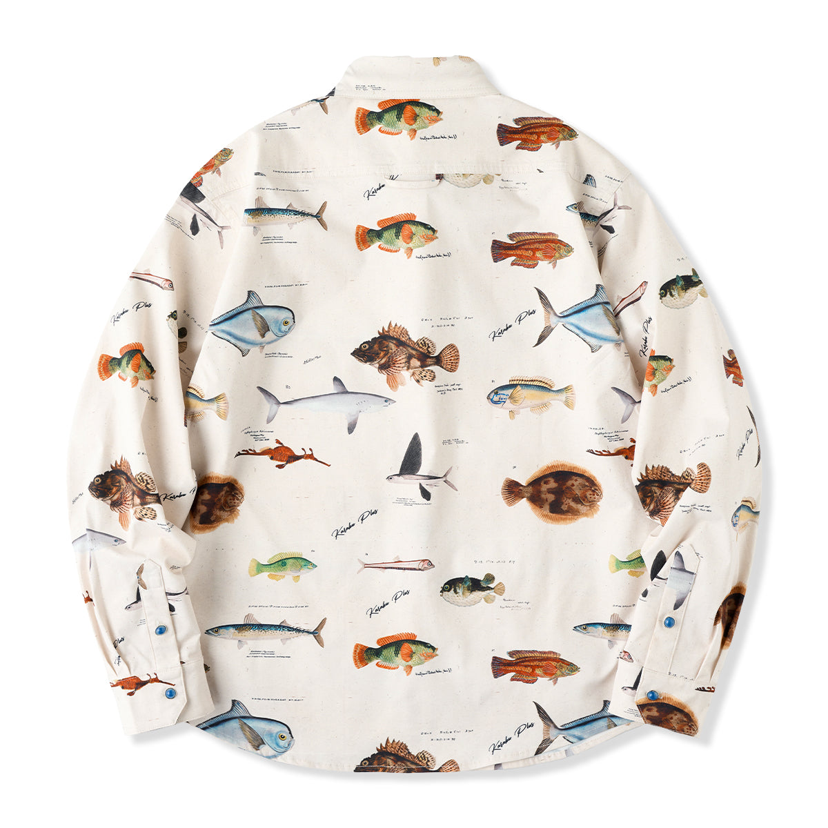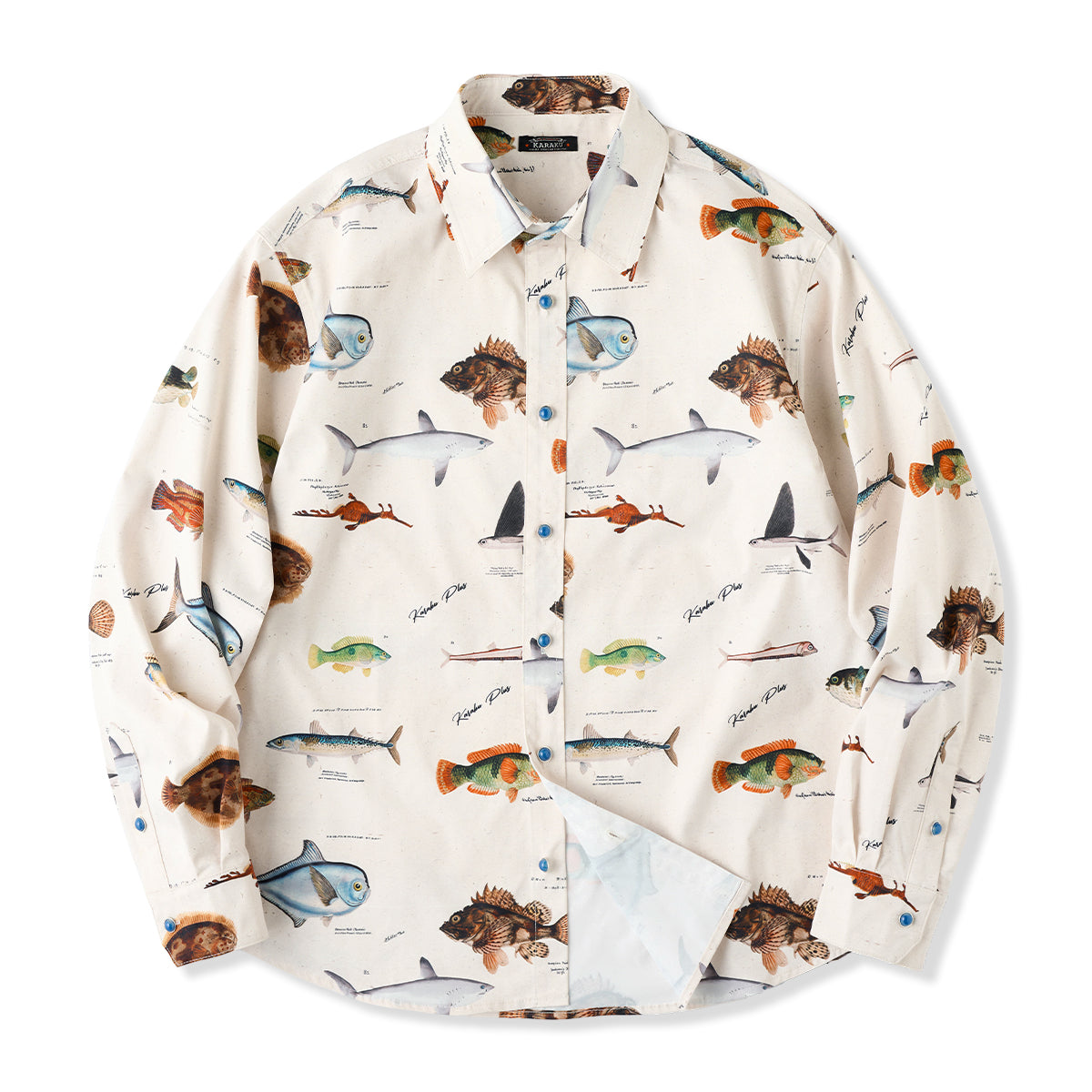 「생물도감·심해어」패턴 오더메이드 버튼 긴팔 셔츠