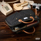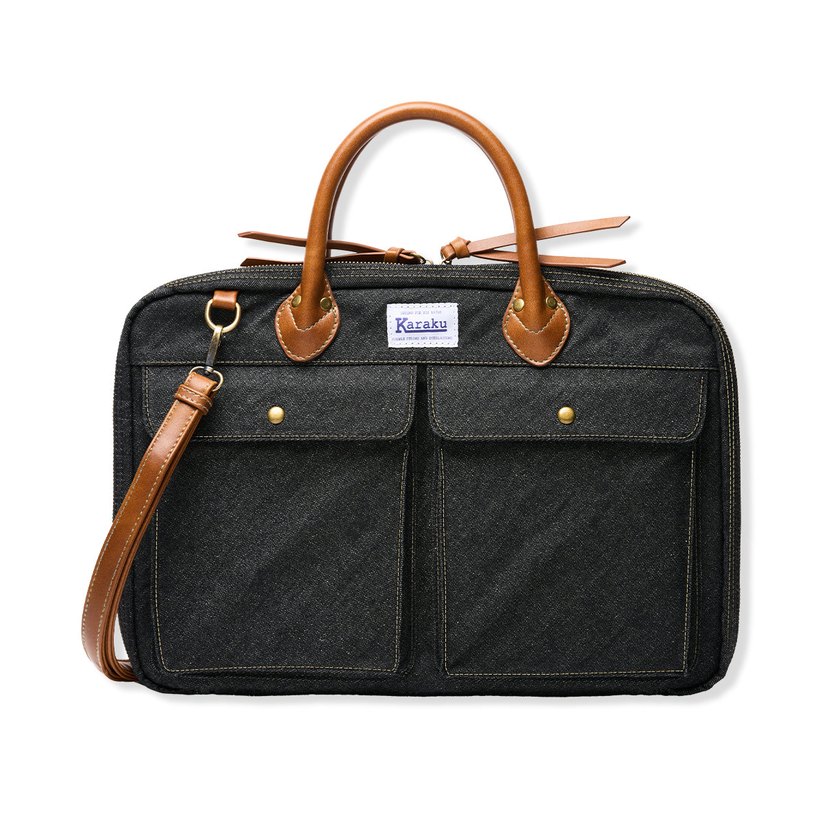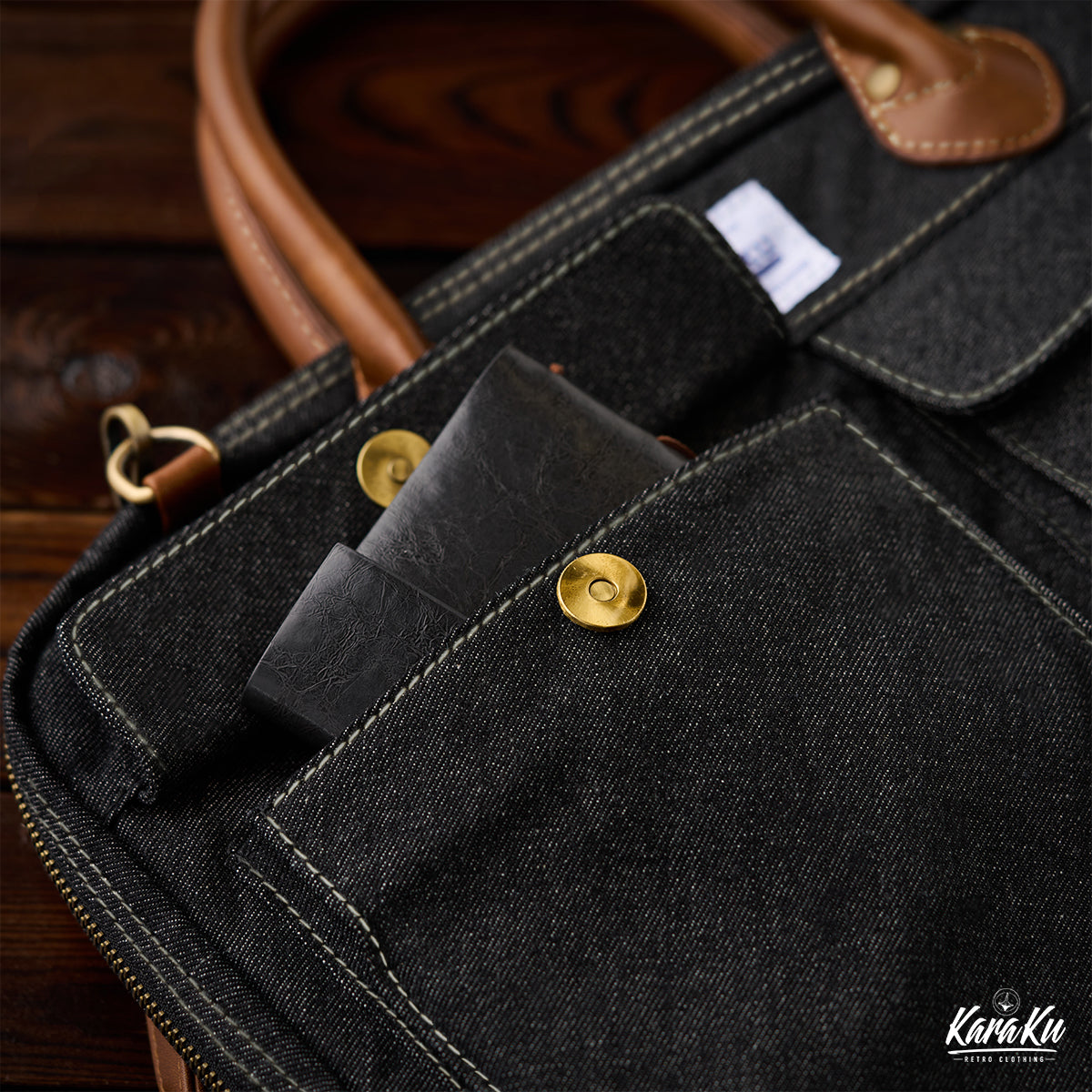 Karaku 서류 가방은 고급 합성 가죽과 데님 조합으로 스타일리시한 디자인을 갖추고 있습니다.