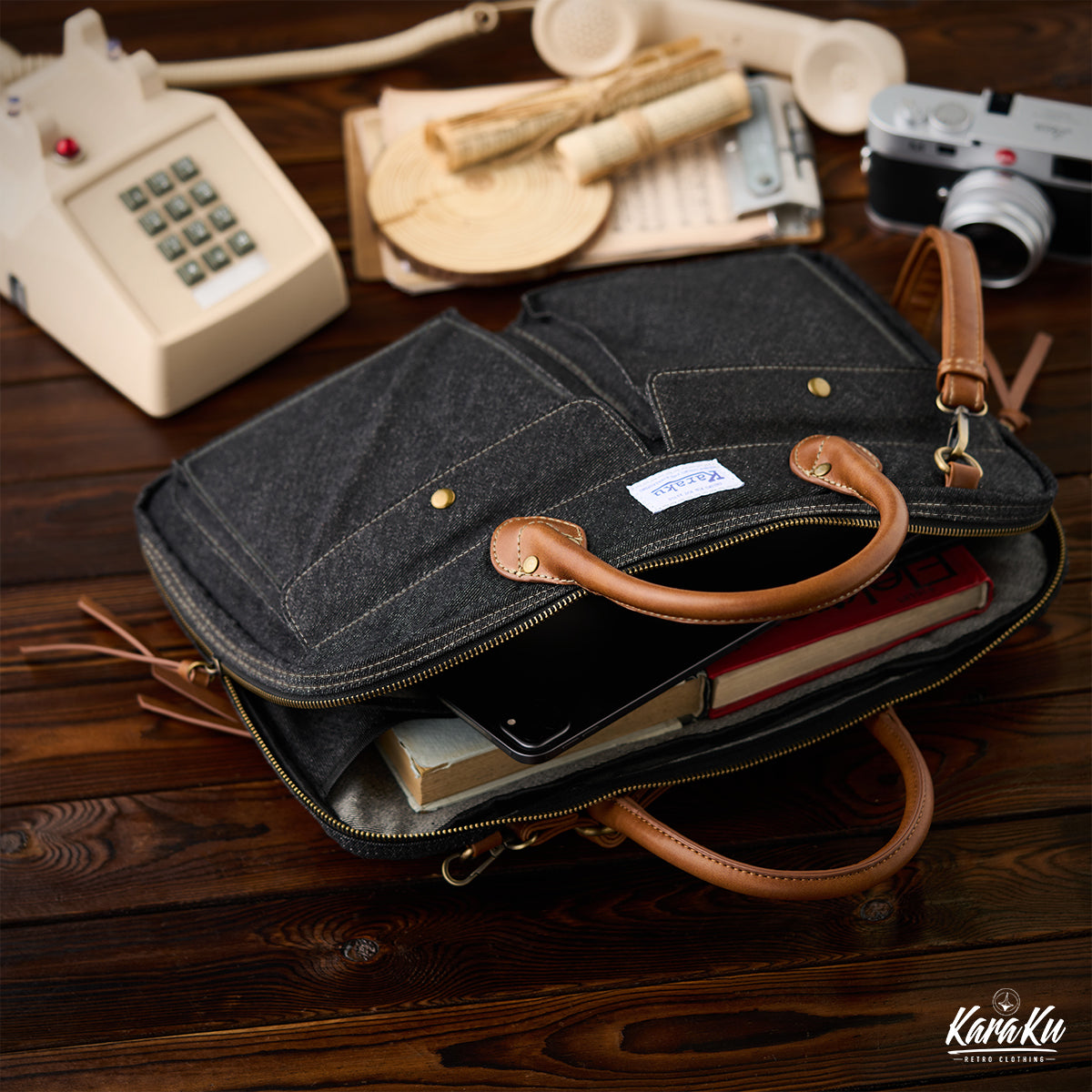 세련된 디자인과 실용성을 갖춘 Karaku 서류 가방, 넉넉한 수납과 노트북 보호 기능으로 다양한 스타일에 어울립니다.