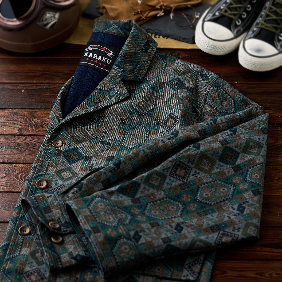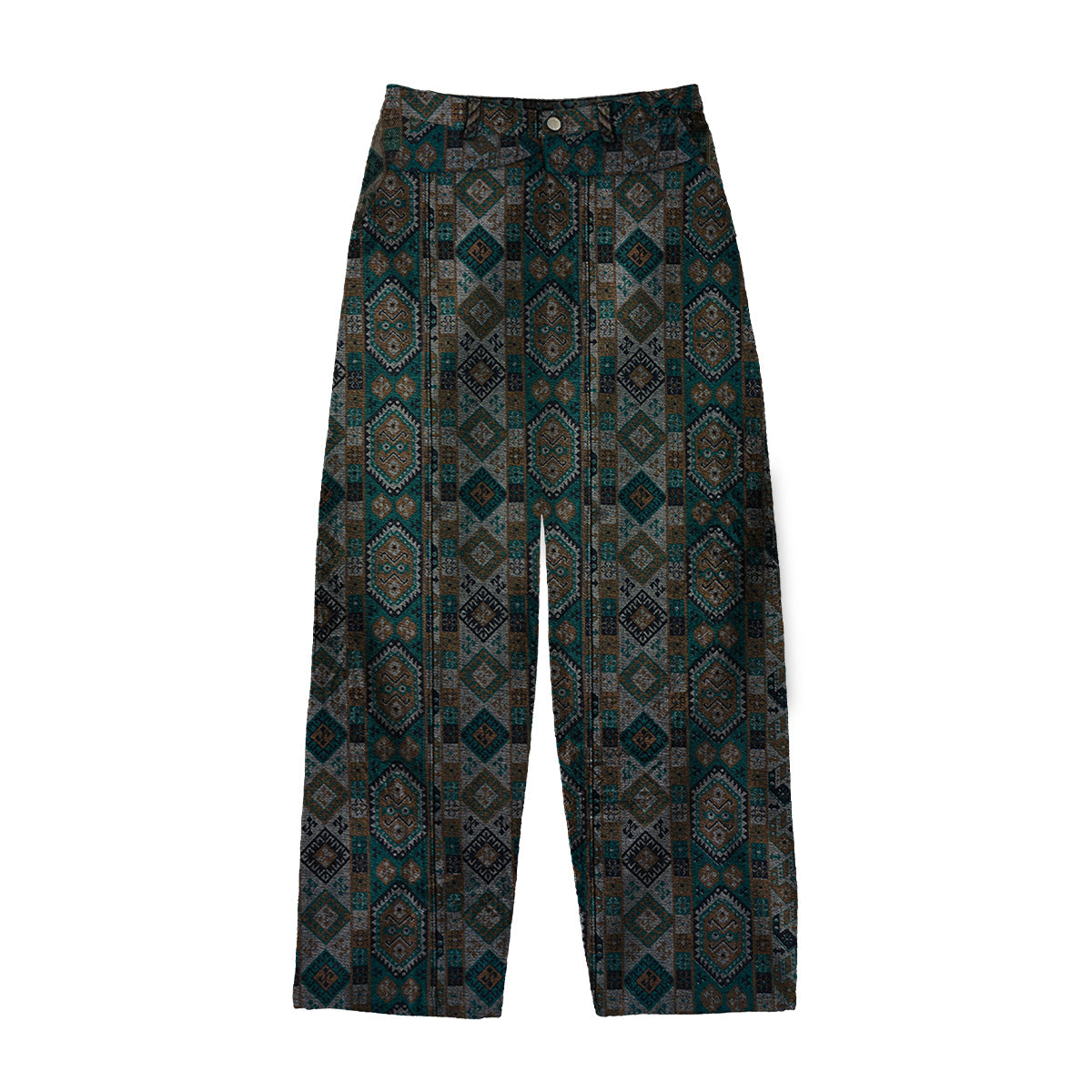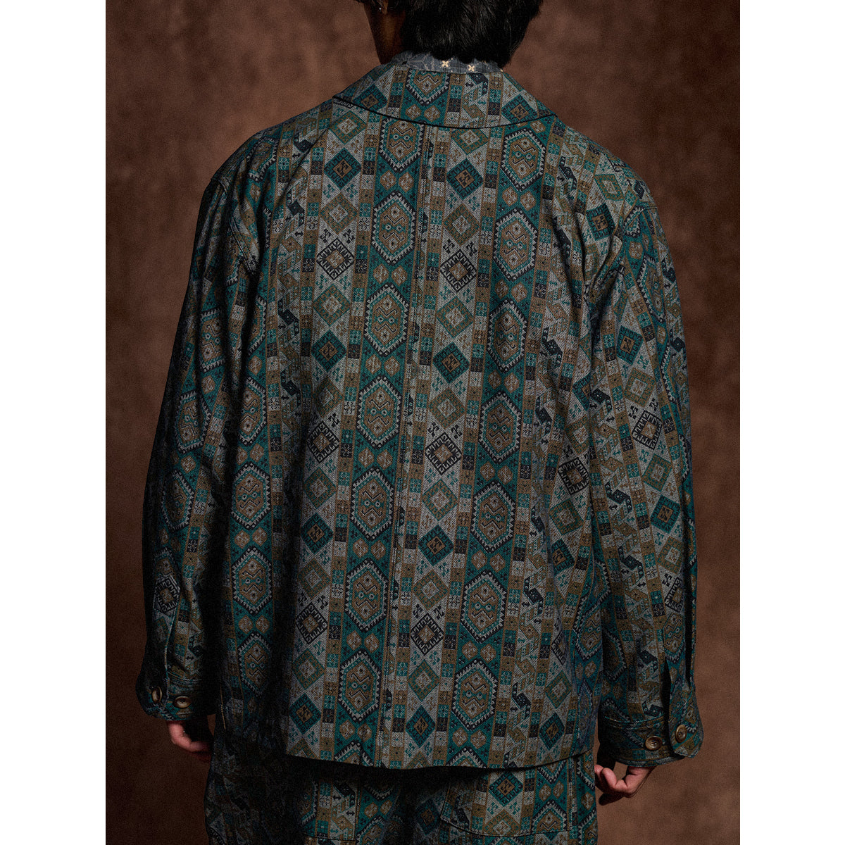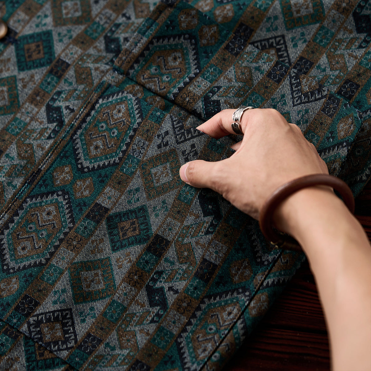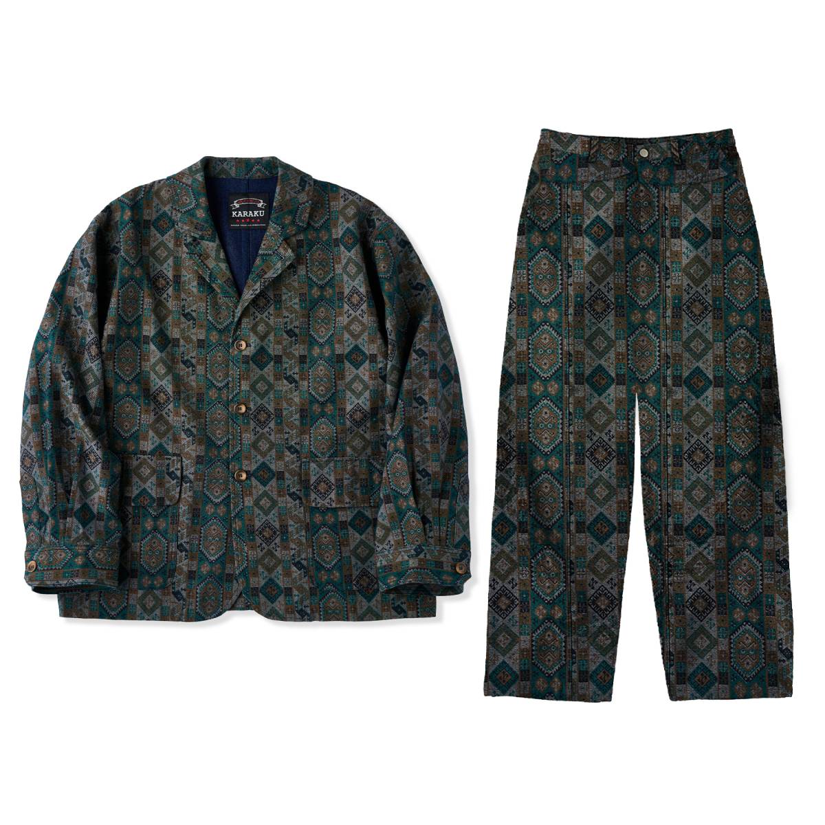 에스닉 스타일의 기하학 패턴이 돋보이는 자켓 & 슬랙스 세트로, 다이아몬드형과 육각형 중심의 대칭적 반복 디자인이 세로 방향으로 연속 배치되어 전체적인 통일감을 줍니다.