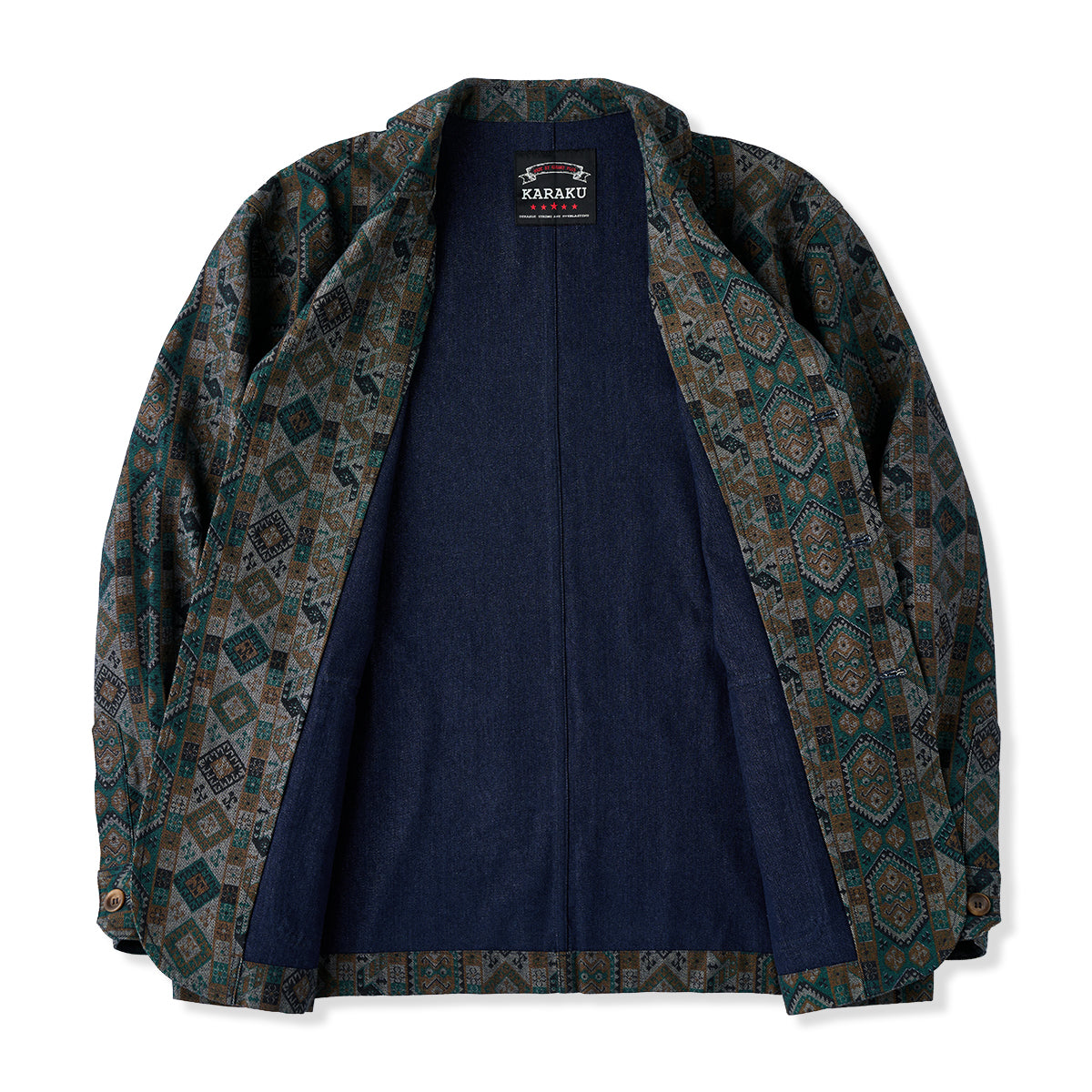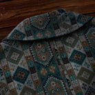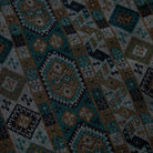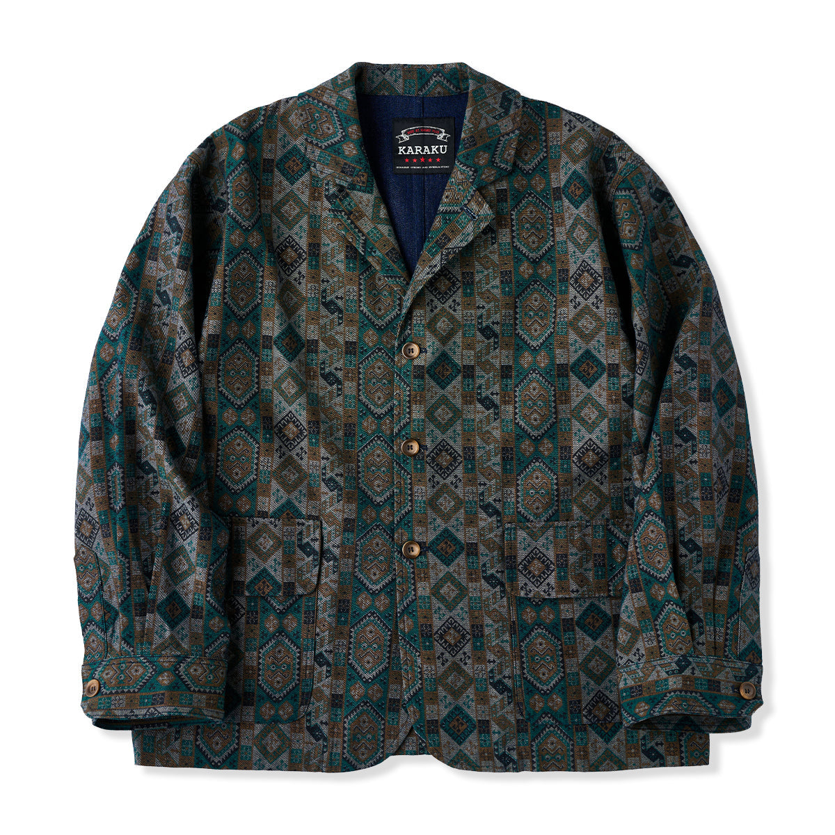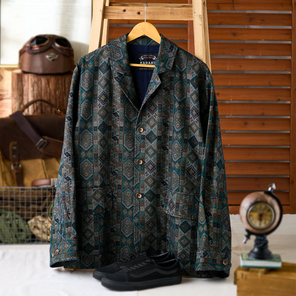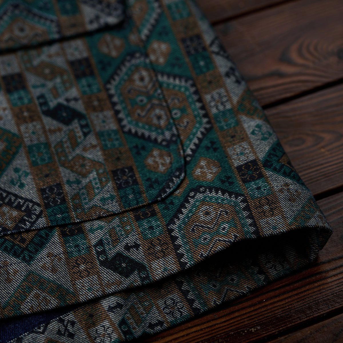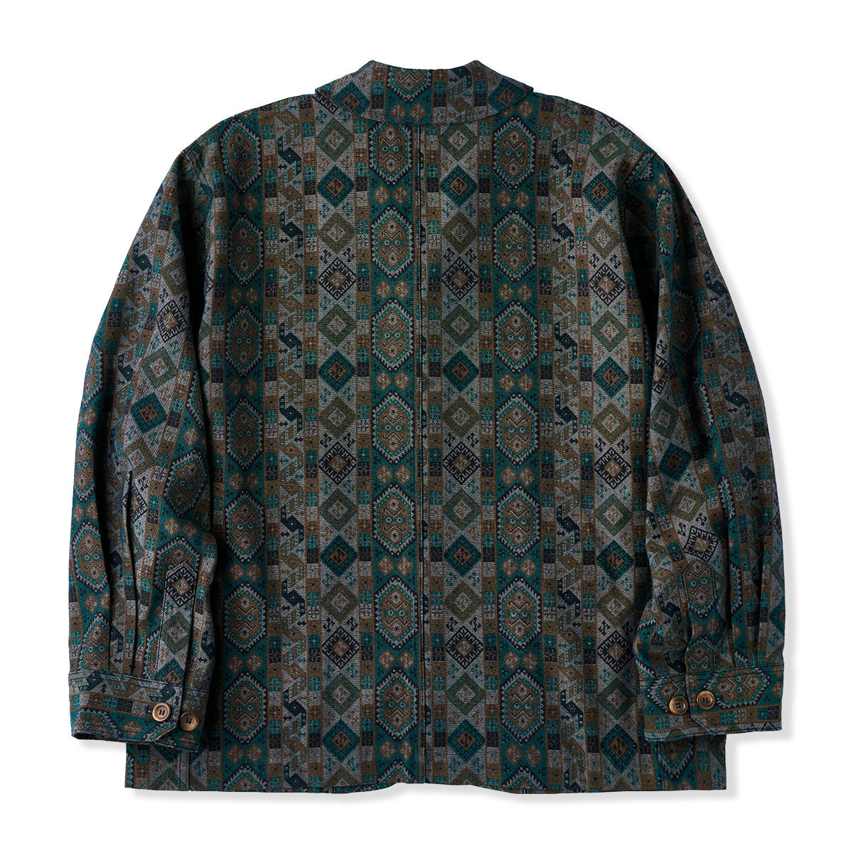 에스닉 스타일의 기하학 패턴이 돋보이는 자켓 & 슬랙스 세트로, 다이아몬드형과 육각형 중심의 대칭적 반복 디자인이 세로 방향으로 연속 배치되어 전체적인 통일감을 줍니다.