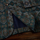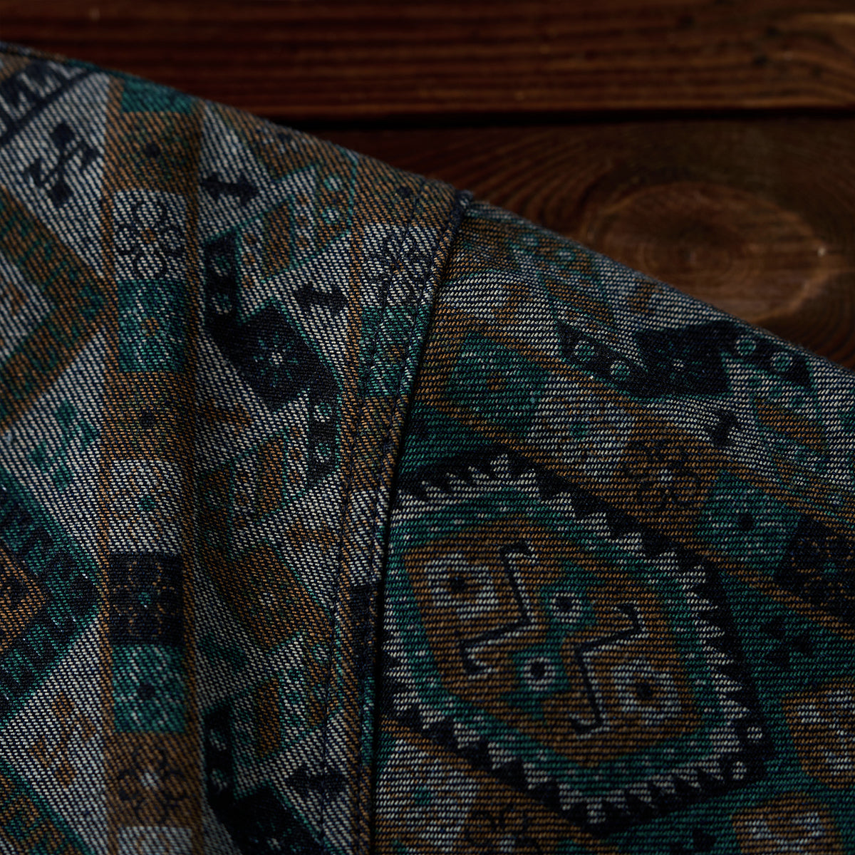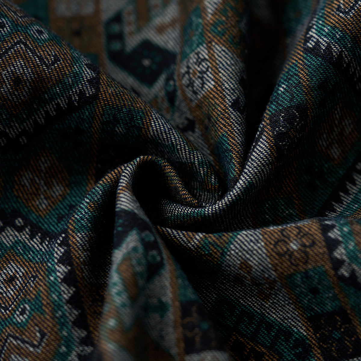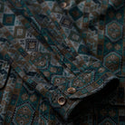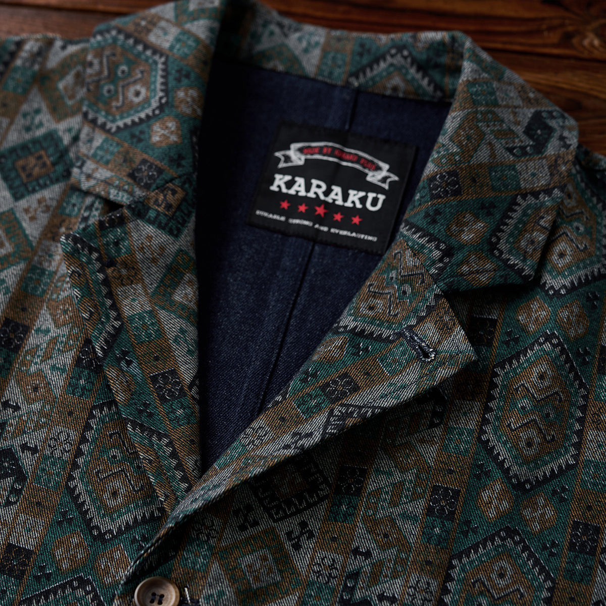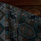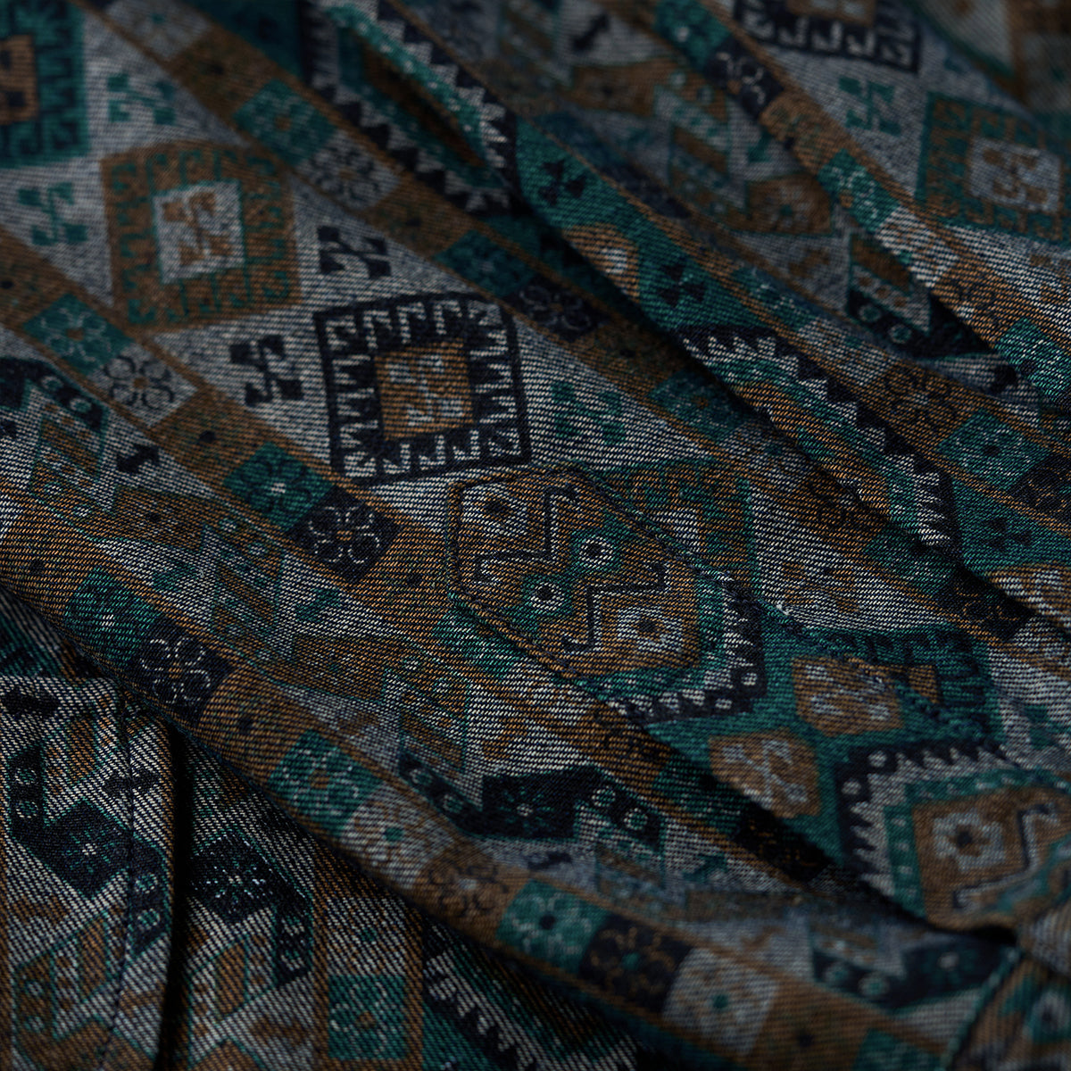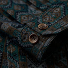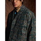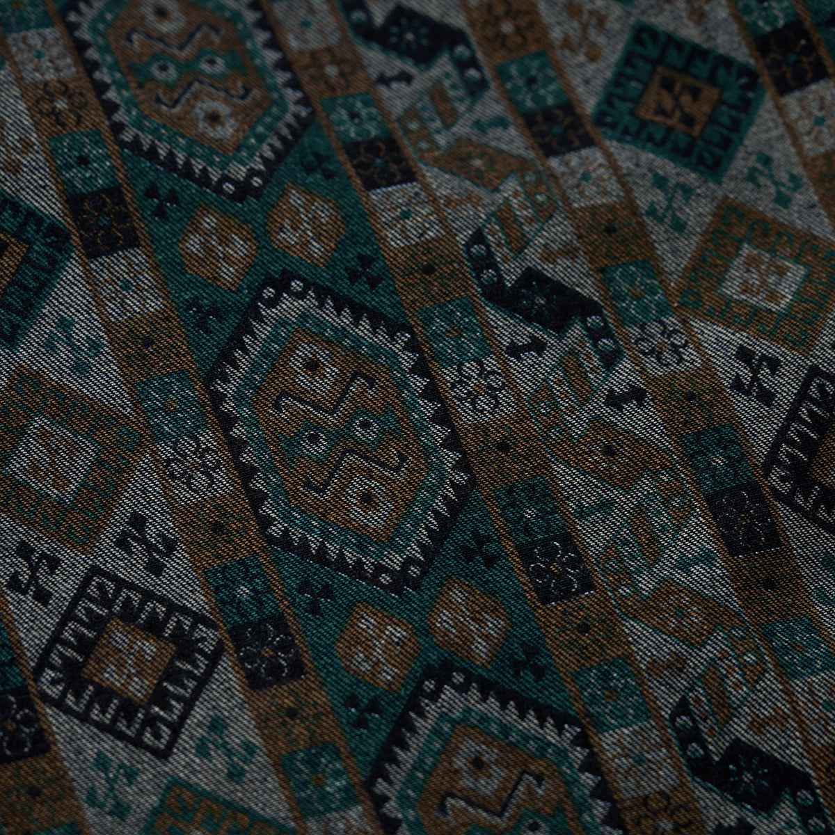 에스닉 스타일의 기하학 패턴이 돋보이는 자켓 & 슬랙스 세트로, 다이아몬드형과 육각형 중심의 대칭적 반복 디자인이 세로 방향으로 연속 배치되어 전체적인 통일감을 줍니다.