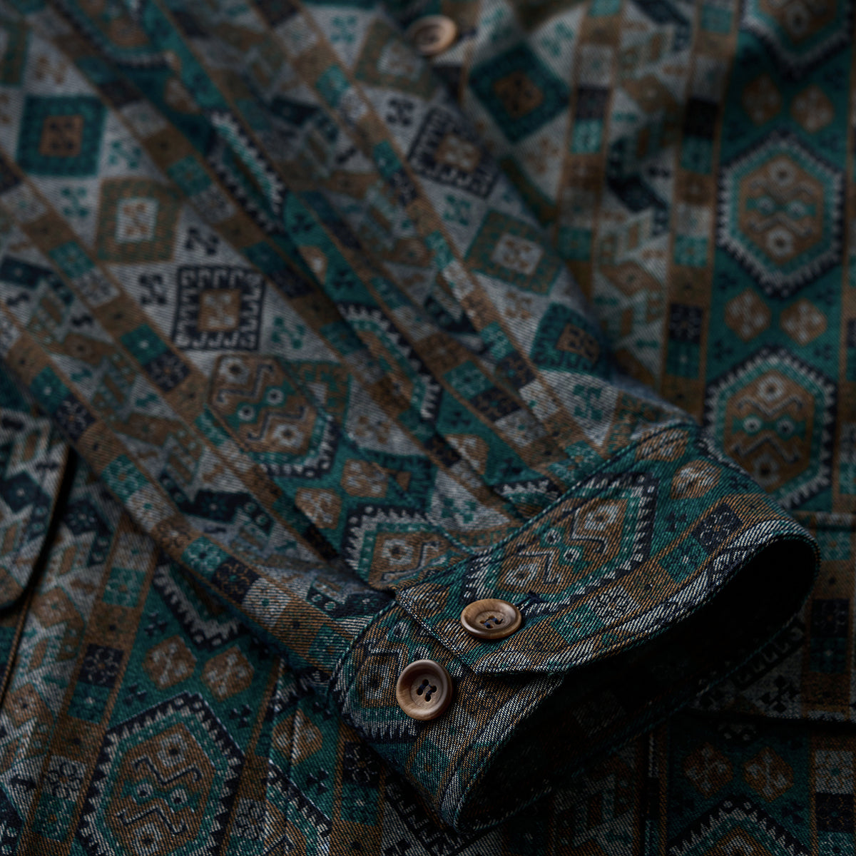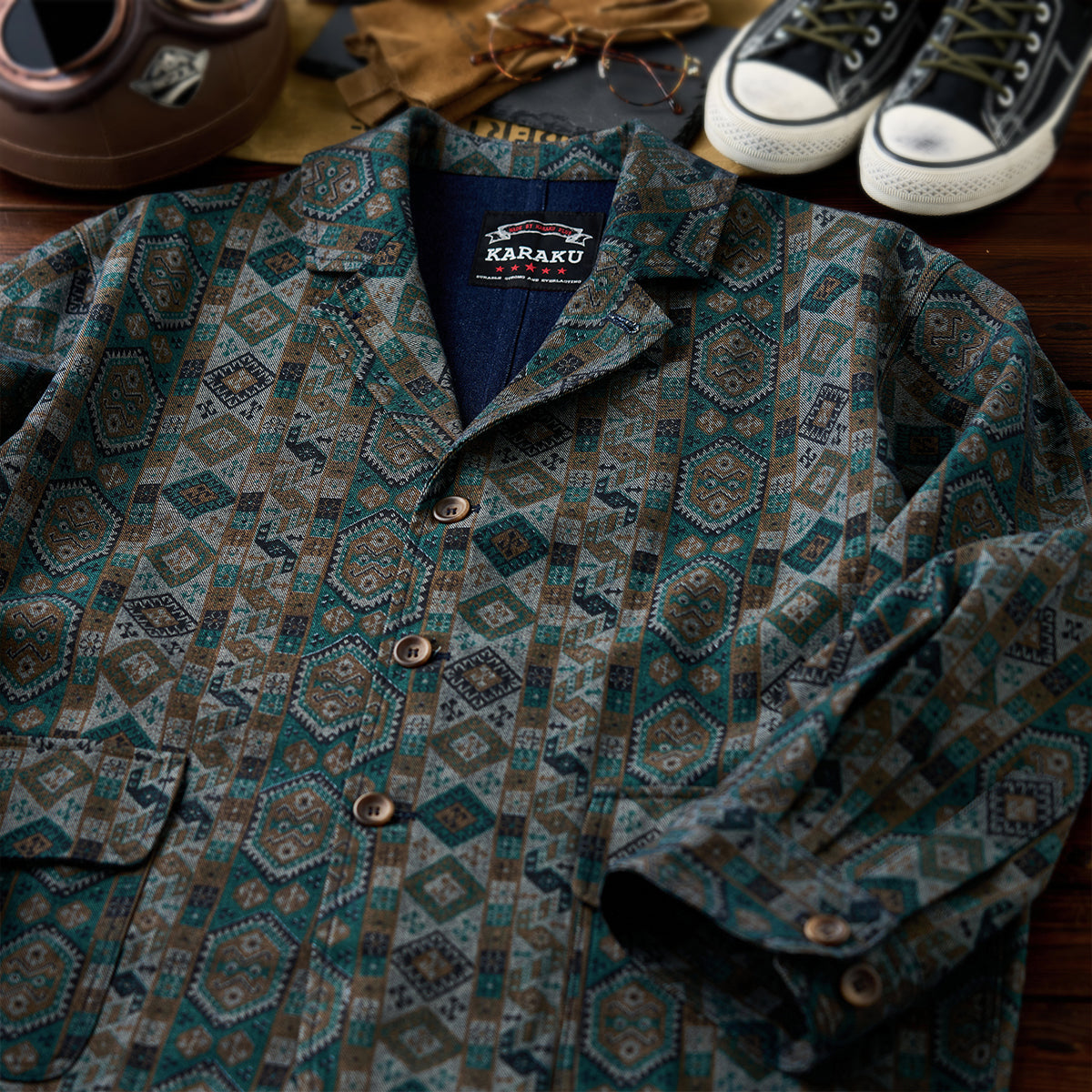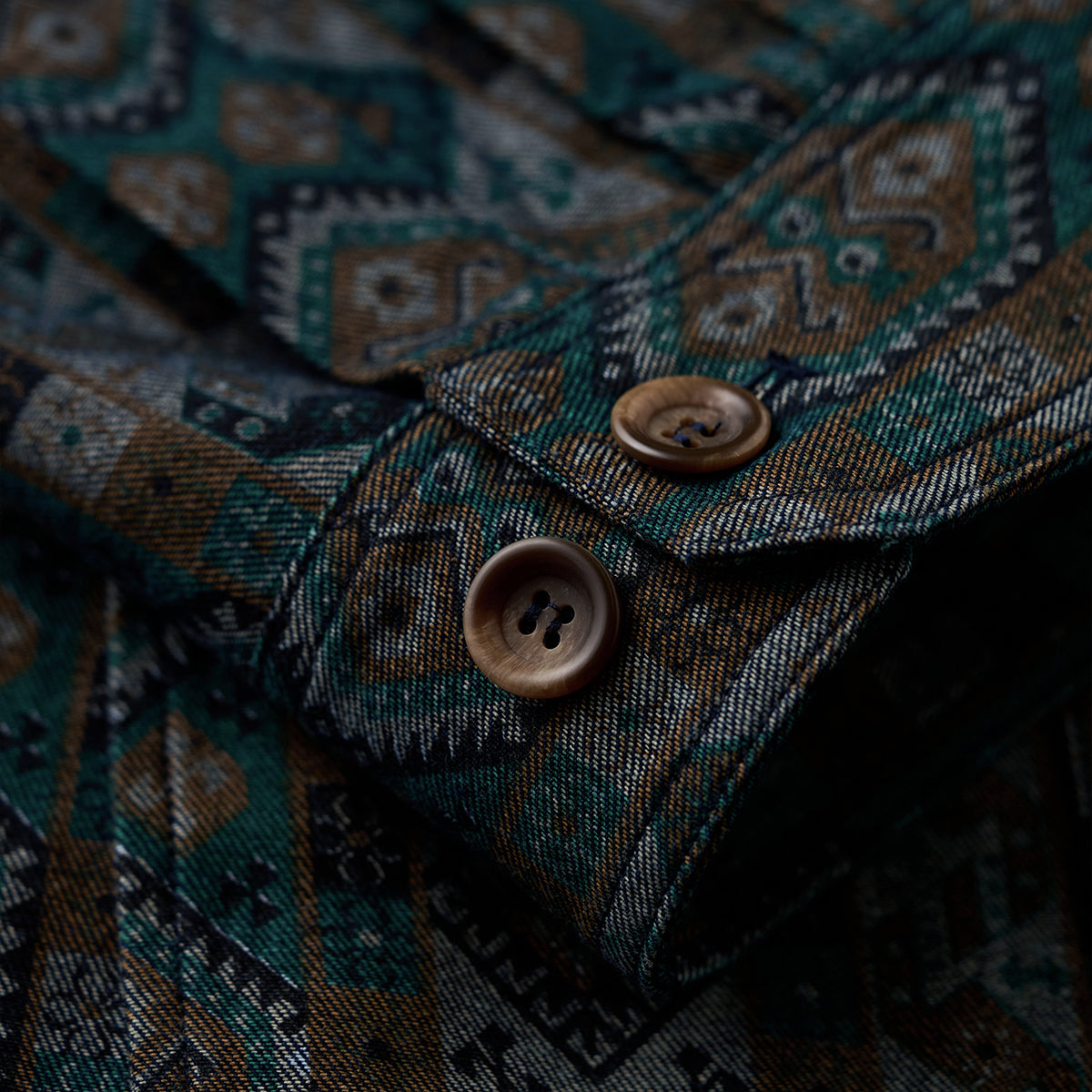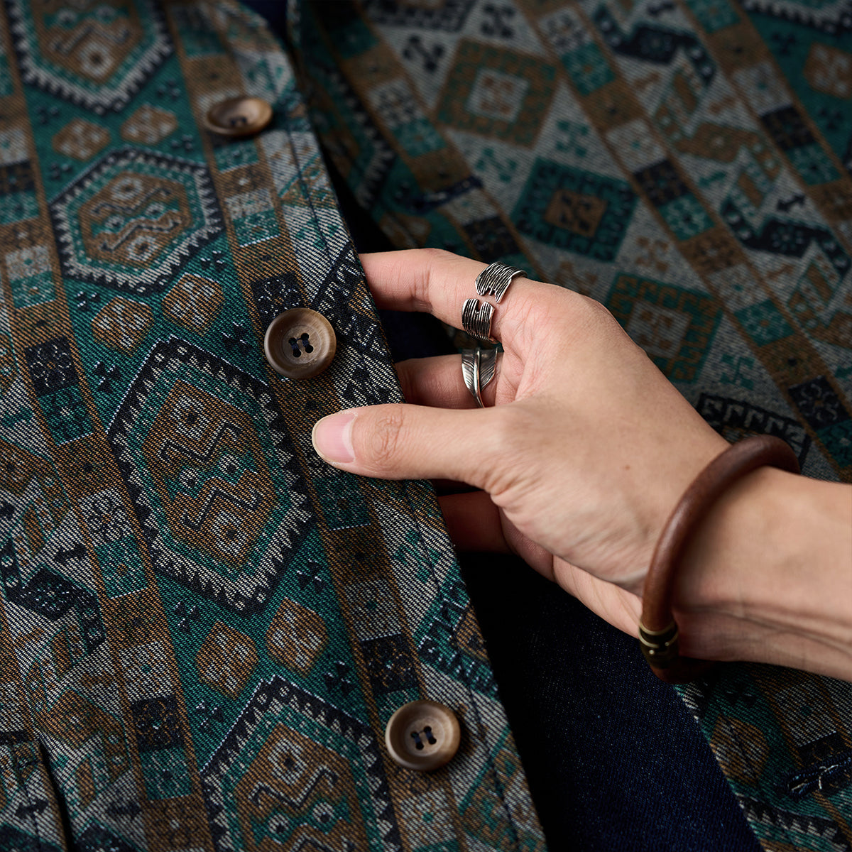 앞 버튼은 나무결 무늬로 에스닉한 분위기와 고급스러운 소재감을 살렸고, 소맷단 버튼까지 통일감을 더했습니다. 큰 플랫 포켓 2개는 실용적입니다
