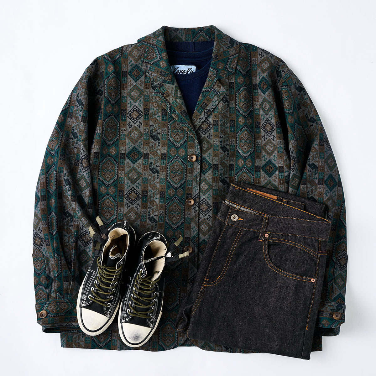 자켓과 슬랙스에 전체 패턴이 적용돼 통일감 있는 세트업 룩을 완성할 수 있으며, 화이트나 블랙 무지 티셔츠, 혹은 터틀넥 니트와 매치하면 패턴이 돋보입니다. 스니커즈나 로퍼, 특히 화이트나 브라운 계열의 슈즈와 잘 어울립니다.