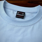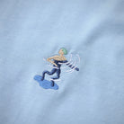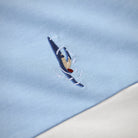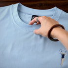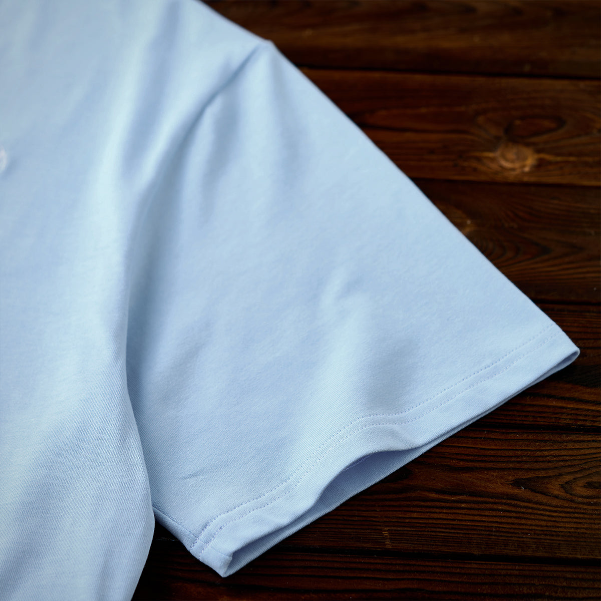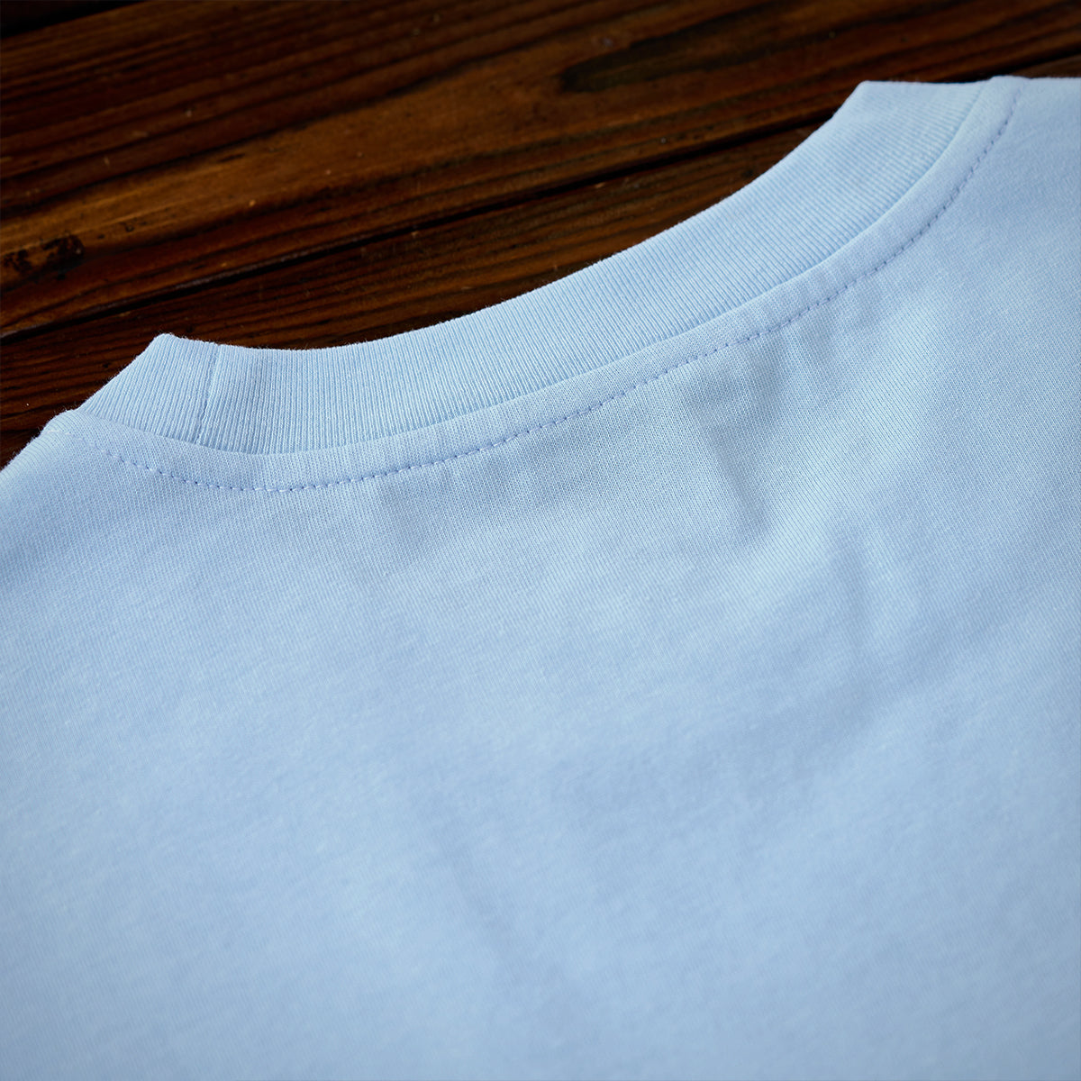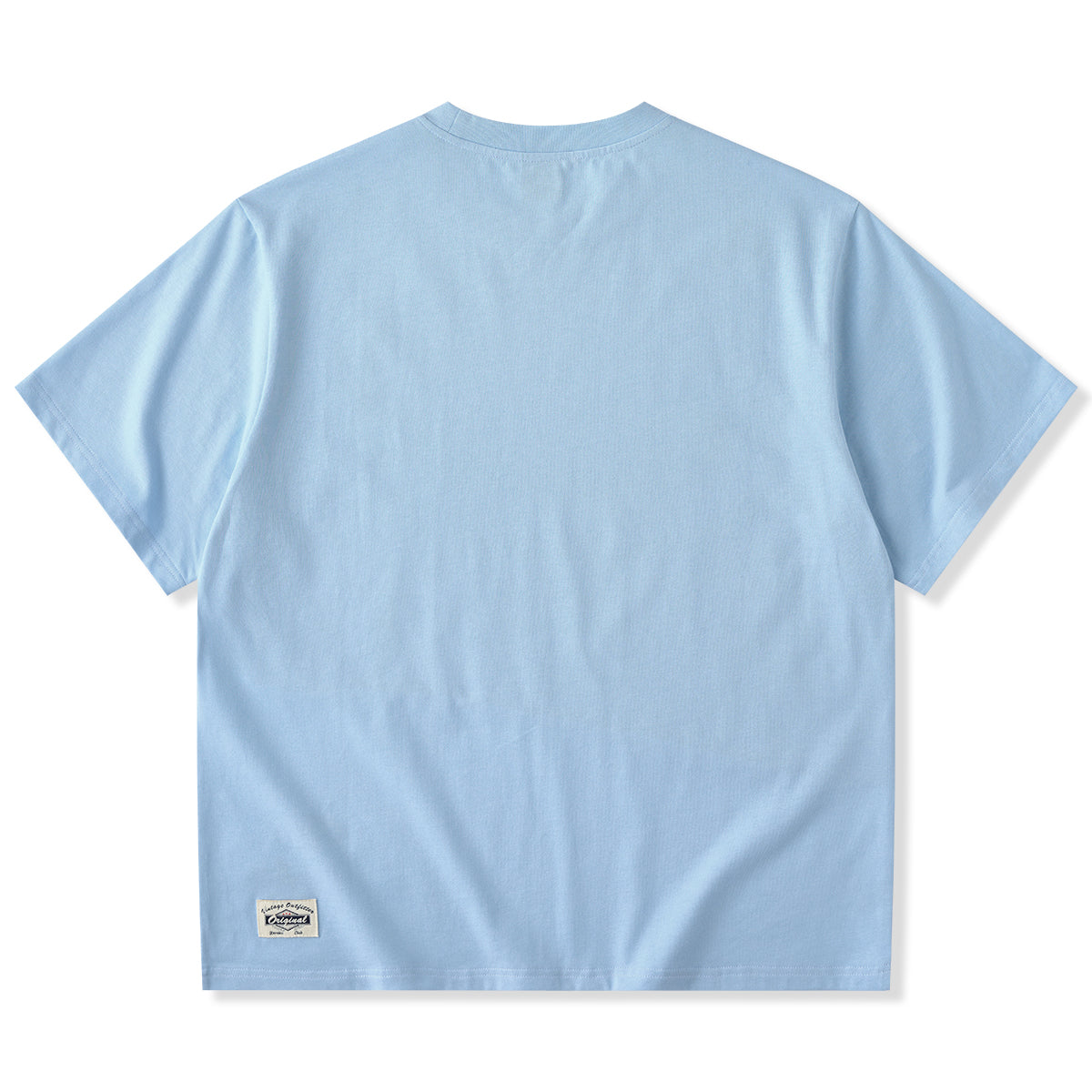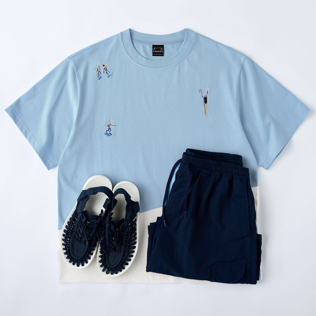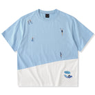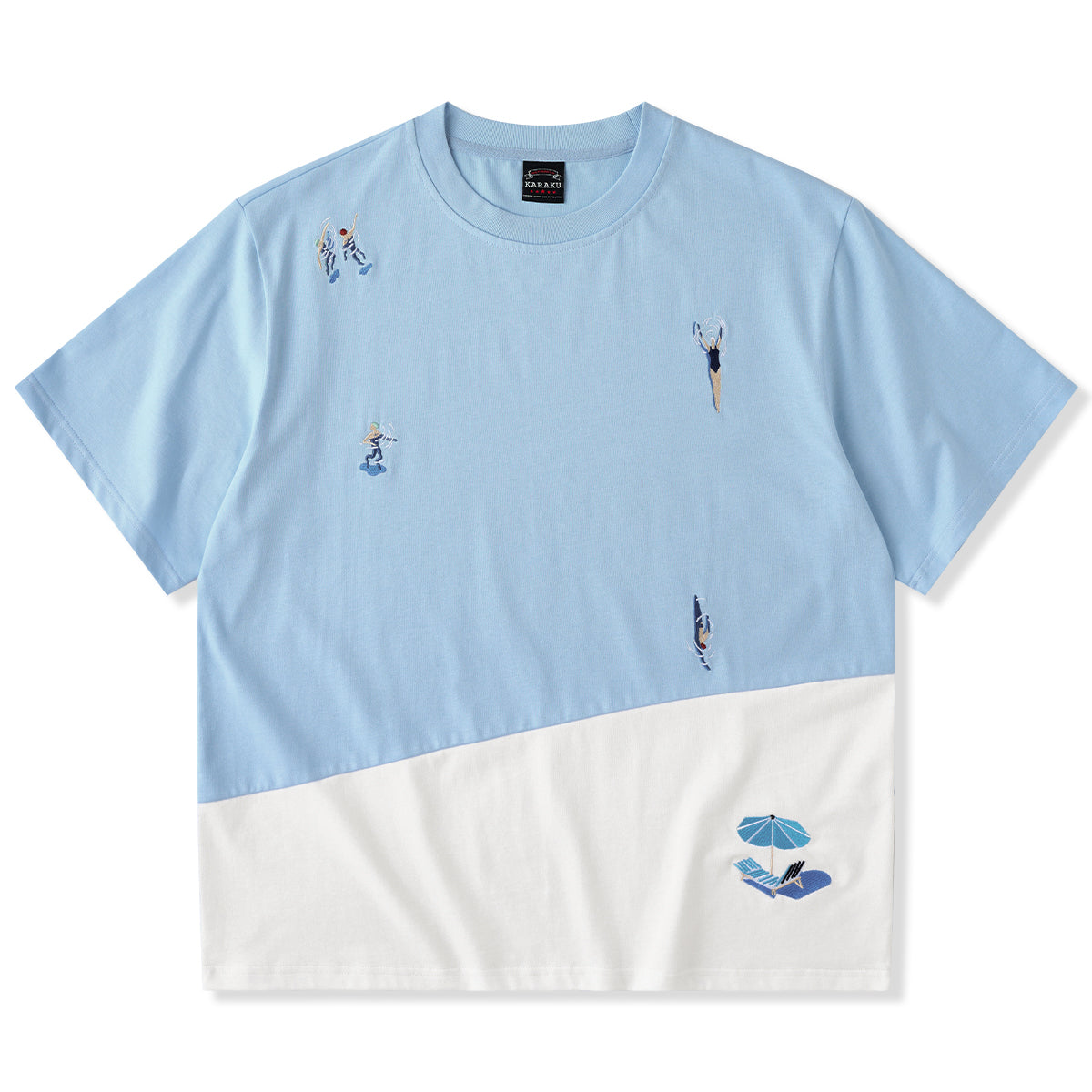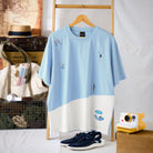 상의 절반은 연한 스카이 블루, 하반부는 화이트로 나누어진 투톤 컬러의 티셔츠로, 바닷가와 여름 하늘을 떠올리게 하는 상쾌한 분위기를 선사합니다.