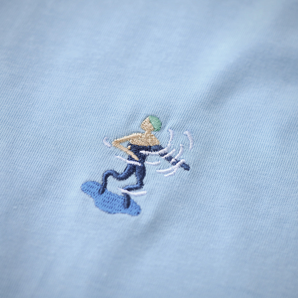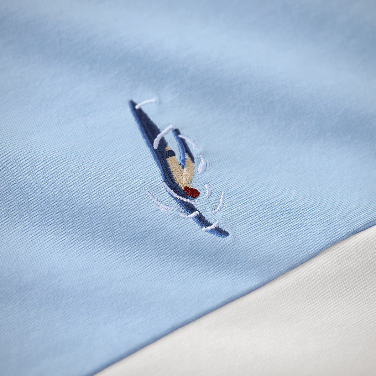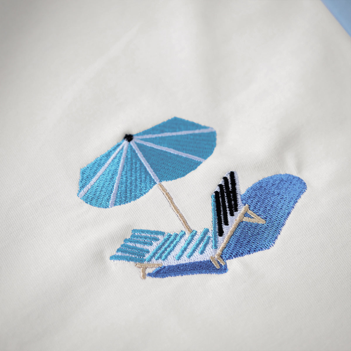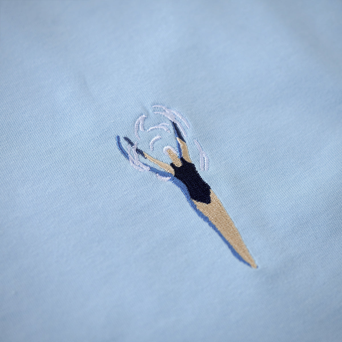 앞면에는 ‘헤엄치는 사람’과 ‘양산’ 등 자수가 섬세하게 배치되어 상쾌하고 우아한 느낌을 주며, 뒷면은 깔끔한 스카이 블루 컬러로 심플하게 디자인되었습니다.