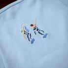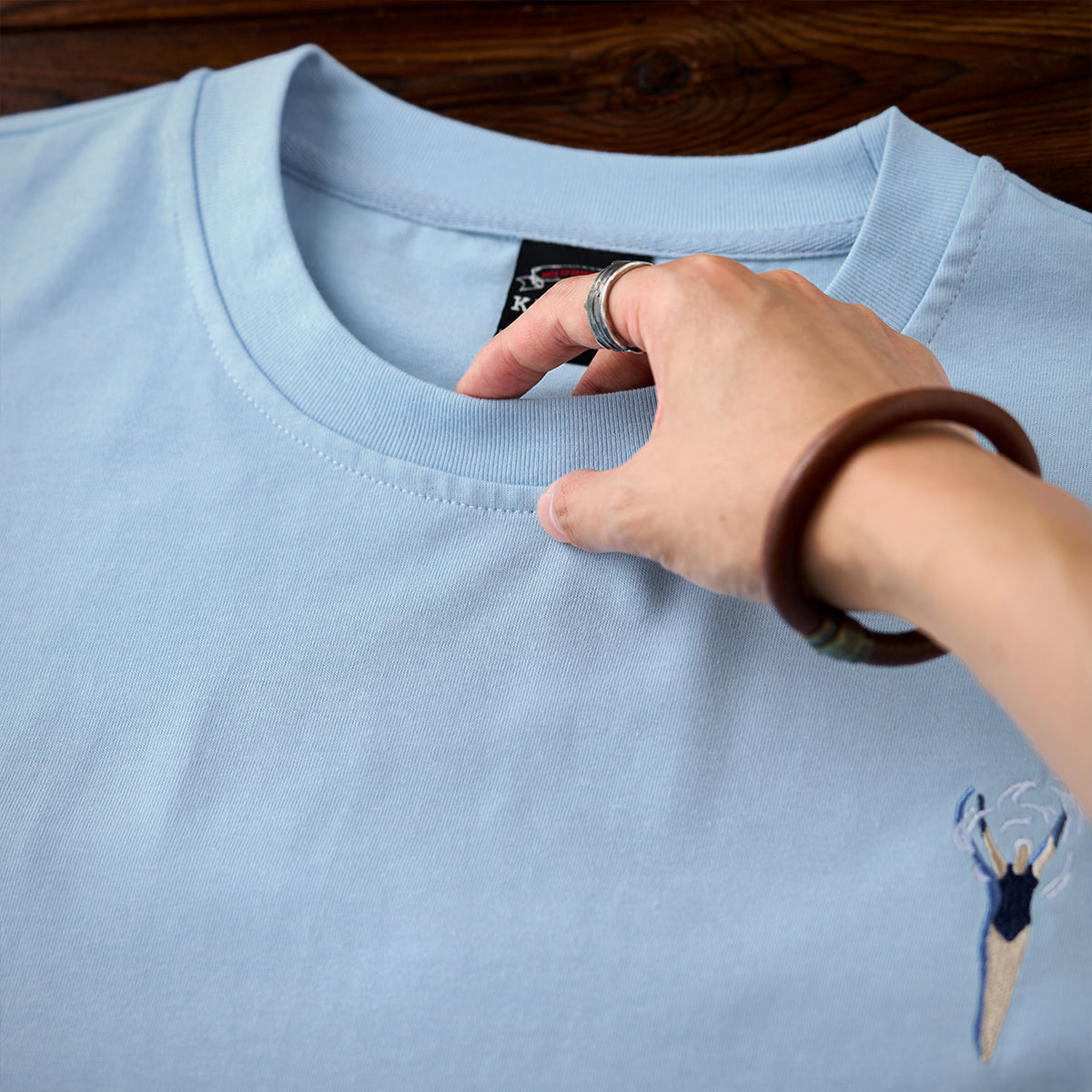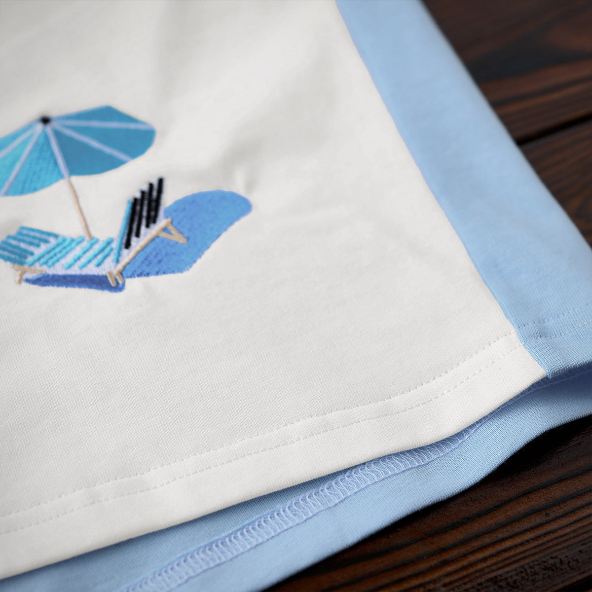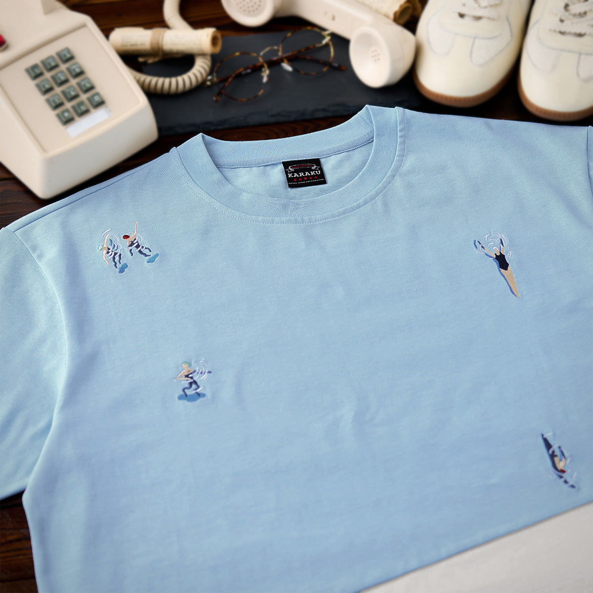 앞면에는 ‘헤엄치는 사람’과 ‘양산’ 등 자수가 섬세하게 배치되어 상쾌하고 우아한 느낌을 주며, 뒷면은 깔끔한 스카이 블루 컬러로 심플하게 디자인되었습니다.