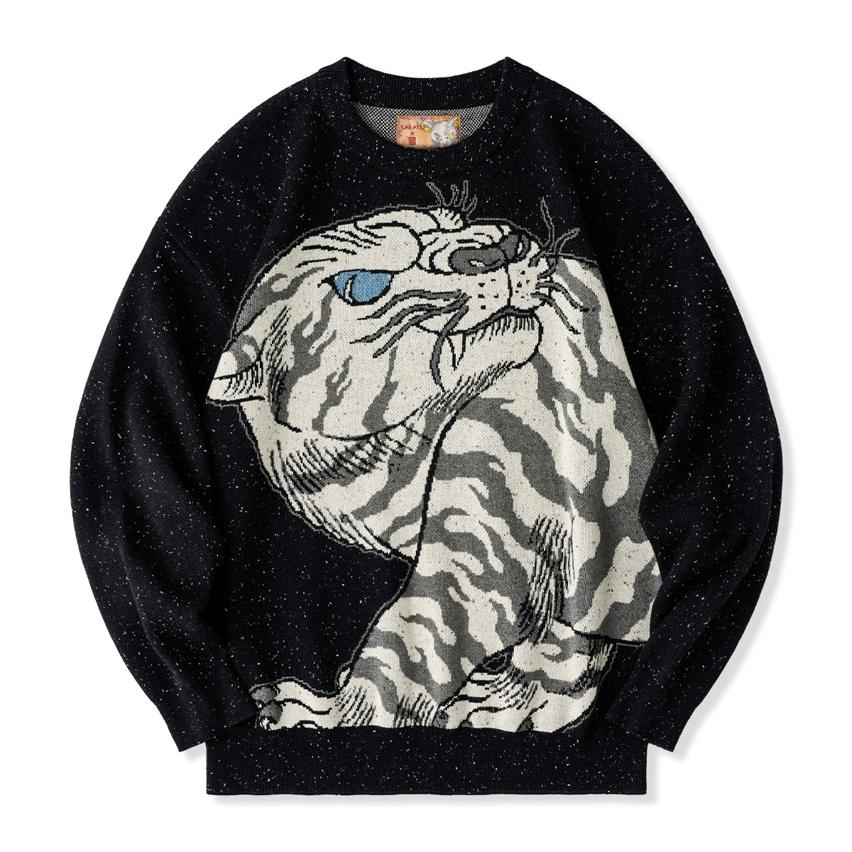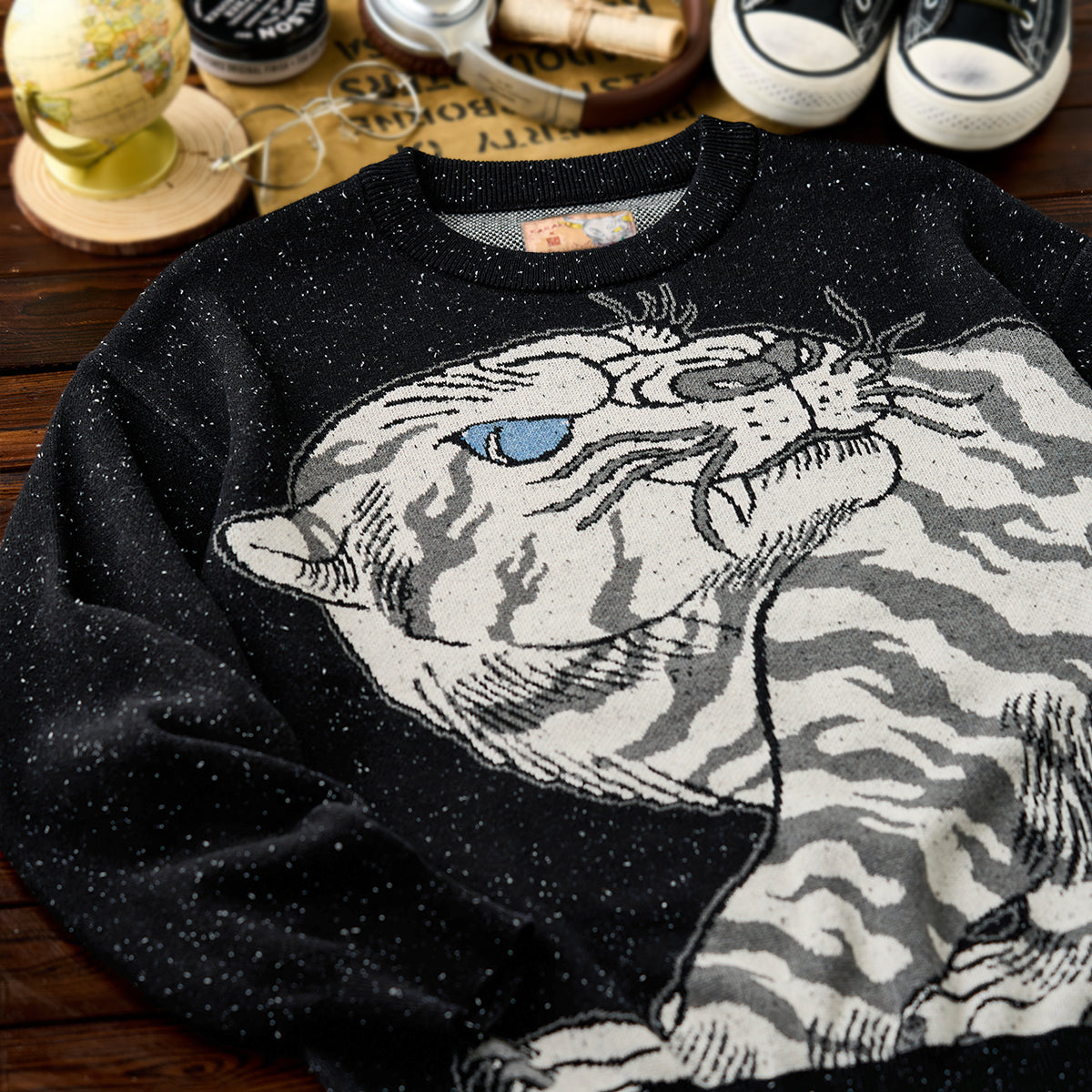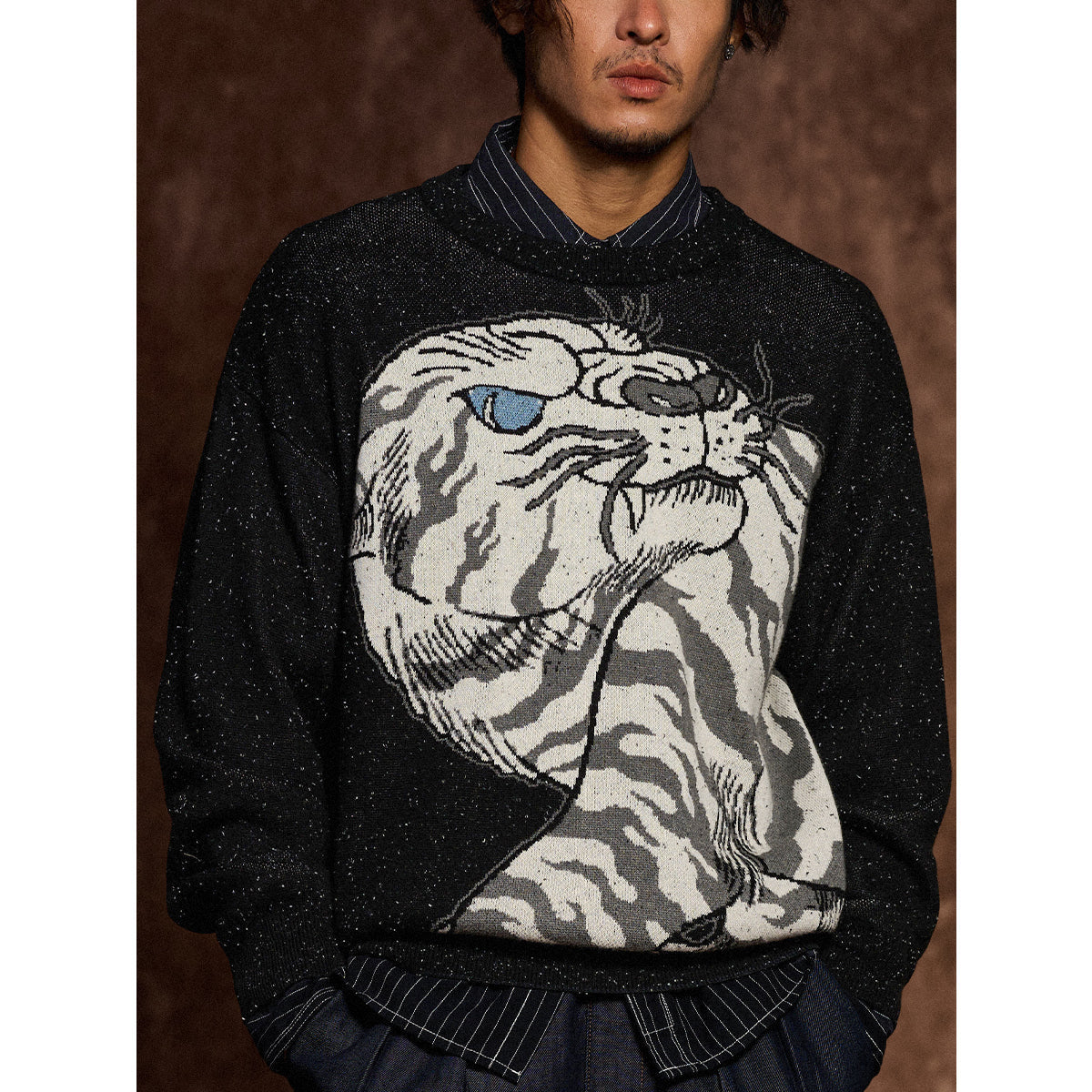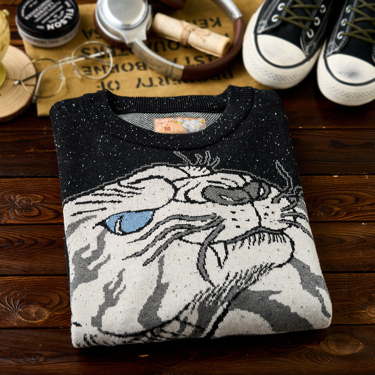 하얀 줄무늬가 특징인 ‘백호(白虎)’를 섬세한 자카드 짜임으로 구현했습니다. 부드러운 멜란지 니트 위 입체적인 짜임이 깊이와 음영을 더해, 마치 예술 작품처럼 눈길을 사로잡습니다.