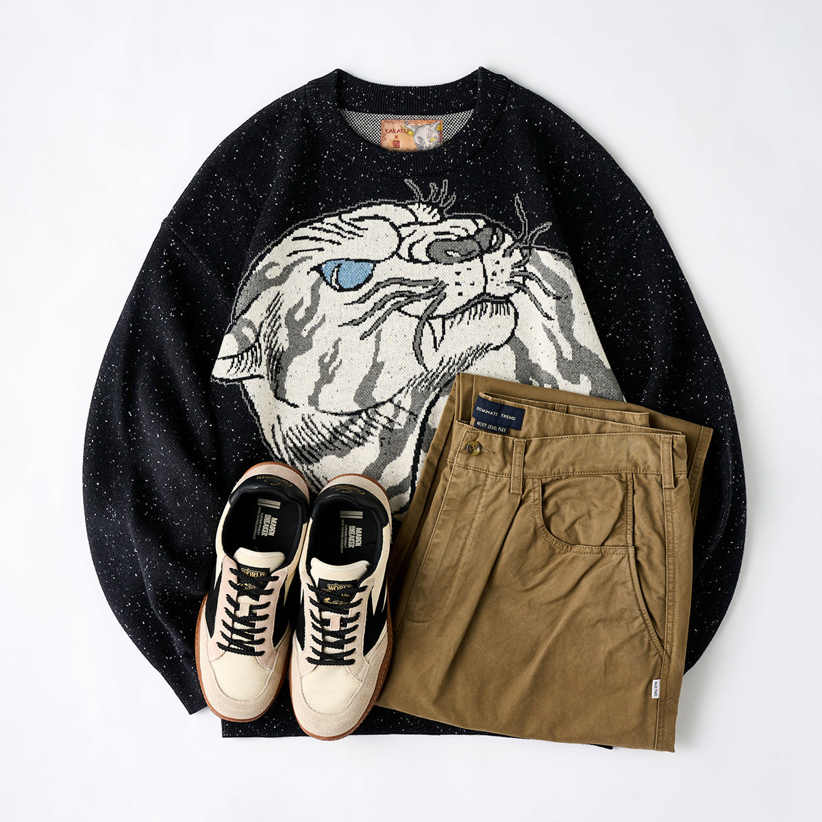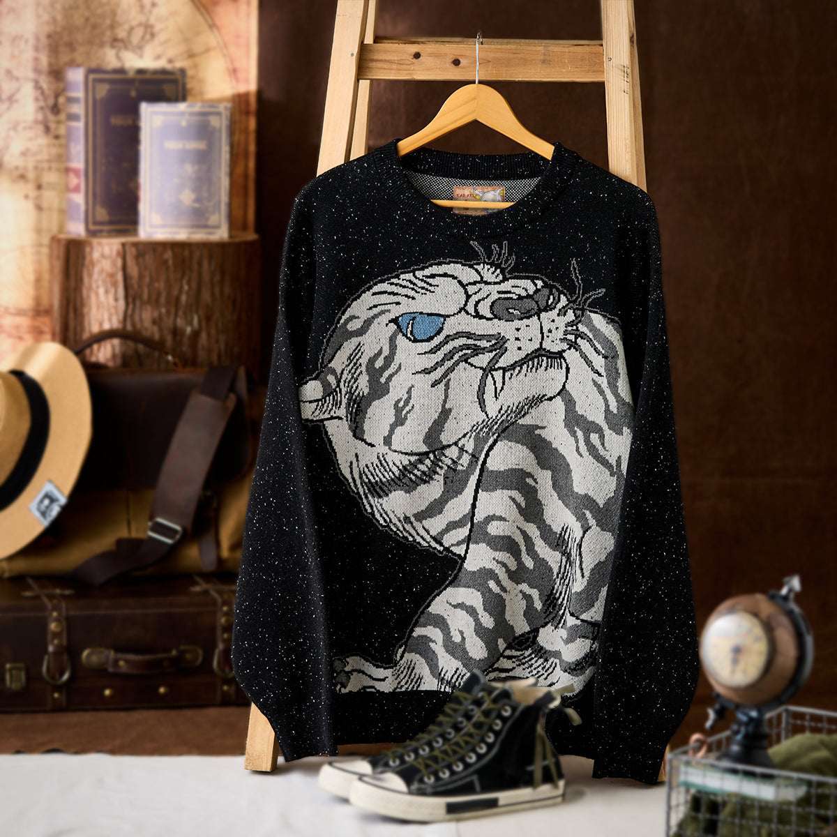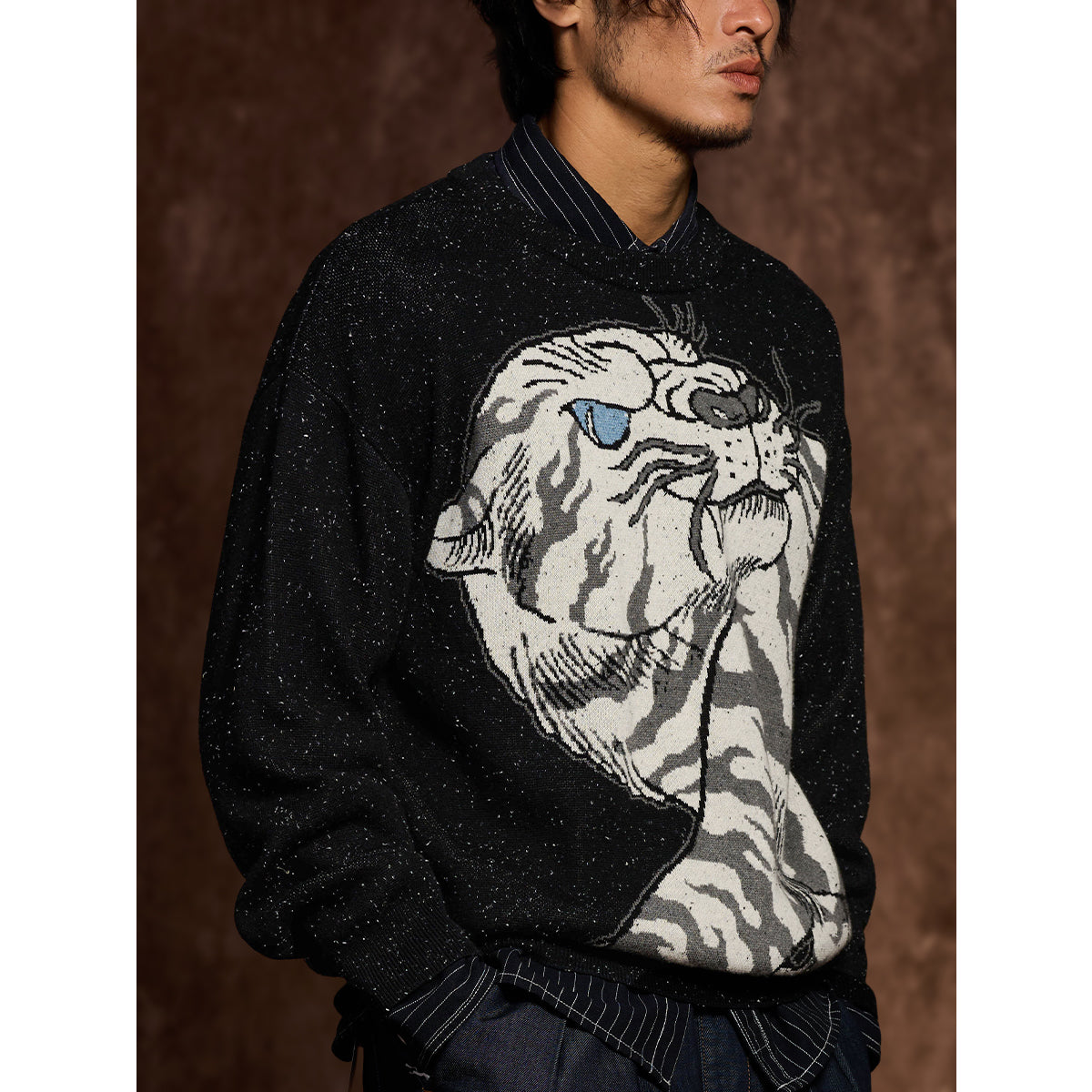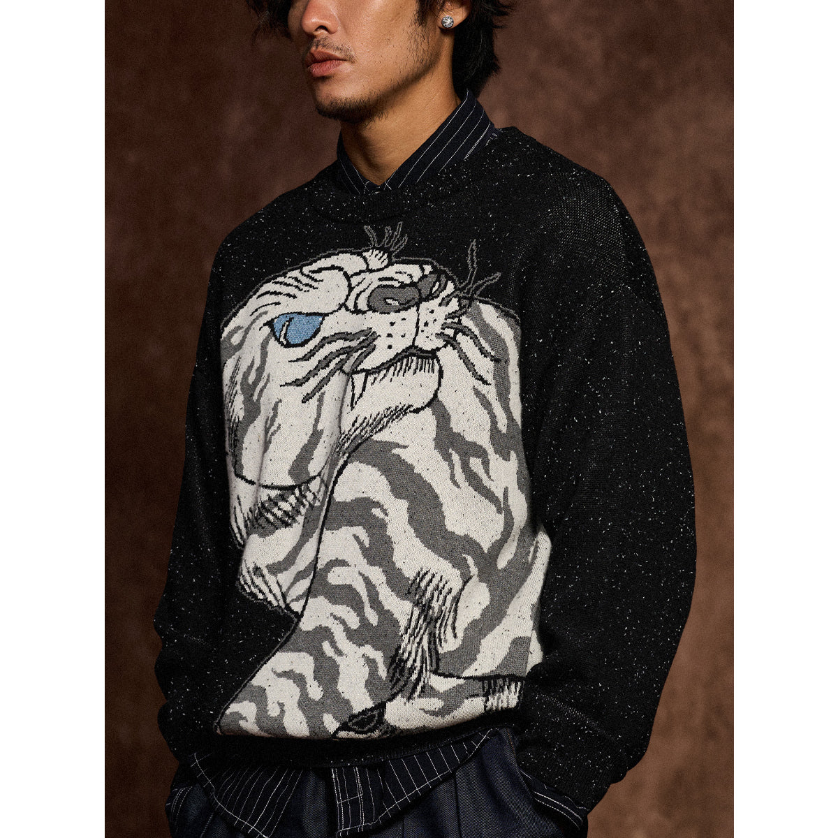 하얀 줄무늬가 특징인 ‘백호(白虎)’를 섬세한 자카드 짜임으로 구현했습니다. 부드러운 멜란지 니트 위 입체적인 짜임이 깊이와 음영을 더해, 마치 예술 작품처럼 눈길을 사로잡습니다.